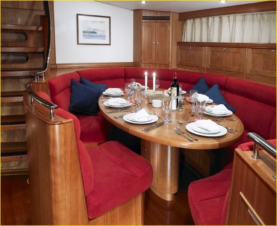 During her refit, DARK STAR was rebuilt from bare aluminium hull. Her interior is finished mainly in cherry wood, with light coloured deck heads and varnished floors.