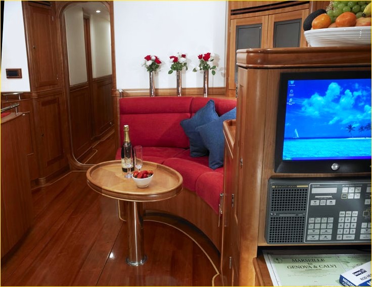 The main saloon has a very practical layout, both for service and comfort, and for safety at sea. There is a dining area to port and seating to starboard, with easy access to a drinks fridge and an ice-maker. Also to starboard is a navigation station with its own DELL computer. On the centre line is a wide access to the cockpit. The crew area located aft is well isolated, with a mess area adjacent to the galley and their own deck access.