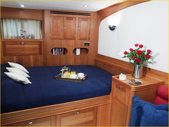 Sailing yacht DARK STAR (ex Buzzy B) can sleep up to 8 guests, with accommodation in four guest cabins. Her lifting keel allows her access to shallow anchorages and bays, whilst giving superior performance upwind, along with a fully battened main and Spectra head sails. Guests can relax in the Centre cockpit, whilst access to the water is made easier with the fold out transom arrangement. Furthest forward is the Owner´s Stateroom with a double bed, sofa seating and an en-suite shower room. Moving aft there is 1 twin cabin to starboard with upper/lower berths, and then 2 x double guest cabins, all with en-suite shower rooms.