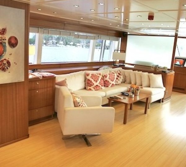S/Y LEVANTIN has a spacious and light interior, the décor features light wood floors throughout with warm toned wood walls and light headlining, the soft furnishings are of a neutral colour making the entire area feel welcoming. The salon is located in the large pilot house which gives wonderful views through the generous sized windows; there are 2 seating areas with both a drinks table and a dining table.