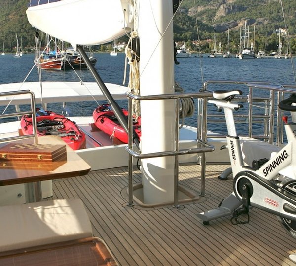 Tenders and toys onboard the LEVANTIN sailing yacht include a Novurania 500, 5m/16.4 ft., 165 HP Volvo Engine 1 X Zodiac 3.1m inflatable dinghy, 15 HP Yamaha Outboard mountain bikes & spin bike Kayak 2.5m, single person x 2, Waterski, Waterski board, 2 x inflatable rings, Scuba diving equipment full gear x 4, Bauer Scuba diver compressor. Rendezvous diving only. Entertainment, Satellite & Communication Satellite TV Antenna, Satellite Phone & Internet, Land Base Wi-Fi internet 41? LCD TV on 2 owners and VIP and 1 crew mess, 82 cm LCD TV in main salon with up/down mechanism, Sony main music station with combined DVD player I-POD Dock, amplifier with Bose cube or ceiling speaker for salon, 2 external speakers for aft, 2 external speakers for fwd.