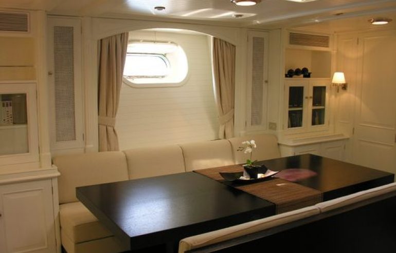 The superyacht’s accommodation includes three large guest cabins. The full width owner’s stateroom is the jewel in the crown with its adjoining study and large shower room.