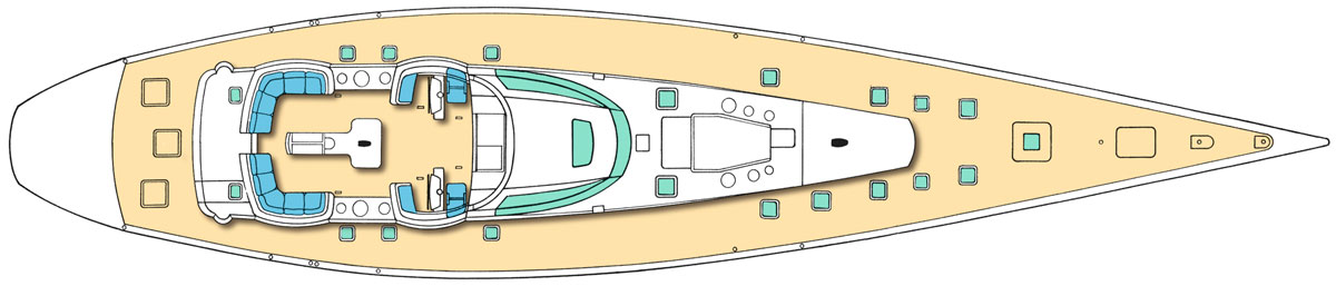 Yacht designer Greg Elliot designed her with an impressive beam, even for her length, at 29ft 6 in (9.00 m). This healthy width helps to facilitate interior space as well as deck space in the mid section of the yacht.