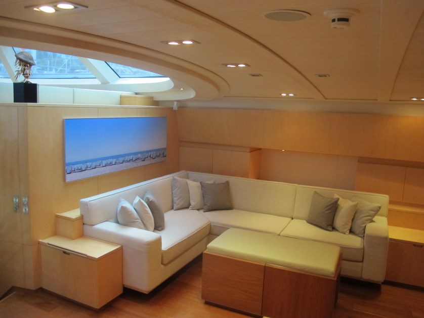 The interior is detailed by Rhoades Young Design. The concept is to achieve a calm and restful interior using minimal detailing in Birchwood, brushed stainless steel and oiled teak. The furniture is finished in matt varnished rotary cut birch with limed birchwood beams to the overhead. The bulkheads have kick recesses with a stainless steel trim. The floors are made of oiled teak with wengé lines between the floorboards.