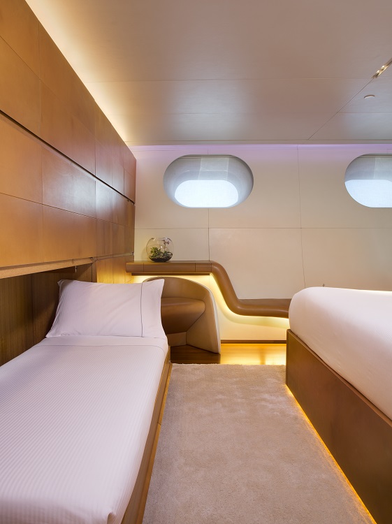 The original design brief of S/Y Panthalassea called for a seamless relationship between the exterior and interior, which has been surpassed. Throughout the whole interior immaculate attention has been paid by the designers to penetration of light, lighting and the keeping of the spaces airy and light. Natural daylight filters through PANTHALASSEA's interior thanks to her large windows on the main deck, her unique skylights that channel light from the sundeck and oversized portholes on the lower deck. Her gracefully flowing oval staircase, wrapped in translucent acrylic, also brings in daylight as well as connects all the different levels.