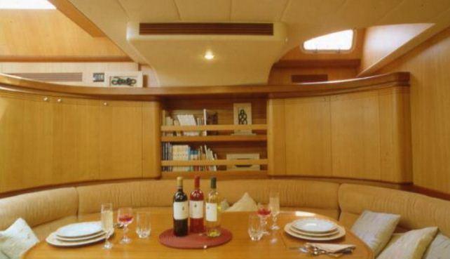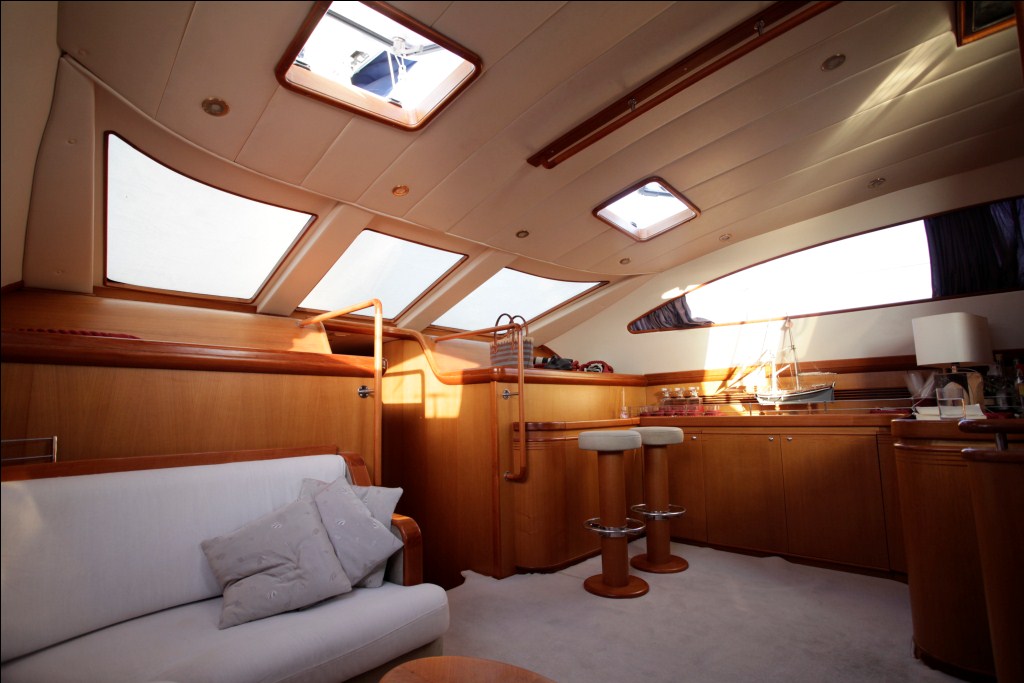 Franchini 75 sailing yacht ROMEO & Co boasts a stylish interior salon, all in light wood. The pilothouse features large windows and a comfortable lounge and the lower salon features another u shaped settee and dining table. The dining area leads to the fully equipped kitchen and the crew area.