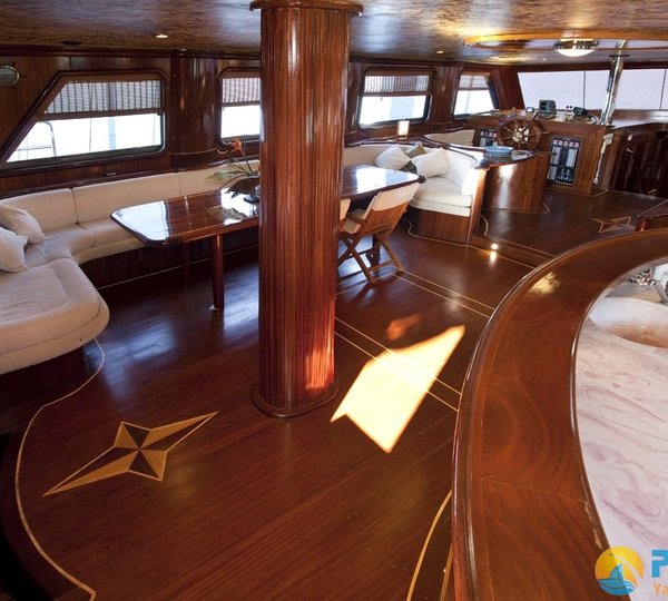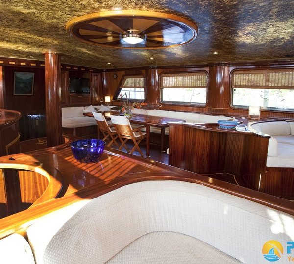 Charter yacht S DOGU boasts quality mahogany wood throughout, including her pristine varnished hull. The salon has an elegant atmosphere with fine wood inlays, beautifully contrasting the warm mahogany. The soft furnishings are a neutral tone of fine textures. A formal dining table and 2 lounge areas give ample space for all her guests to relax. Watch a movie on the flat screen TV, play your favourite music on the audio system, or enjoy a cold beverage from the complete wet bar, the yacht is ideal for entertaining.