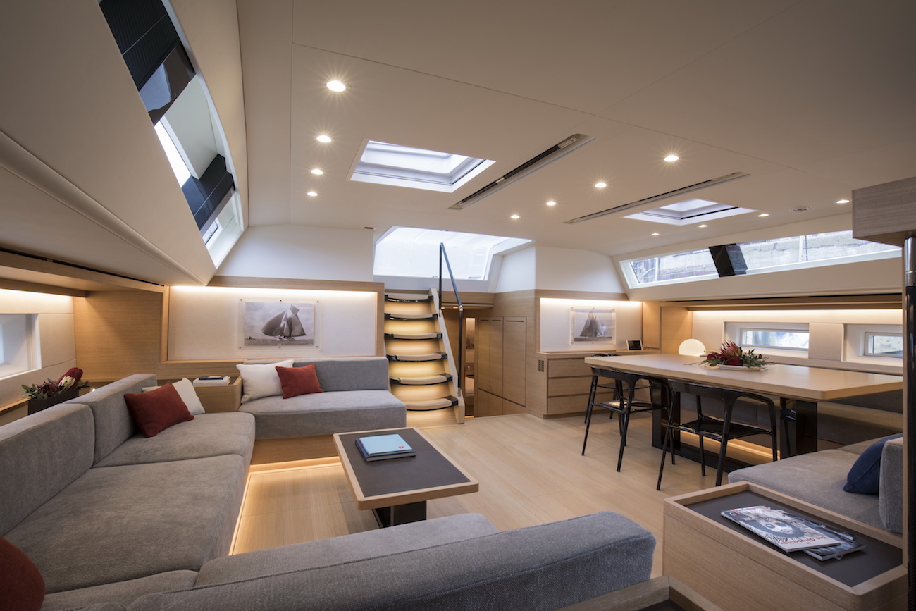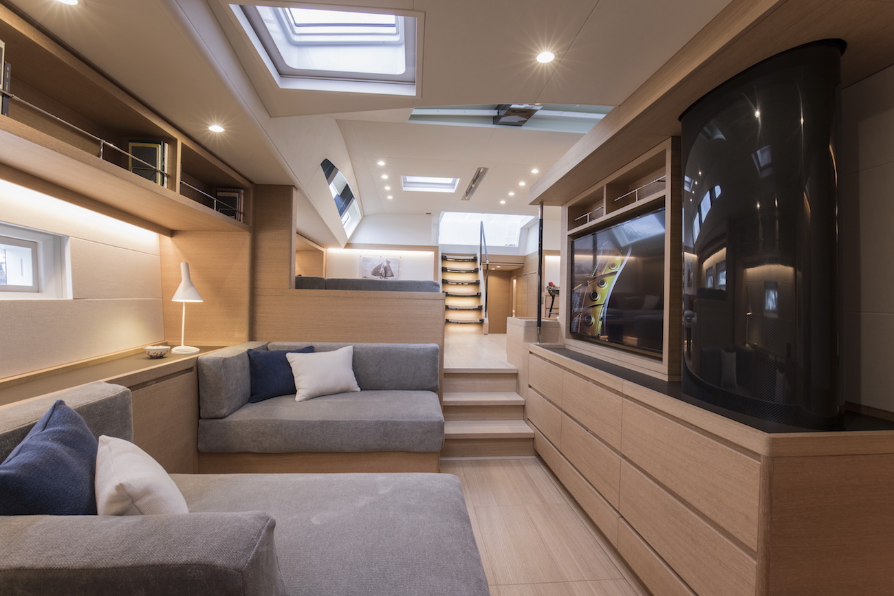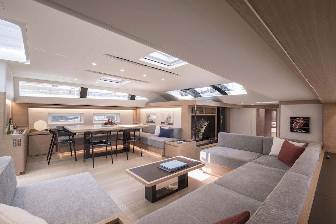 Descend from the cockpit into the air-conditioned salon where skylights and windows along the port and starboard sides illuminate the interior. Pale oak panelling emphasises the interior space, within which there is a port-side formal dining area to seat up to eight guests, while on the starboard side the firm-fitting sofas create a casual lounge ideal for guests to chat over drinks.