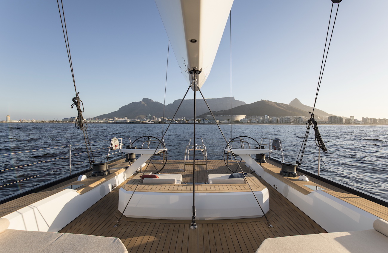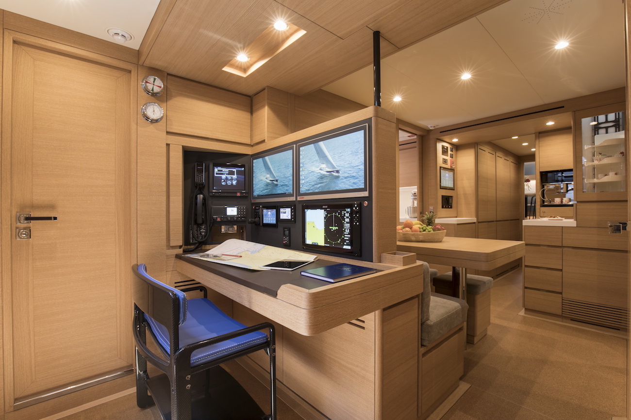 The above deck layout places the helm station towards the aft to leave plenty of room for an expansive cockpit with two tables, a cool box, two fridges and a dumbwaiter for quick and efficient service straight to the galley. Forward of the mast, there is a large clear space on the bow for sunbathing, observation and exercise.