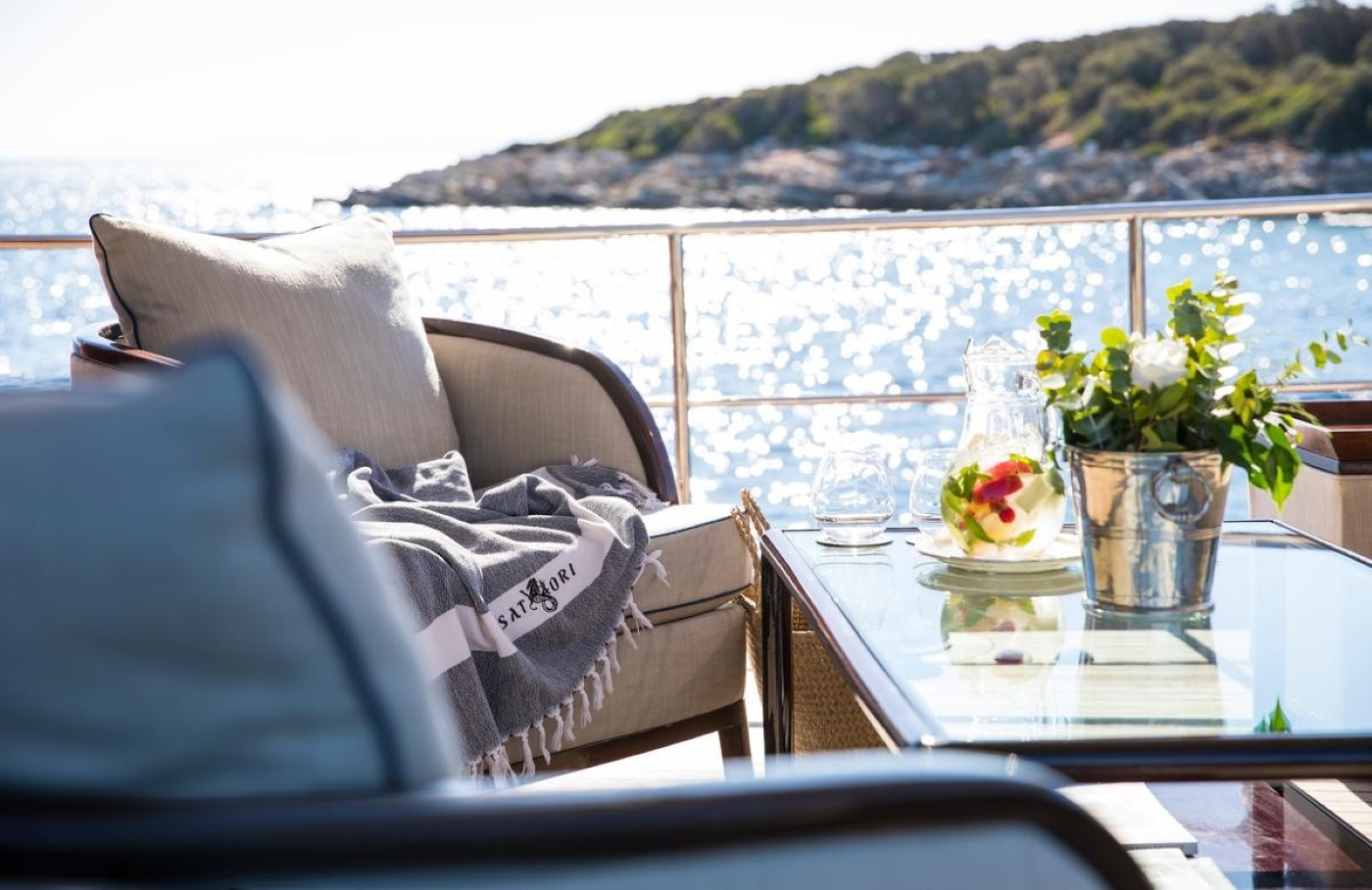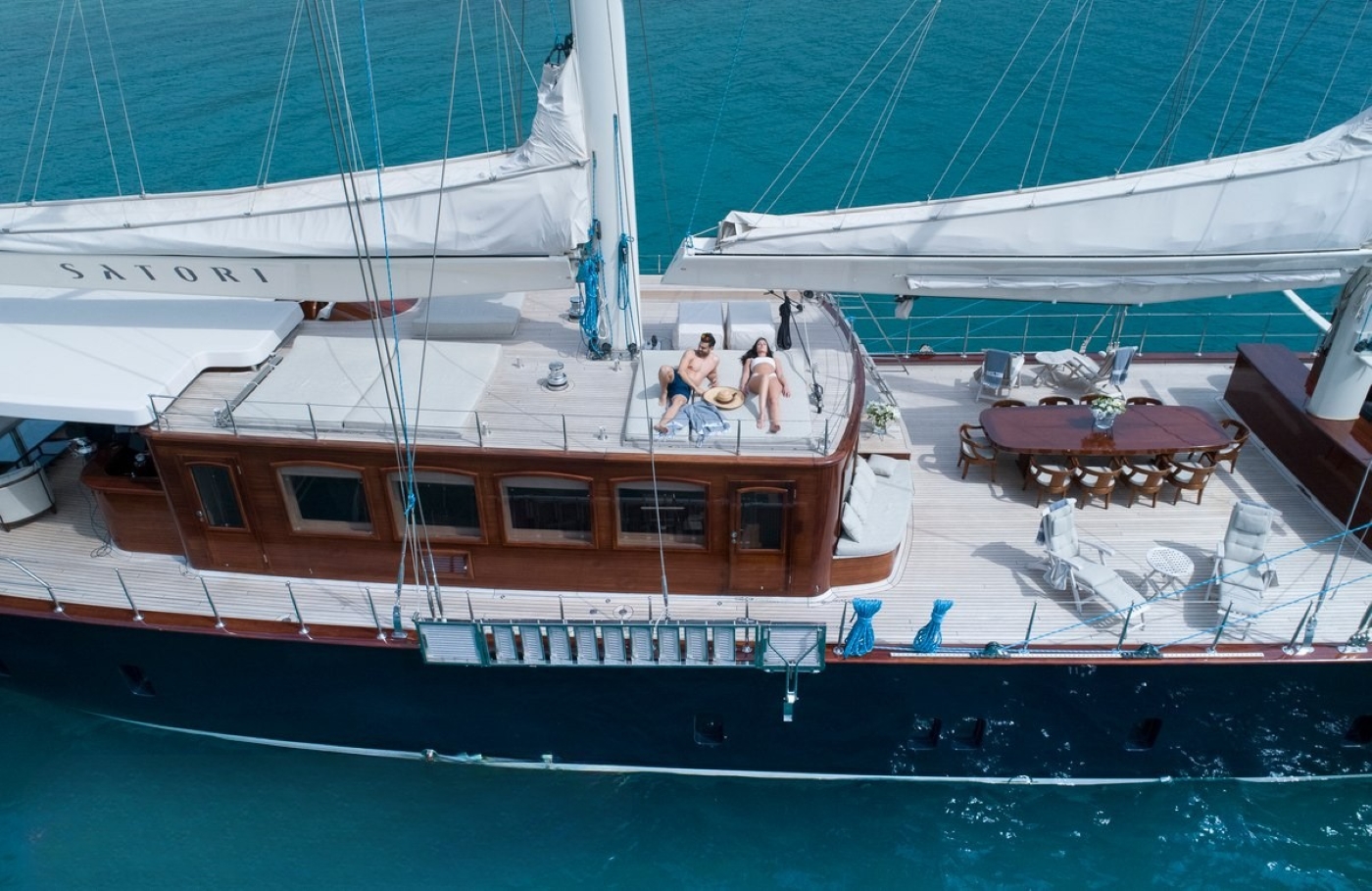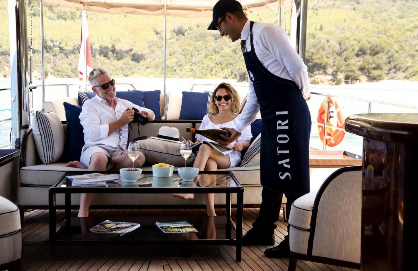 NOTABLE FEATURES for SATORI: Beautiful hull lines ~ Spacious teak decks ideal for relaxing ~ Contemporary interior decor ~ Alfresco dining ~ On deck cinema ~ Air-conditioning ~ Wifi ~ Open air cinema ~ Convertable Spa cabin