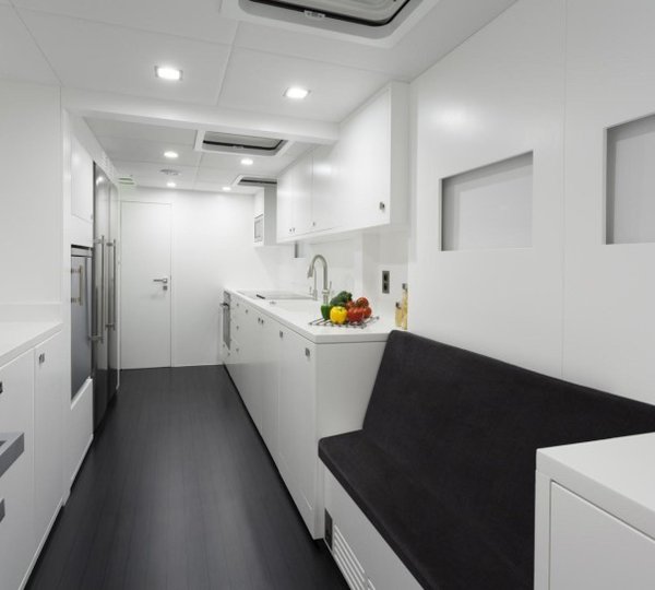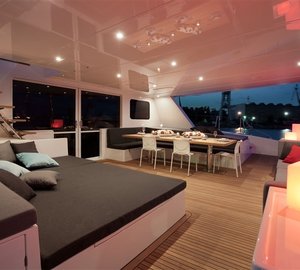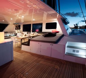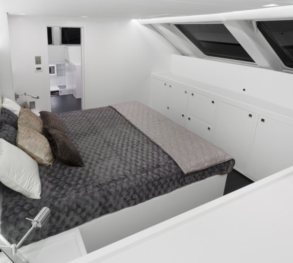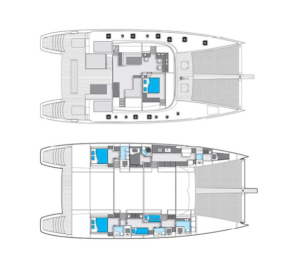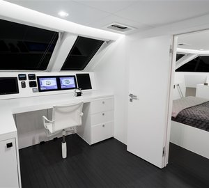 Luxury yacht Levante provides luxurious accommodation in two double cabins located in the forward section, two double cabins in the starboard hull, as well as one double and one bunk-bed cabin, which can be found in the port hull. All cabins feature private bathrooms and abundant storage. The interior of the main deck offers the galley and a dining area, while a mezzanine floor located in the midship boasts the internal helm station and lounge, providing access to the forward guest cabins and the flybridge. The large sun deck comprises the external helm station, wet bar, dining area and a huge sun pad, ideal for outdoor lounging in the sun. There is also an option to include a popular Spa Pool on the flybridge.