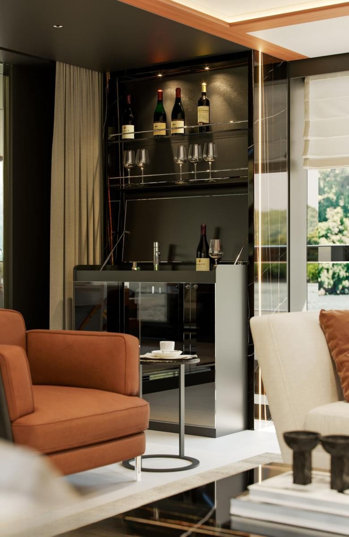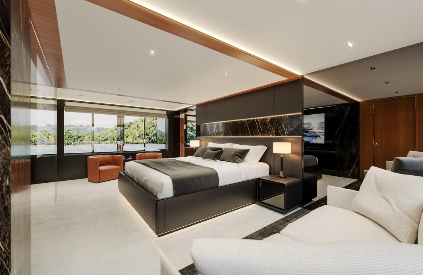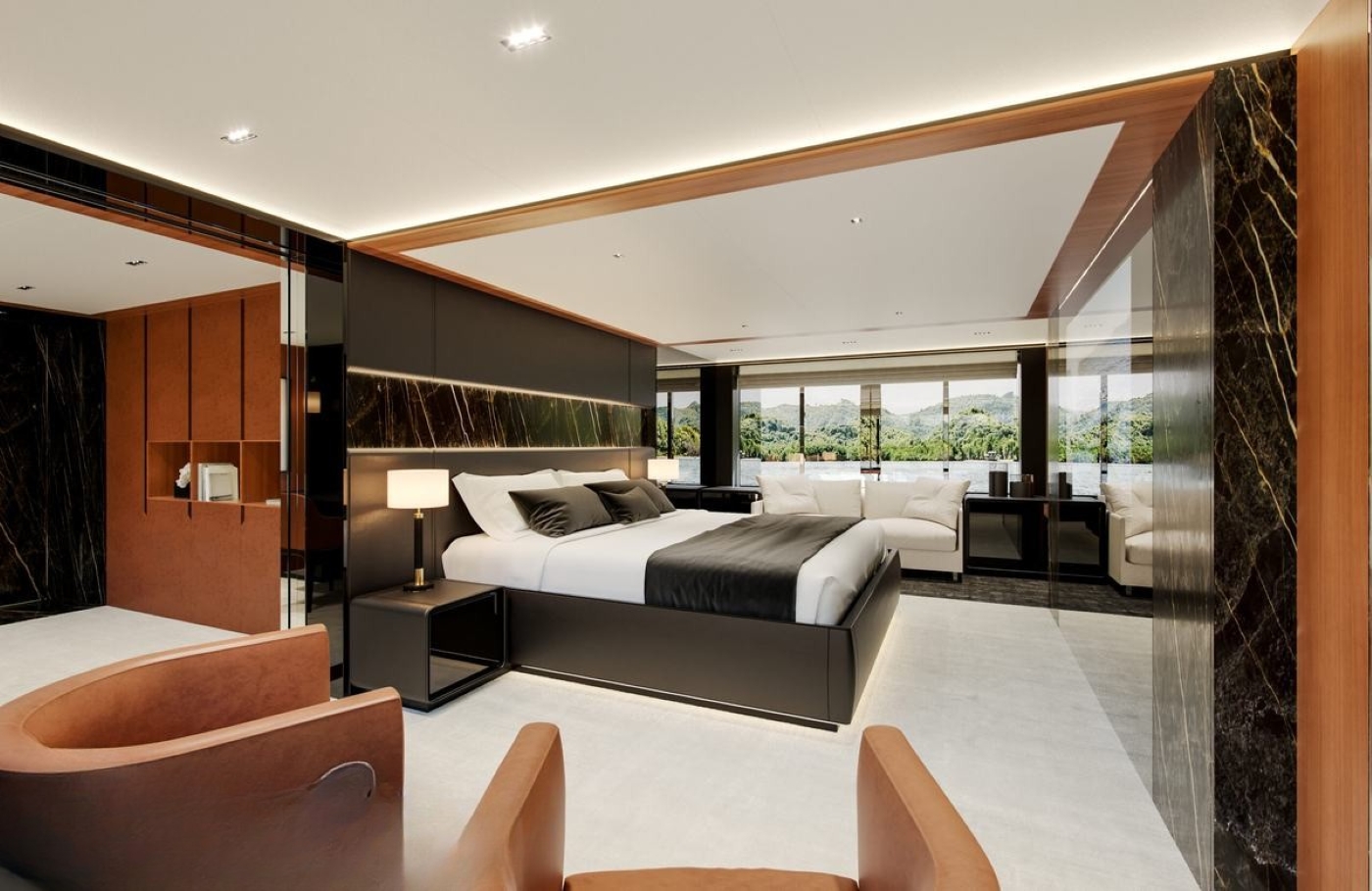 A private full-beam master suite on the main deck offers exceptional volume, complete with office, lounge seating and floor-to-ceiling glazing. Guest accommodations on the lower deck echo the same harmony of materials – fine wood panelling, polished black finishes, marble ensuite bathrooms – ensuring a consistent atmosphere of discreet luxury across all decks.