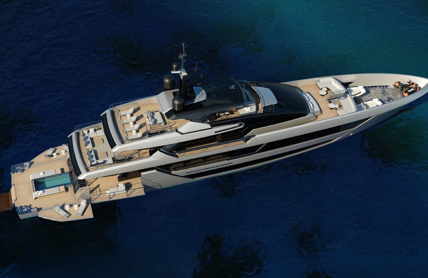 A continuous sweep of glazing wraps the main deck, while geometric upper-deck windows and polished steel details lend sophistication to the yacht’s profile.