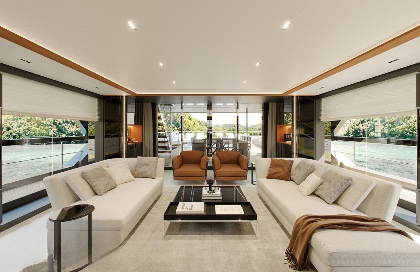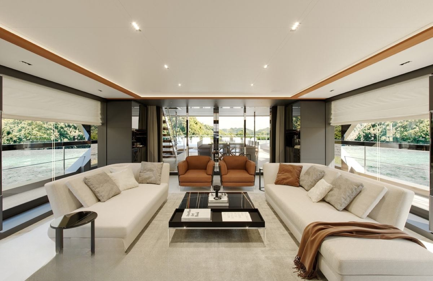 The interiors of SAIRU balance modern Italian flair with warmth and comfort. Expansive windows flood the main salon with light, creating a refined social space with lounge seating, low tables and a seamless connection to the aft deck. Neutral furnishings accented with darker woods and marble details provide understated elegance.