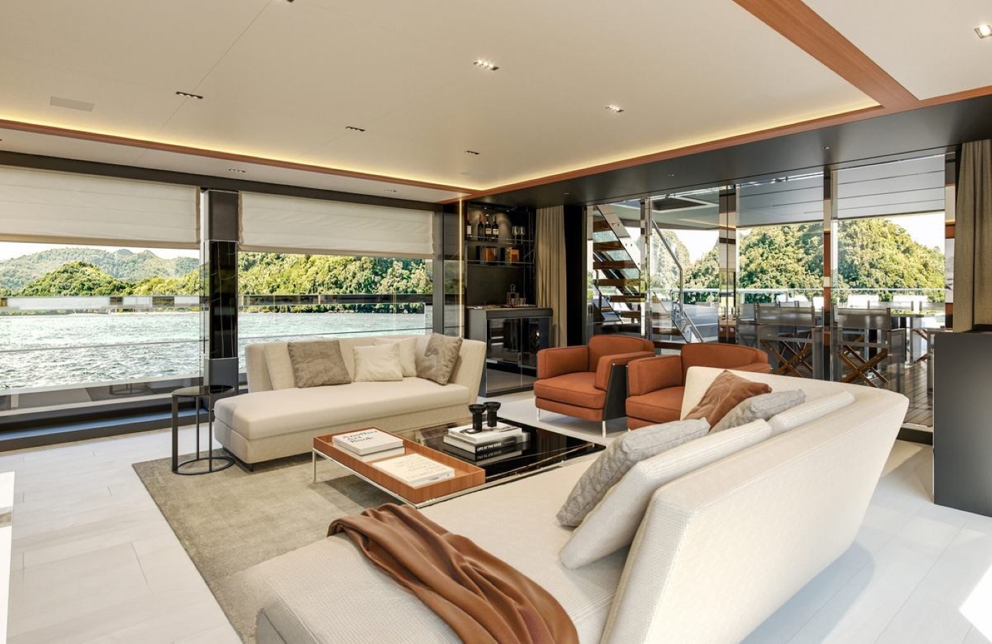 The main deck aft offers a convivial lounge with sofa seating, armchairs and a fully stocked bar, ideal for relaxed entertaining. Rising higher, the upper decks provide panoramic lounges and al fresco dining zones, while the sun deck creates a private retreat with sunbathing areas and spa pool.