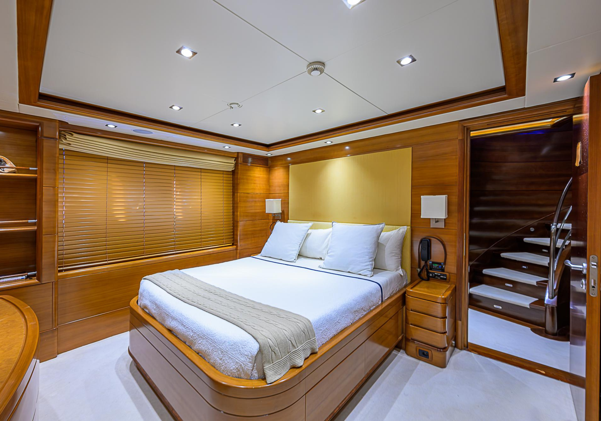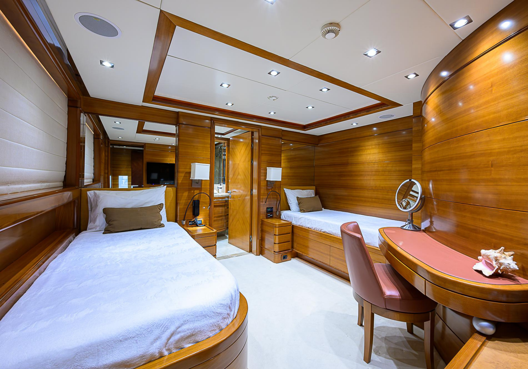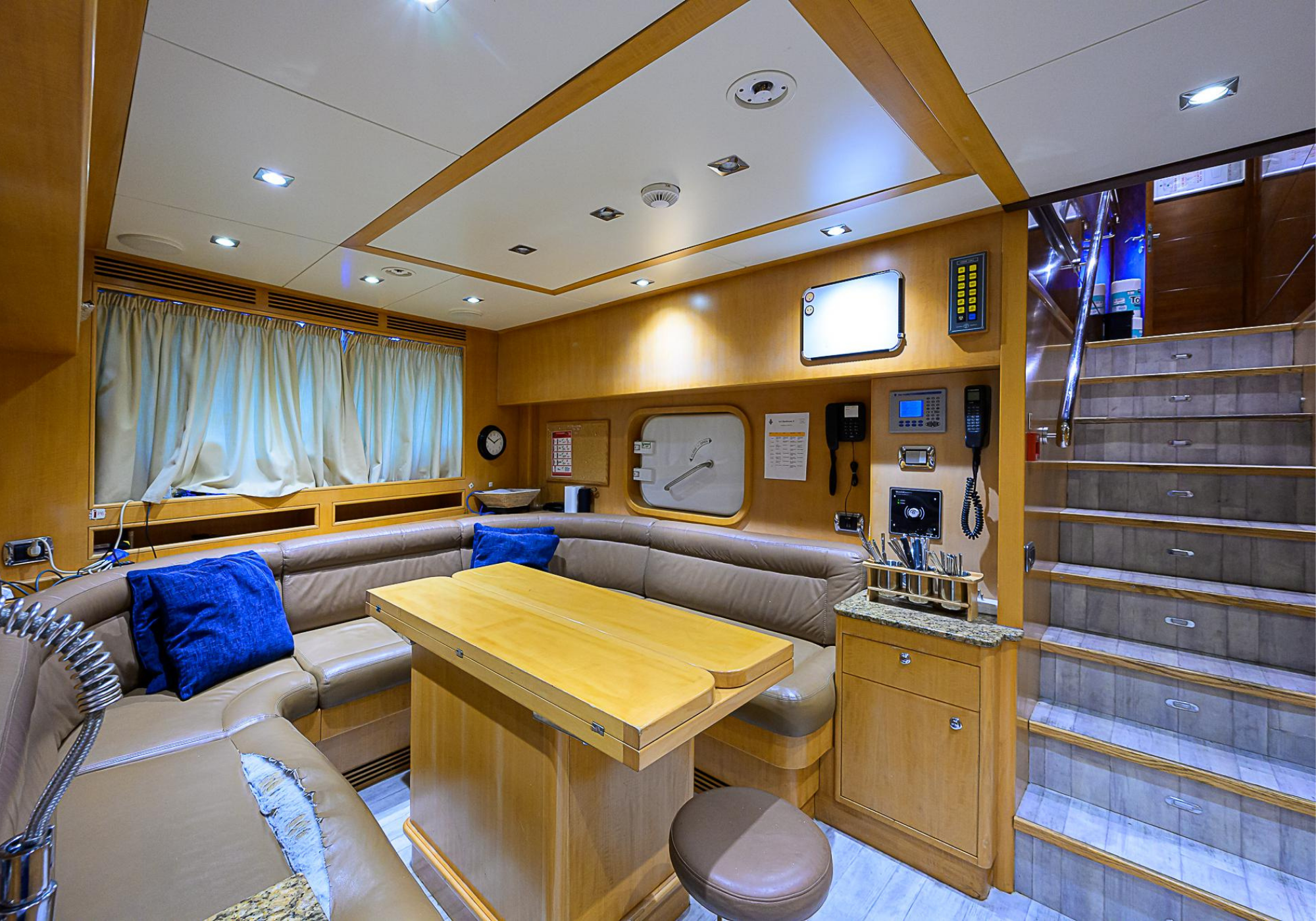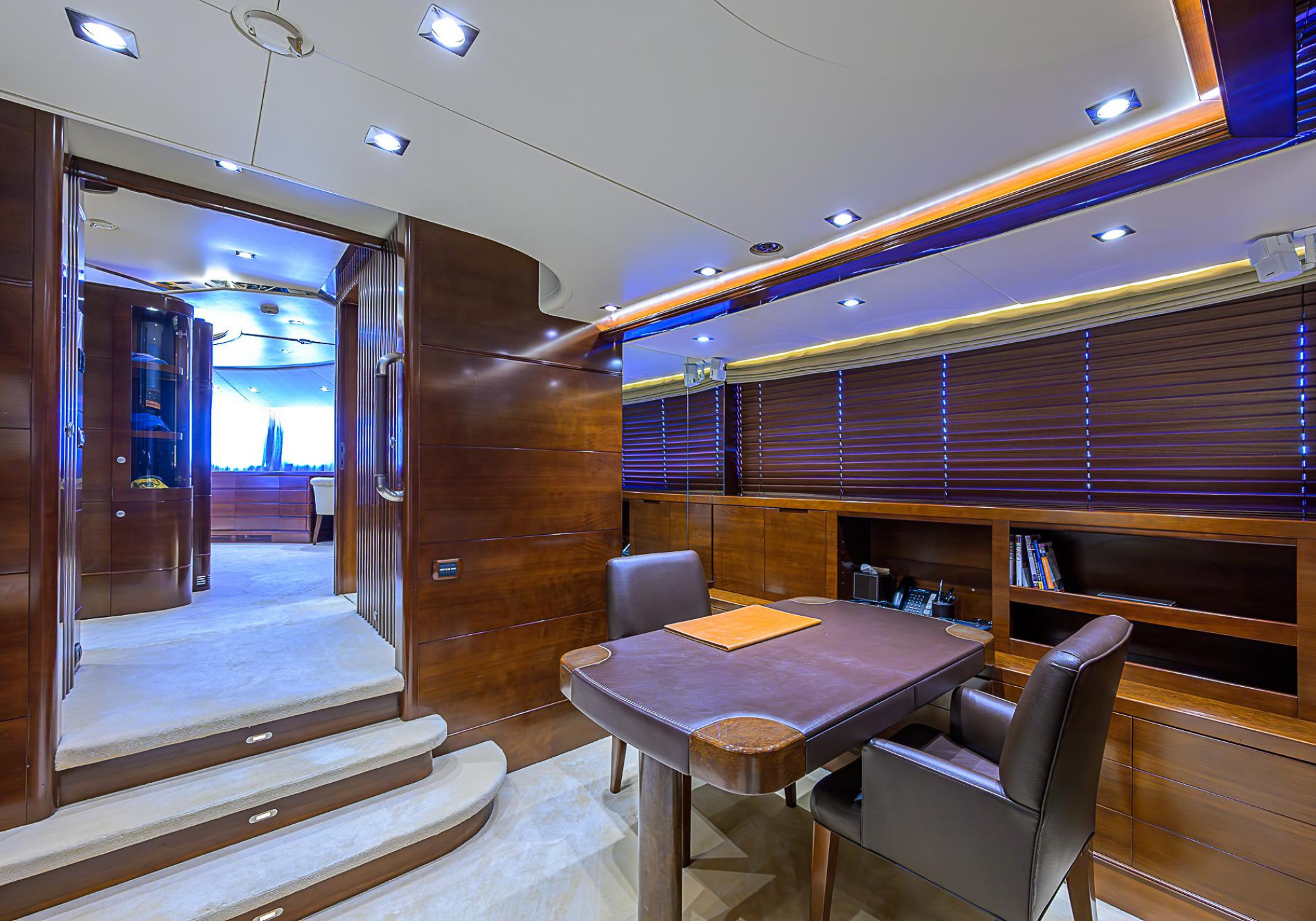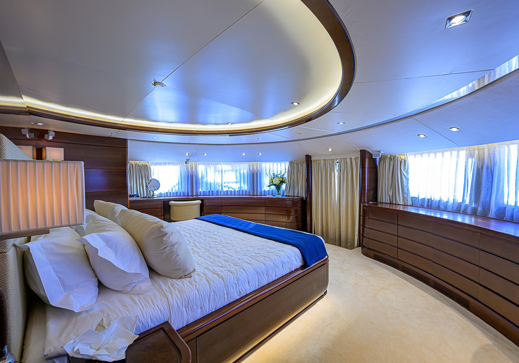 Lower Deck: The lower deck has four guest cabins accessible by the central staircase. The cabins are spacious and bright thanks to the use of light colored cherry and large port holes. The two doubles are located aft and have private bathrooms, dressing tables and wardrobes. The twin cabins located forward and also have private bathrooms, dressing tables and wardrobes. Main Deck: The owner's cabin occupies the forward part of the main deck. The cabin has panoramic windows and a central bed that allows for 180° views. The suite is accessed by way of an adjacent office and there are two bathrooms: 'his' with a shower, and 'hers' with a Jacuzzi that looks onto one of the large perimeter windows. A separate dressing room is located off to port, adjacent 'her' bathroom. A circular staircase is placed amidships adjacent to the galley and disserves the guest quarters. The main saloon is located in the aft portion of the main deck. It is particularly large as the owner requested that the dinning saloon be re-located to the upper deck. The saloon is open-planned which allows various activities to be carried on at the same time and the floor is embellished by wood squares with the grain running in different directions. The aft deck is spacious and is an ideal open air relaxation area with C-shaped sofa, a table and two armchairs. Two stairways run aft from this zone down to the large swimming platform. Upper Deck: The original upper deck plan has been modified on the owners request to accommodate a circular dining room enclosed by glass windows. By opening these windows, the area can be easily transformed into an open-air zone whilst remaining protected from sun, rain and indiscreet eyes. Forward of the dining room, is a second saloon with two L-shaped sofas, coffee tables and a small bar. The forward section of the upper deck is devoted to navigation with a very well designed bridge that offers excellent all round vision. Sun Deck: The exceptionally large sundeck has plenty of sunbathing cushions aft, linked to two C- shaped elements forward that surround a Jacuzzi pool. There's also a bar on this deck with a fridge. The central zone is entirely occupied by the open air dining area and is protected from sun and rain by a custom canopy. Forward are two mirrored sofa areas facing the bow, with chairs and tables and are divided by a center passageway