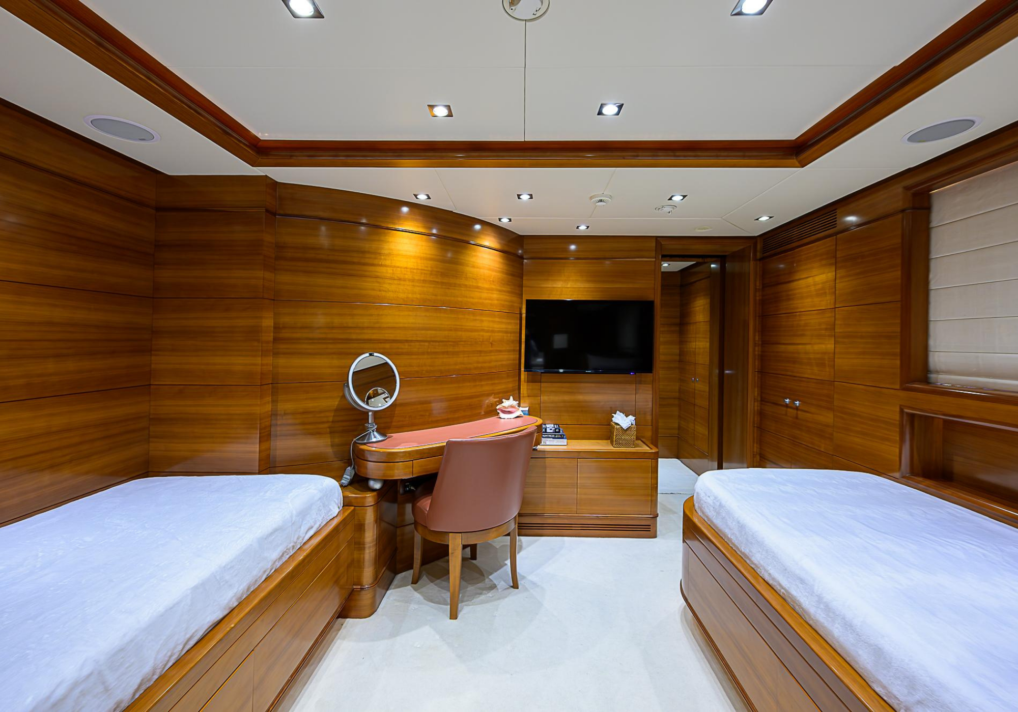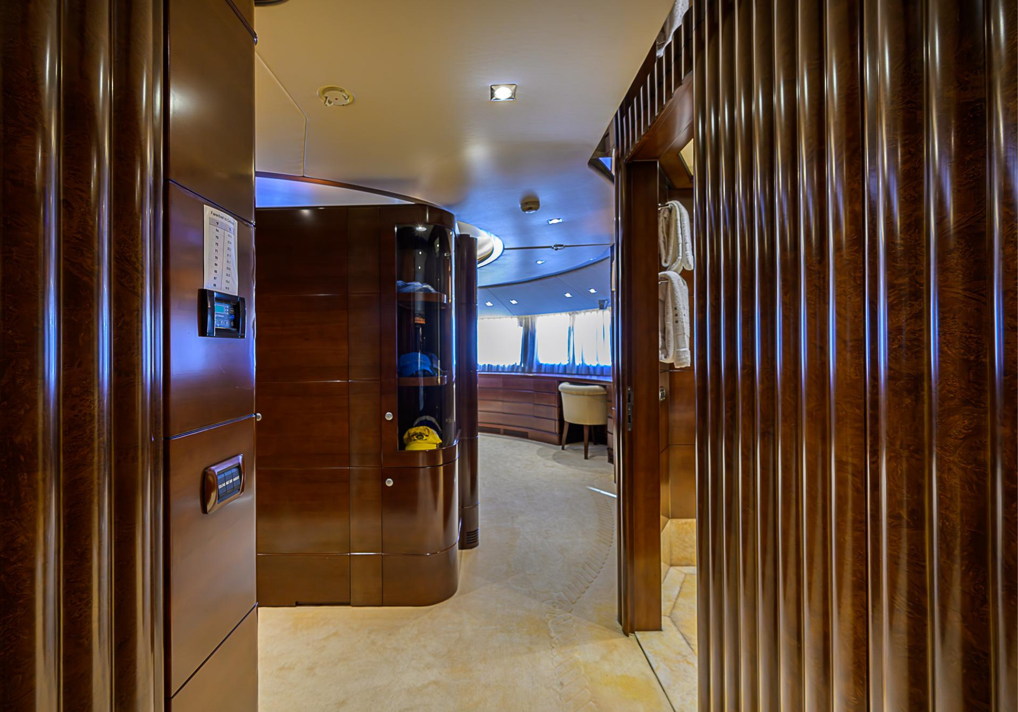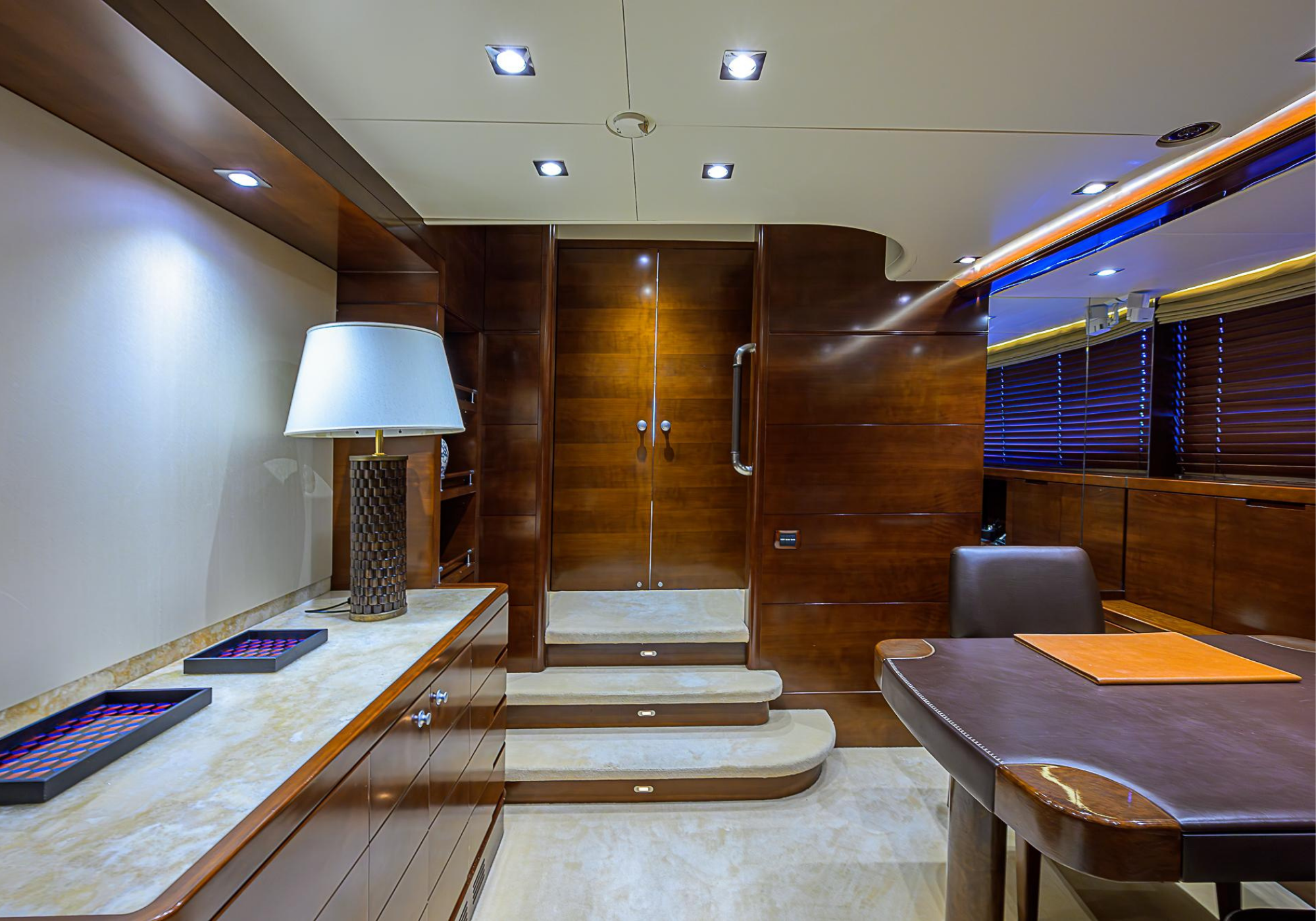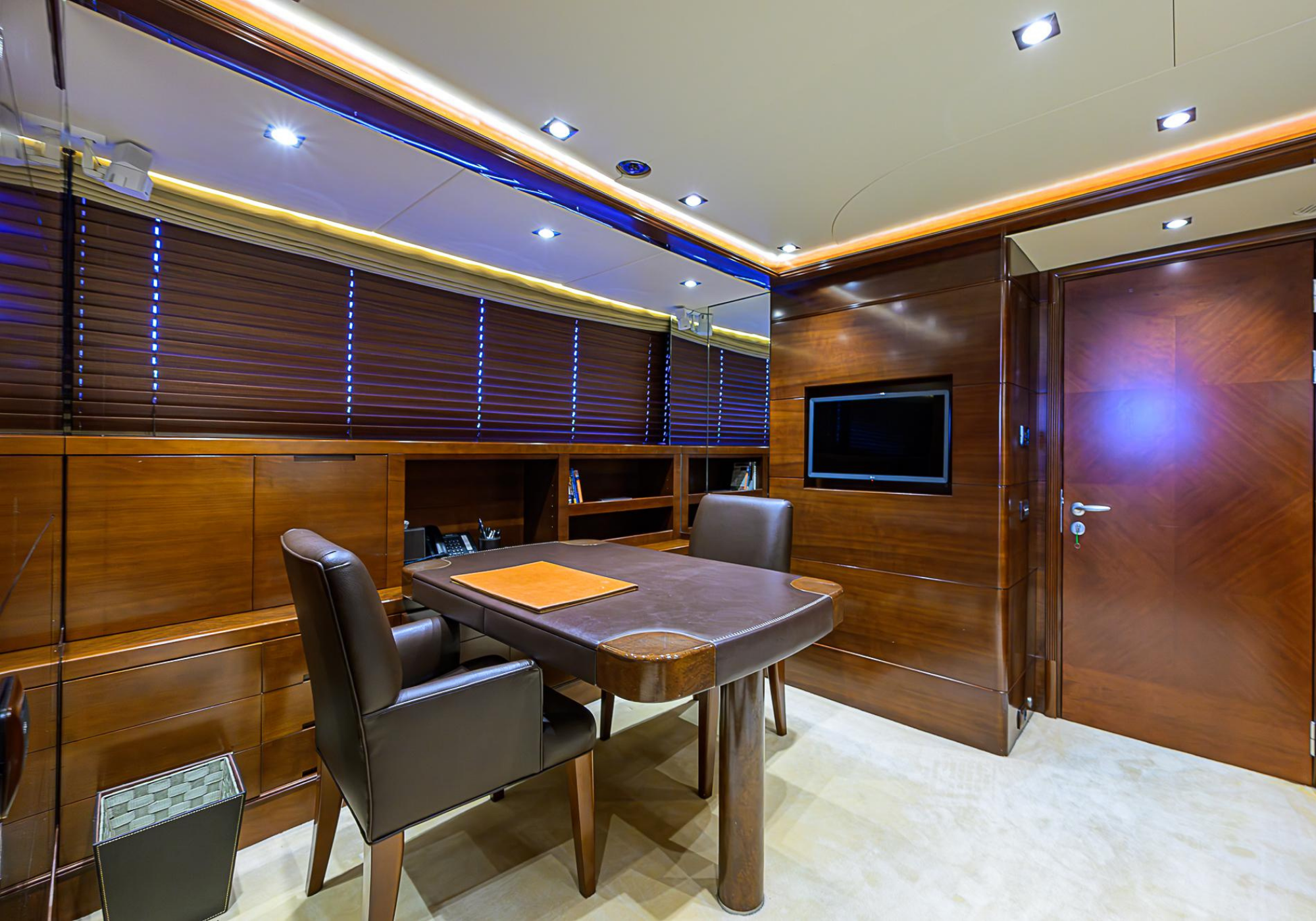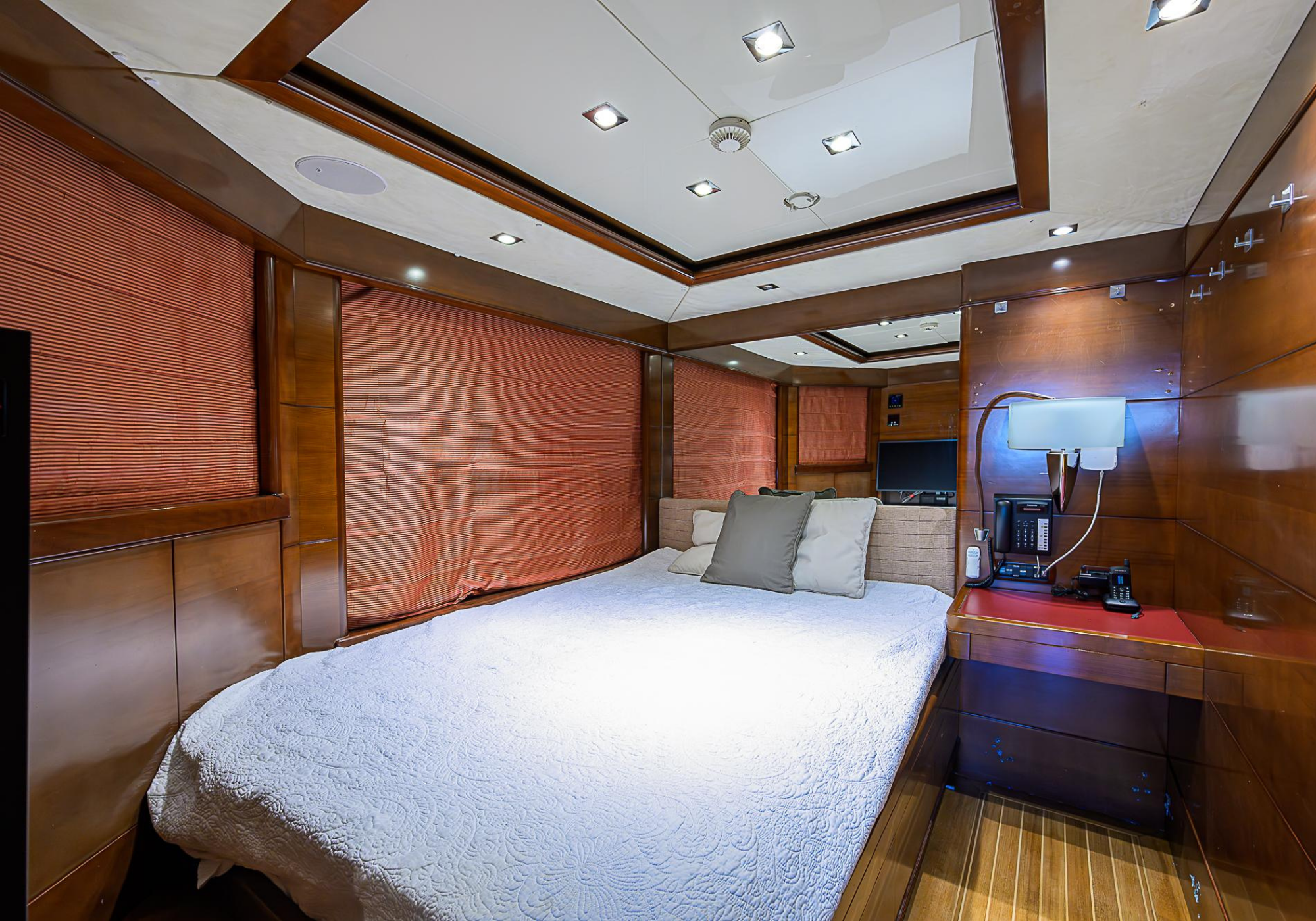Lower Deck: The lower deck has four guest cabins accessible by the central staircase. The cabins are spacious and bright thanks to the use of light colored cherry and large port holes. The two doubles are located aft and have private bathrooms, dressing tables and wardrobes. The twin cabins located forward and also have private bathrooms, dressing tables and wardrobes. Main Deck: The owner's cabin occupies the forward part of the main deck. The cabin has panoramic windows and a central bed that allows for 180° views. The suite is accessed by way of an adjacent office and there are two bathrooms: 'his' with a shower, and 'hers' with a Jacuzzi that looks onto one of the large perimeter windows. A separate dressing room is located off to port, adjacent 'her' bathroom. A circular staircase is placed amidships adjacent to the galley and disserves the guest quarters. The main saloon is located in the aft portion of the main deck. It is particularly large as the owner requested that the dinning saloon be re-located to the upper deck. The saloon is open-planned which allows various activities to be carried on at the same time and the floor is embellished by wood squares with the grain running in different directions. The aft deck is spacious and is an ideal open air relaxation area with C-shaped sofa, a table and two armchairs. Two stairways run aft from this zone down to the large swimming platform. Upper Deck: The original upper deck plan has been modified on the owners request to accommodate a circular dining room enclosed by glass windows. By opening these windows, the area can be easily transformed into an open-air zone whilst remaining protected from sun, rain and indiscreet eyes. Forward of the dining room, is a second saloon with two L-shaped sofas, coffee tables and a small bar. The forward section of the upper deck is devoted to navigation with a very well designed bridge that offers excellent all round vision. Sun Deck: The exceptionally large sundeck has plenty of sunbathing cushions aft, linked to two C- shaped elements forward that surround a Jacuzzi pool. There's also a bar on this deck with a fridge. The central zone is entirely occupied by the open air dining area and is protected from sun and rain by a custom canopy. Forward are two mirrored sofa areas facing the bow, with chairs and tables and are divided by a center passageway