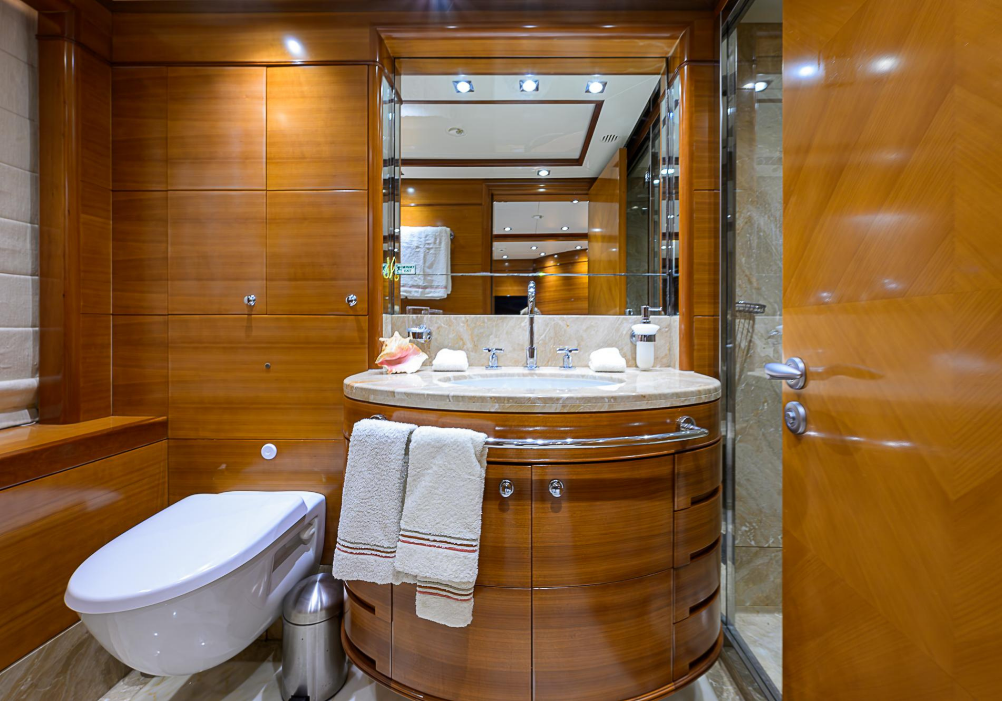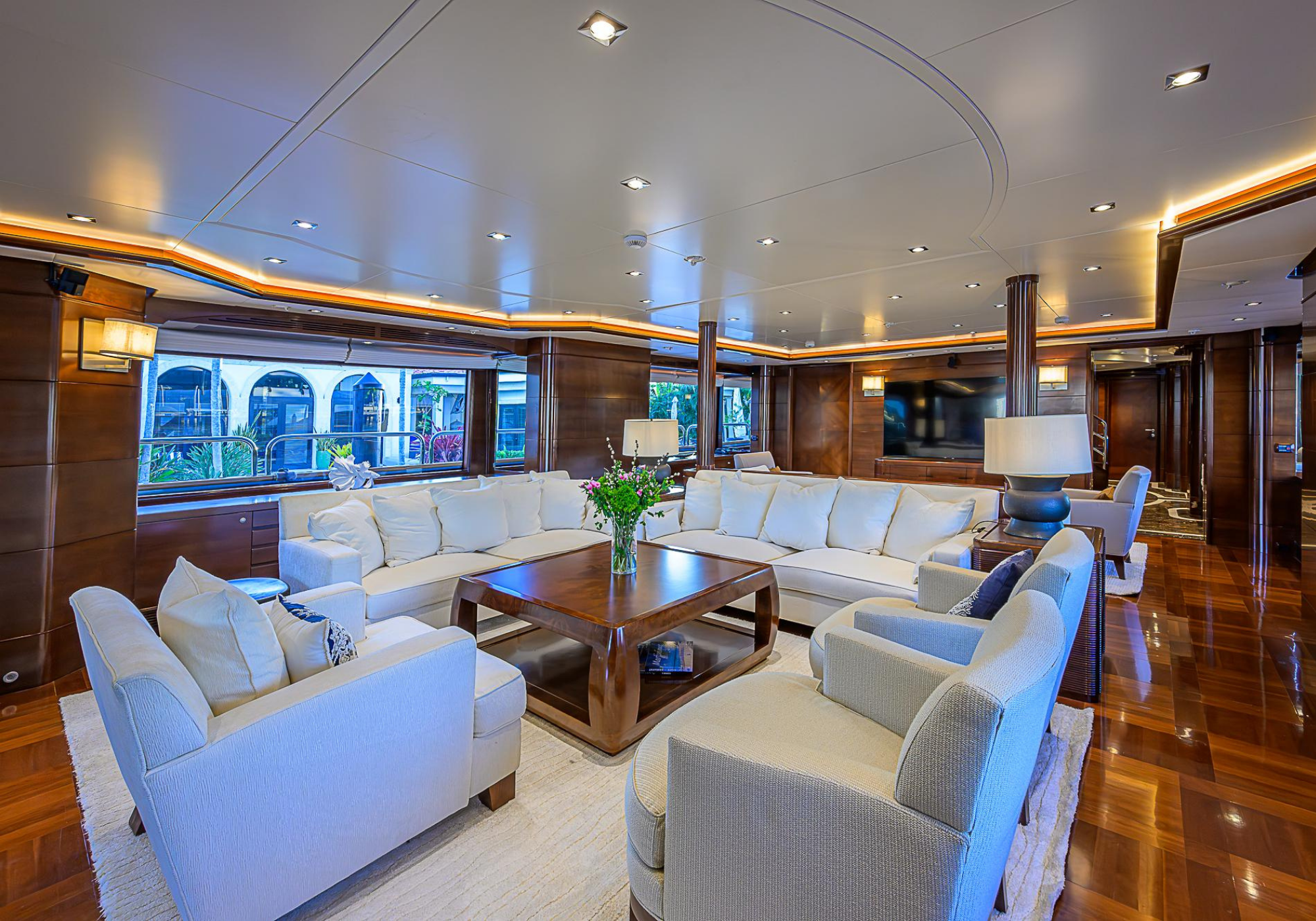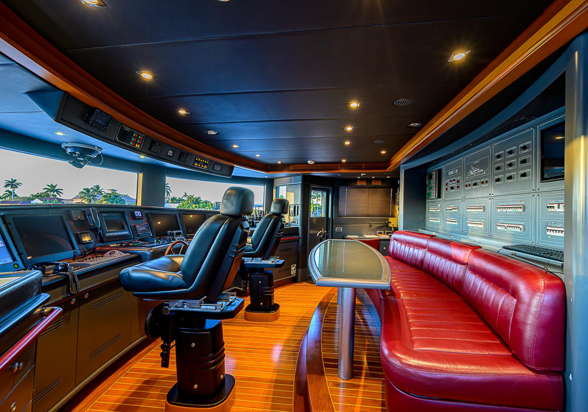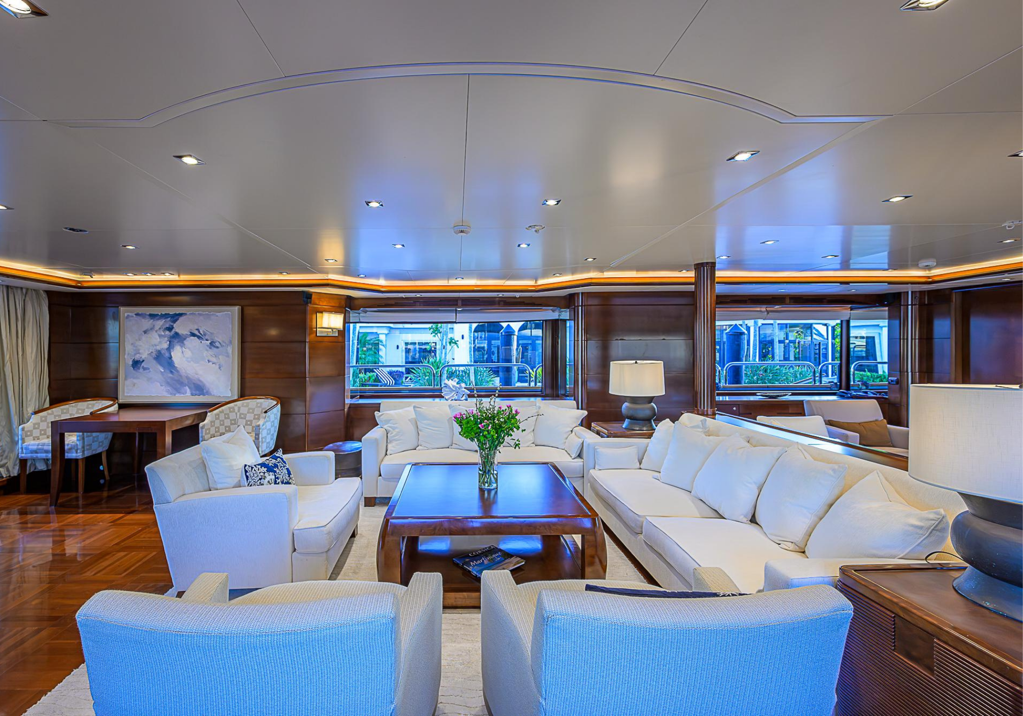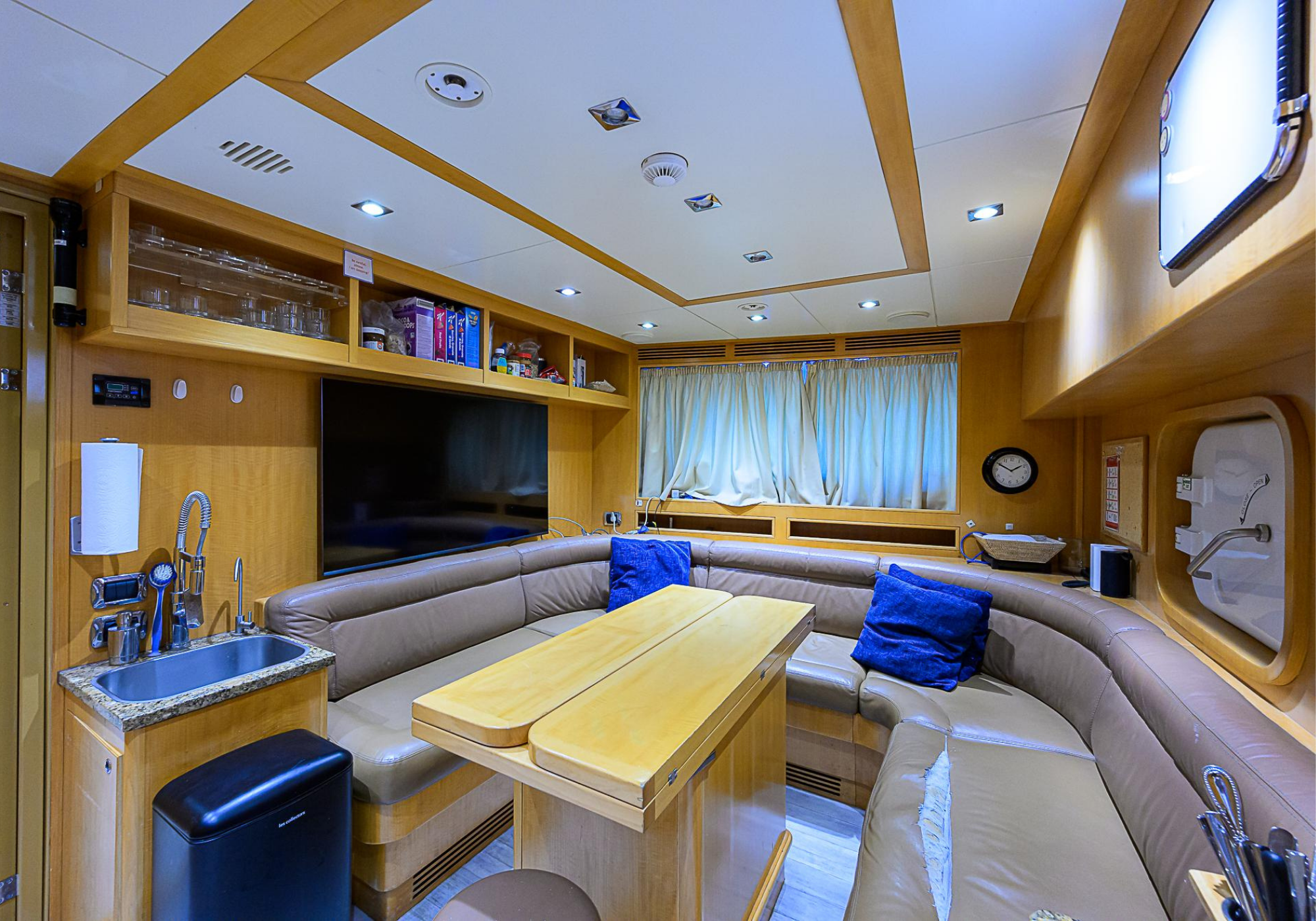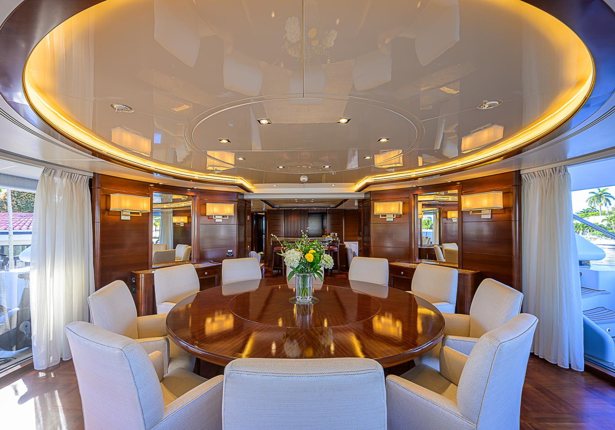 Lower Deck: The lower deck has four guest cabins accessible by the central staircase. The cabins are spacious and bright thanks to the use of light colored cherry and large port holes. The two doubles are located aft and have private bathrooms, dressing tables and wardrobes. The twin cabins located forward and also have private bathrooms, dressing tables and wardrobes. Main Deck: The owner's cabin occupies the forward part of the main deck. The cabin has panoramic windows and a central bed that allows for 180° views. The suite is accessed by way of an adjacent office and there are two bathrooms: 'his' with a shower, and 'hers' with a Jacuzzi that looks onto one of the large perimeter windows. A separate dressing room is located off to port, adjacent 'her' bathroom. A circular staircase is placed amidships adjacent to the galley and disserves the guest quarters. The main saloon is located in the aft portion of the main deck. It is particularly large as the owner requested that the dinning saloon be re-located to the upper deck. The saloon is open-planned which allows various activities to be carried on at the same time and the floor is embellished by wood squares with the grain running in different directions. The aft deck is spacious and is an ideal open air relaxation area with C-shaped sofa, a table and two armchairs. Two stairways run aft from this zone down to the large swimming platform. Upper Deck: The original upper deck plan has been modified on the owners request to accommodate a circular dining room enclosed by glass windows. By opening these windows, the area can be easily transformed into an open-air zone whilst remaining protected from sun, rain and indiscreet eyes. Forward of the dining room, is a second saloon with two L-shaped sofas, coffee tables and a small bar. The forward section of the upper deck is devoted to navigation with a very well designed bridge that offers excellent all round vision. Sun Deck: The exceptionally large sundeck has plenty of sunbathing cushions aft, linked to two C- shaped elements forward that surround a Jacuzzi pool. There's also a bar on this deck with a fridge. The central zone is entirely occupied by the open air dining area and is protected from sun and rain by a custom canopy. Forward are two mirrored sofa areas facing the bow, with chairs and tables and are divided by a center passageway