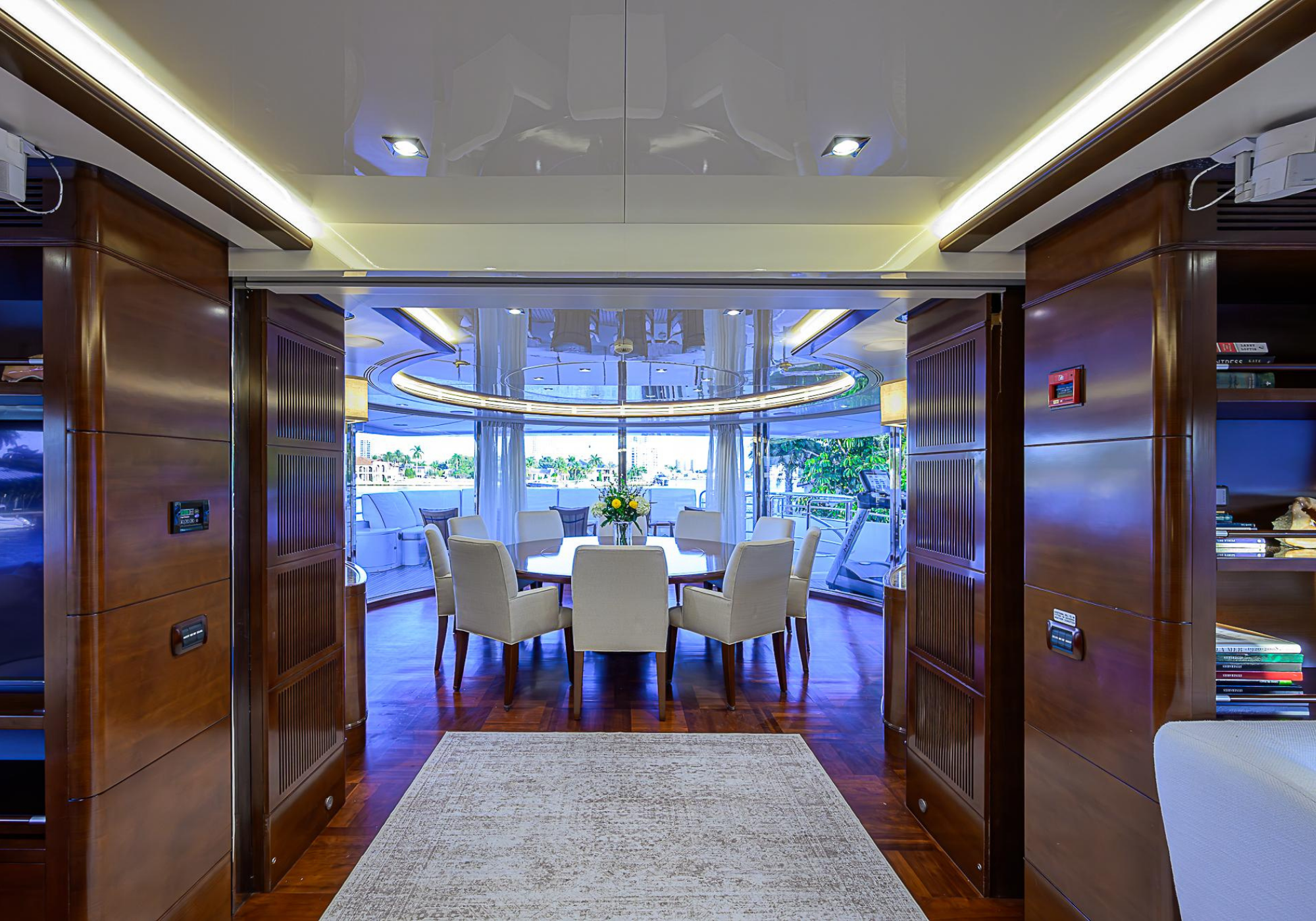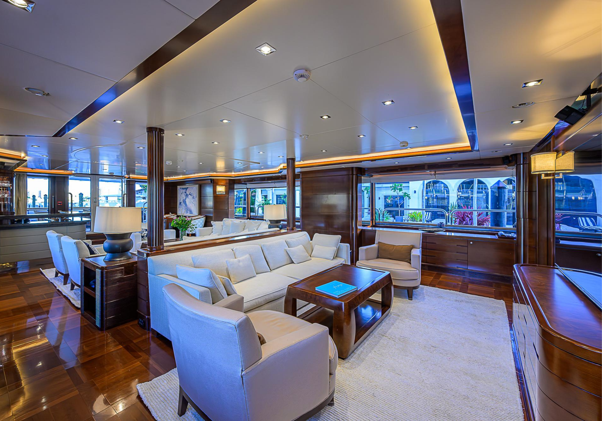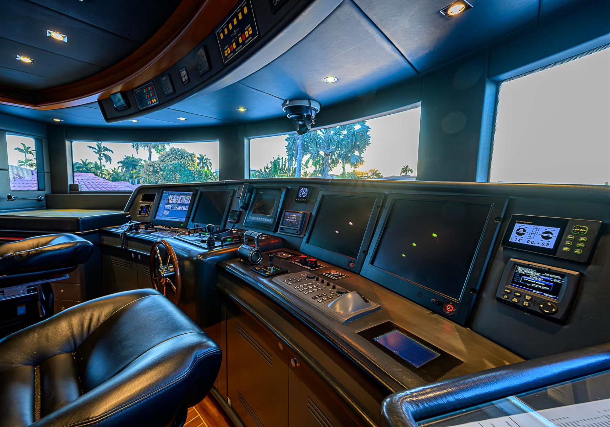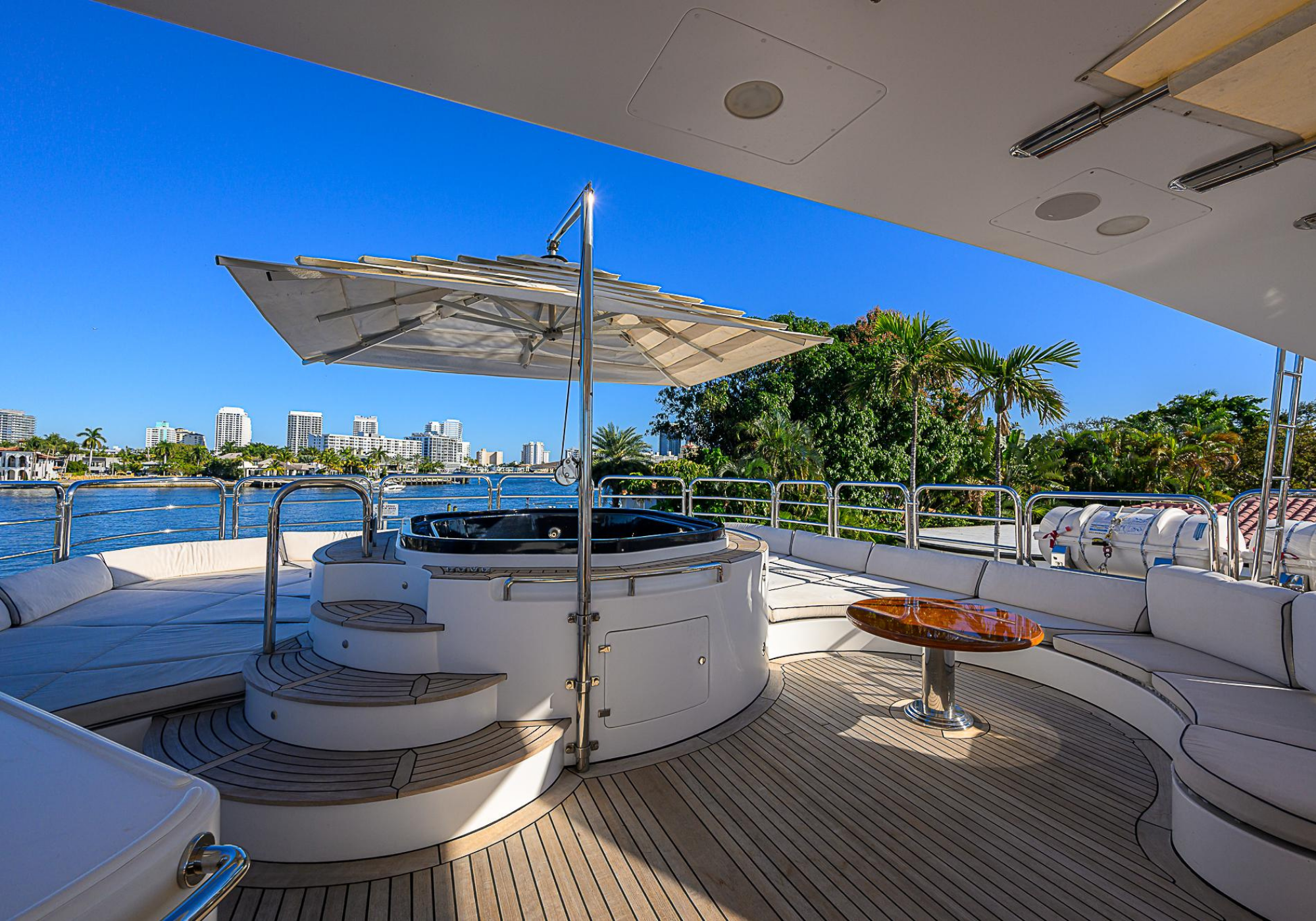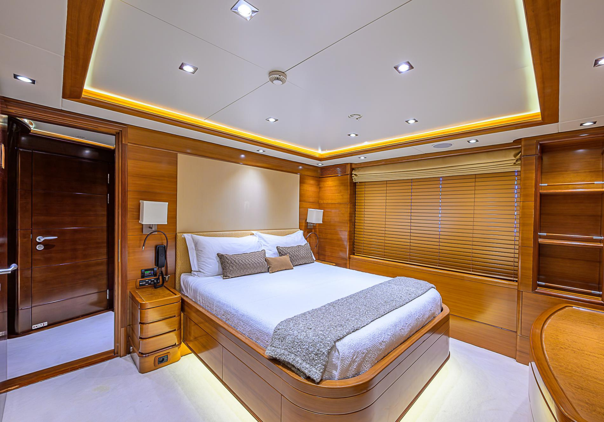 Lower Deck: The lower deck has four guest cabins accessible by the central staircase. The cabins are spacious and bright thanks to the use of light colored cherry and large port holes. The two doubles are located aft and have private bathrooms, dressing tables and wardrobes. The twin cabins located forward and also have private bathrooms, dressing tables and wardrobes. Main Deck: The owner's cabin occupies the forward part of the main deck. The cabin has panoramic windows and a central bed that allows for 180° views. The suite is accessed by way of an adjacent office and there are two bathrooms: 'his' with a shower, and 'hers' with a Jacuzzi that looks onto one of the large perimeter windows. A separate dressing room is located off to port, adjacent 'her' bathroom. A circular staircase is placed amidships adjacent to the galley and disserves the guest quarters. The main saloon is located in the aft portion of the main deck. It is particularly large as the owner requested that the dinning saloon be re-located to the upper deck. The saloon is open-planned which allows various activities to be carried on at the same time and the floor is embellished by wood squares with the grain running in different directions. The aft deck is spacious and is an ideal open air relaxation area with C-shaped sofa, a table and two armchairs. Two stairways run aft from this zone down to the large swimming platform. Upper Deck: The original upper deck plan has been modified on the owners request to accommodate a circular dining room enclosed by glass windows. By opening these windows, the area can be easily transformed into an open-air zone whilst remaining protected from sun, rain and indiscreet eyes. Forward of the dining room, is a second saloon with two L-shaped sofas, coffee tables and a small bar. The forward section of the upper deck is devoted to navigation with a very well designed bridge that offers excellent all round vision. Sun Deck: The exceptionally large sundeck has plenty of sunbathing cushions aft, linked to two C- shaped elements forward that surround a Jacuzzi pool. There's also a bar on this deck with a fridge. The central zone is entirely occupied by the open air dining area and is protected from sun and rain by a custom canopy. Forward are two mirrored sofa areas facing the bow, with chairs and tables and are divided by a center passageway