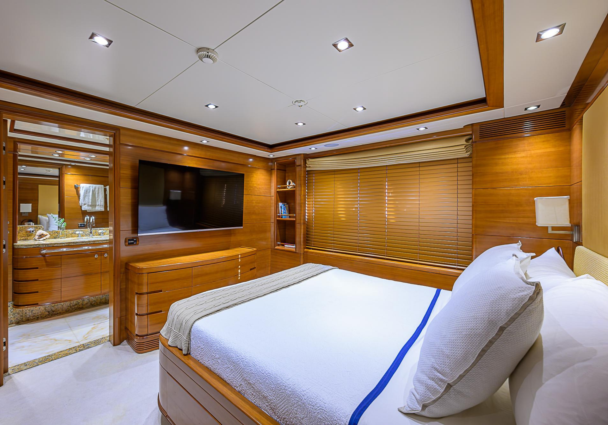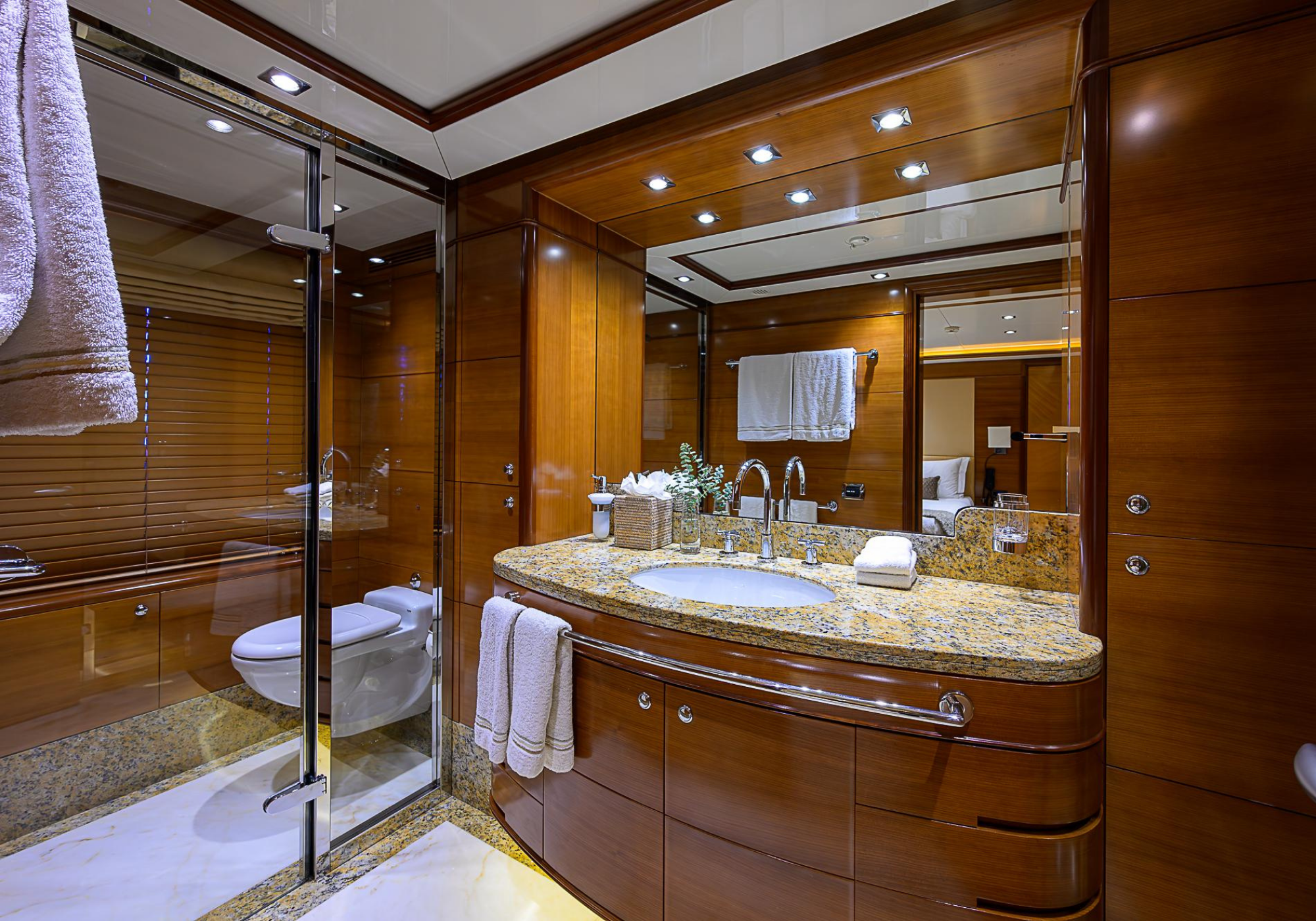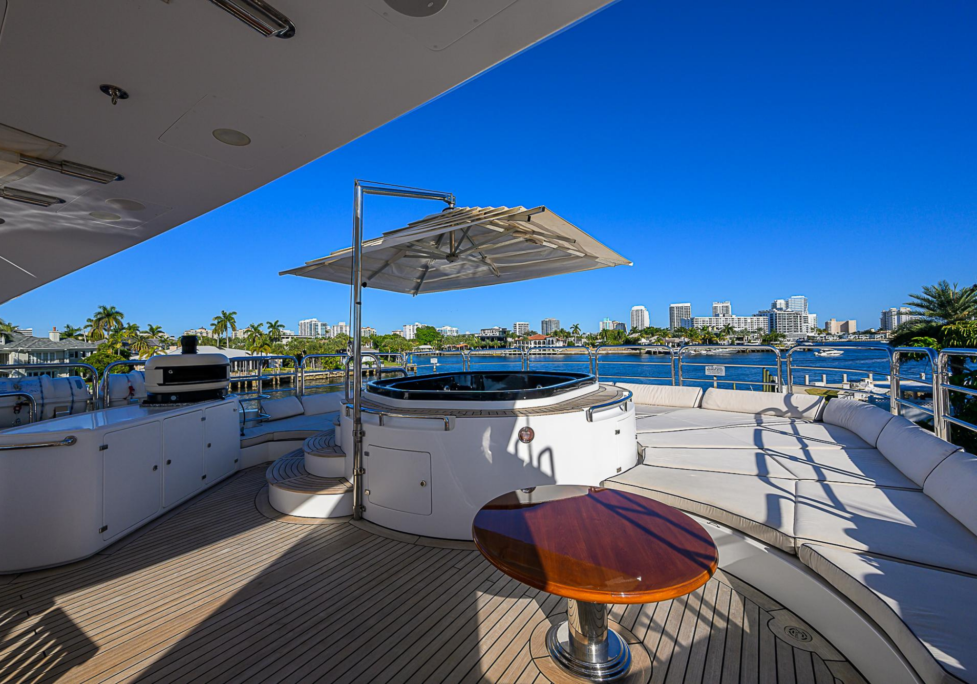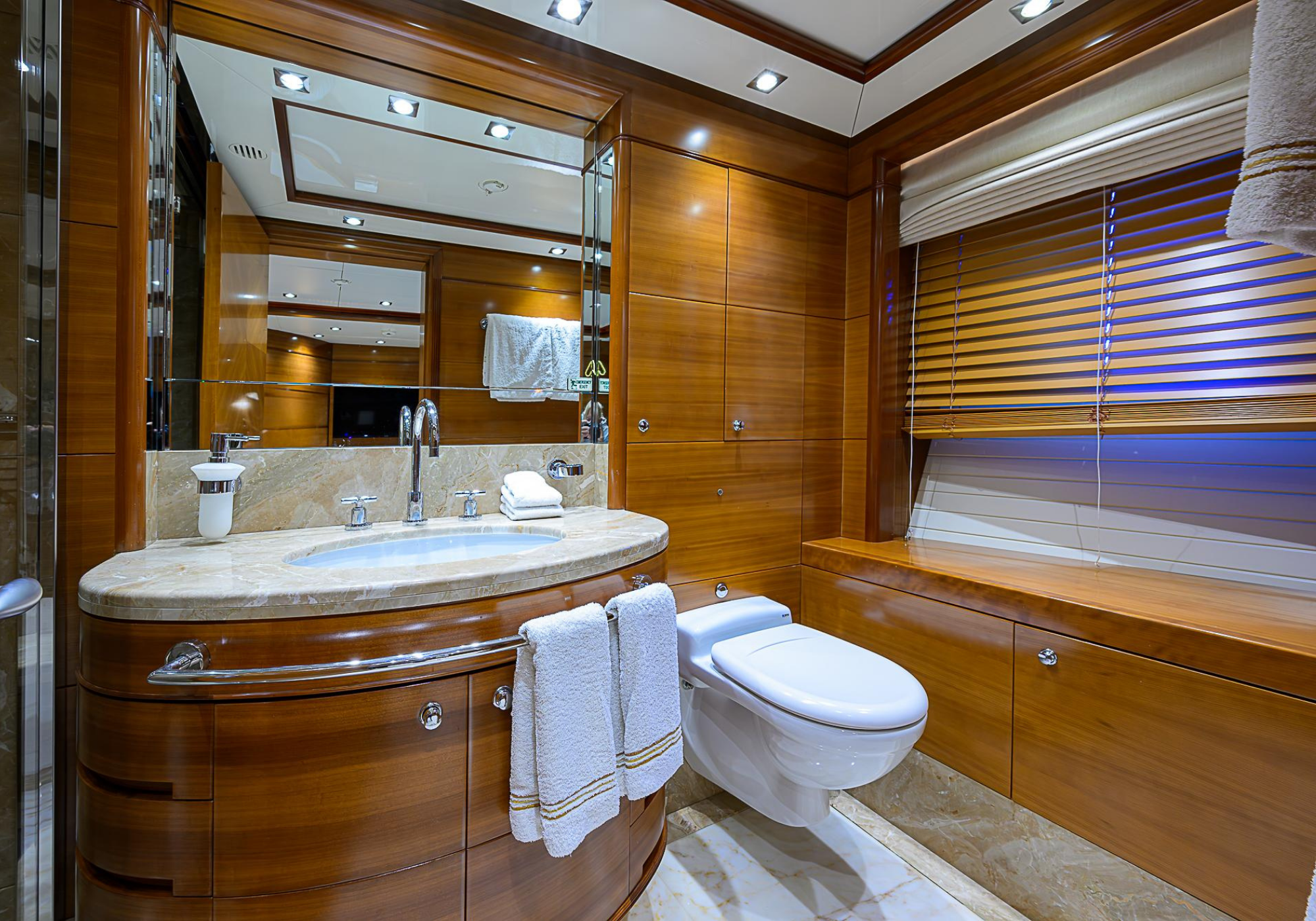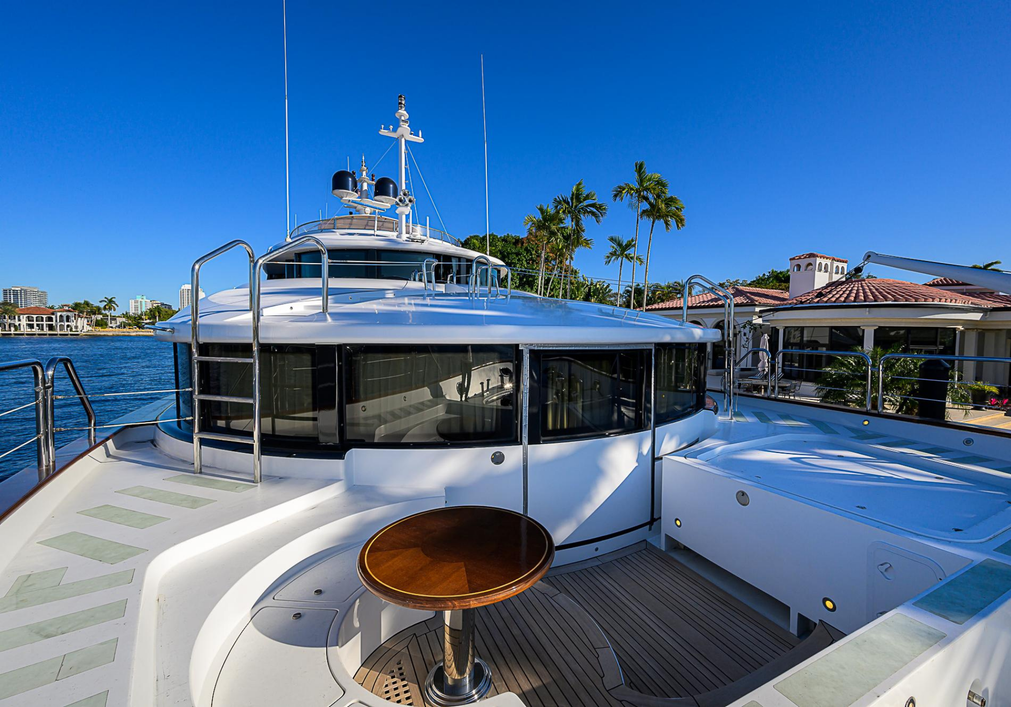 Lower Deck: The lower deck has four guest cabins accessible by the central staircase. The cabins are spacious and bright thanks to the use of light colored cherry and large port holes. The two doubles are located aft and have private bathrooms, dressing tables and wardrobes. The twin cabins located forward and also have private bathrooms, dressing tables and wardrobes. Main Deck: The owner's cabin occupies the forward part of the main deck. The cabin has panoramic windows and a central bed that allows for 180° views. The suite is accessed by way of an adjacent office and there are two bathrooms: 'his' with a shower, and 'hers' with a Jacuzzi that looks onto one of the large perimeter windows. A separate dressing room is located off to port, adjacent 'her' bathroom. A circular staircase is placed amidships adjacent to the galley and disserves the guest quarters. The main saloon is located in the aft portion of the main deck. It is particularly large as the owner requested that the dinning saloon be re-located to the upper deck. The saloon is open-planned which allows various activities to be carried on at the same time and the floor is embellished by wood squares with the grain running in different directions. The aft deck is spacious and is an ideal open air relaxation area with C-shaped sofa, a table and two armchairs. Two stairways run aft from this zone down to the large swimming platform. Upper Deck: The original upper deck plan has been modified on the owners request to accommodate a circular dining room enclosed by glass windows. By opening these windows, the area can be easily transformed into an open-air zone whilst remaining protected from sun, rain and indiscreet eyes. Forward of the dining room, is a second saloon with two L-shaped sofas, coffee tables and a small bar. The forward section of the upper deck is devoted to navigation with a very well designed bridge that offers excellent all round vision. Sun Deck: The exceptionally large sundeck has plenty of sunbathing cushions aft, linked to two C- shaped elements forward that surround a Jacuzzi pool. There's also a bar on this deck with a fridge. The central zone is entirely occupied by the open air dining area and is protected from sun and rain by a custom canopy. Forward are two mirrored sofa areas facing the bow, with chairs and tables and are divided by a center passageway