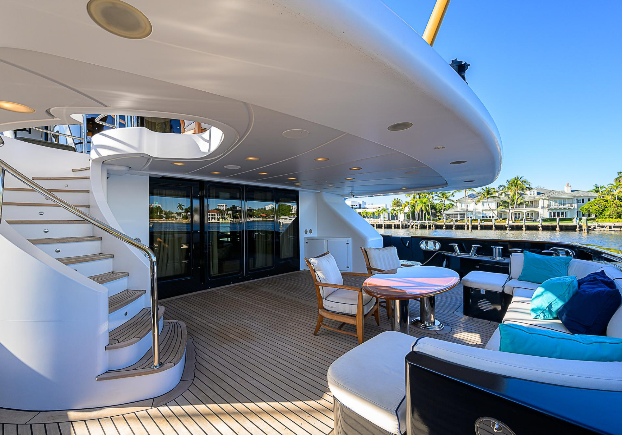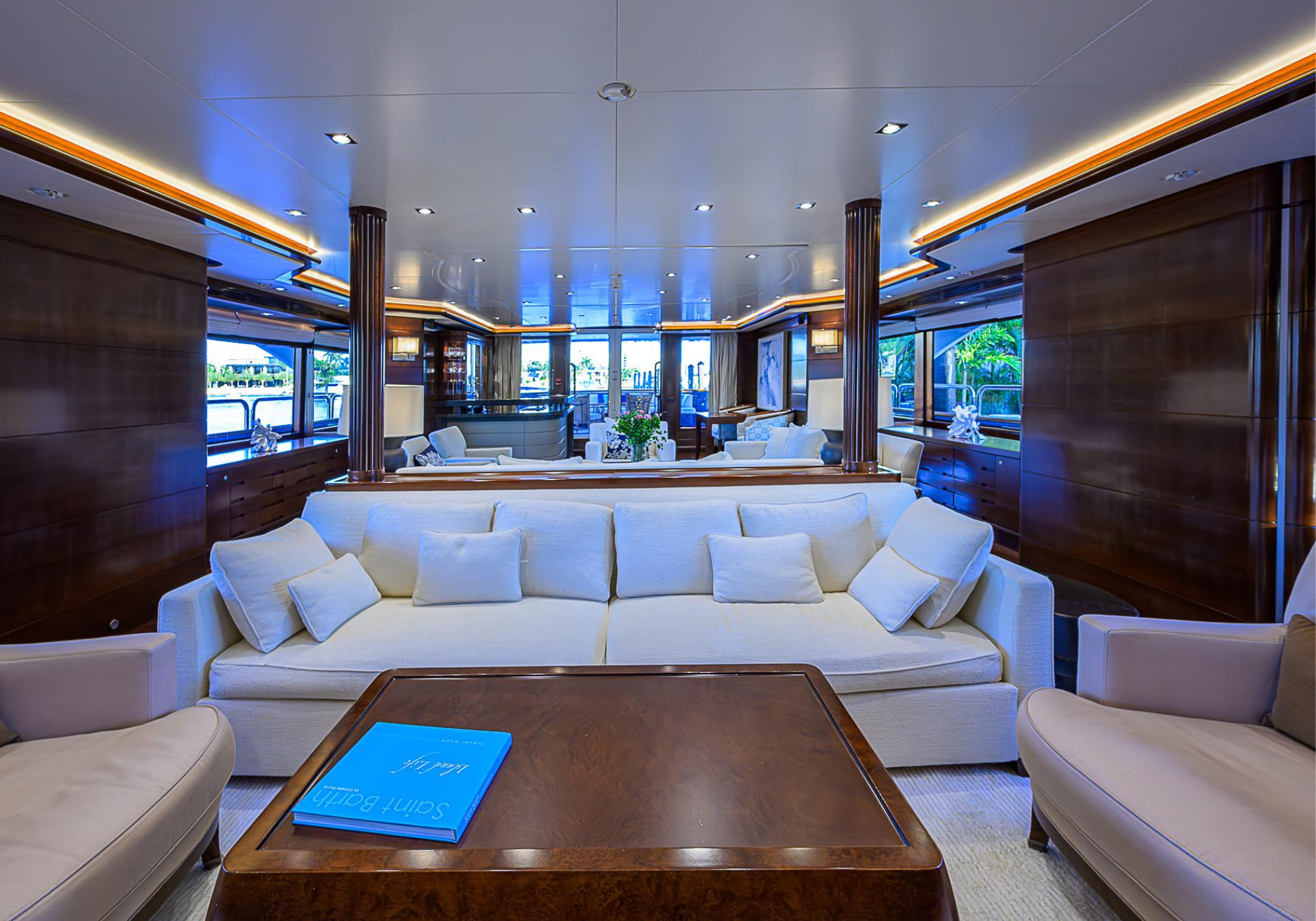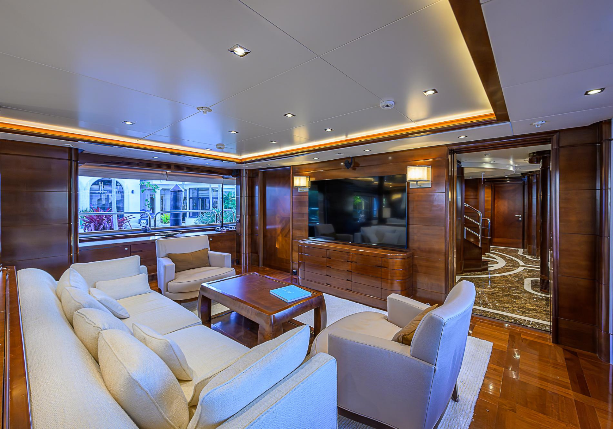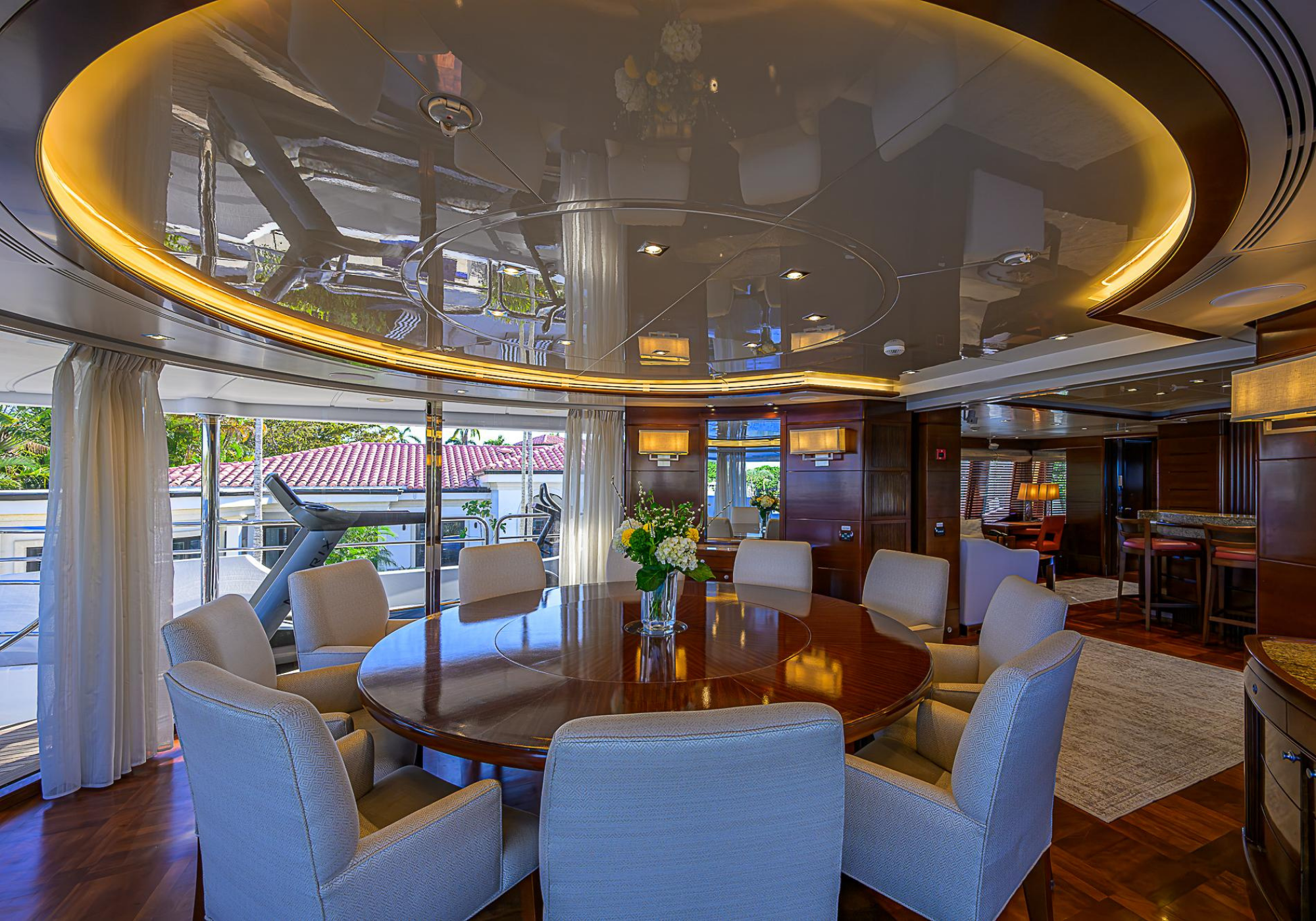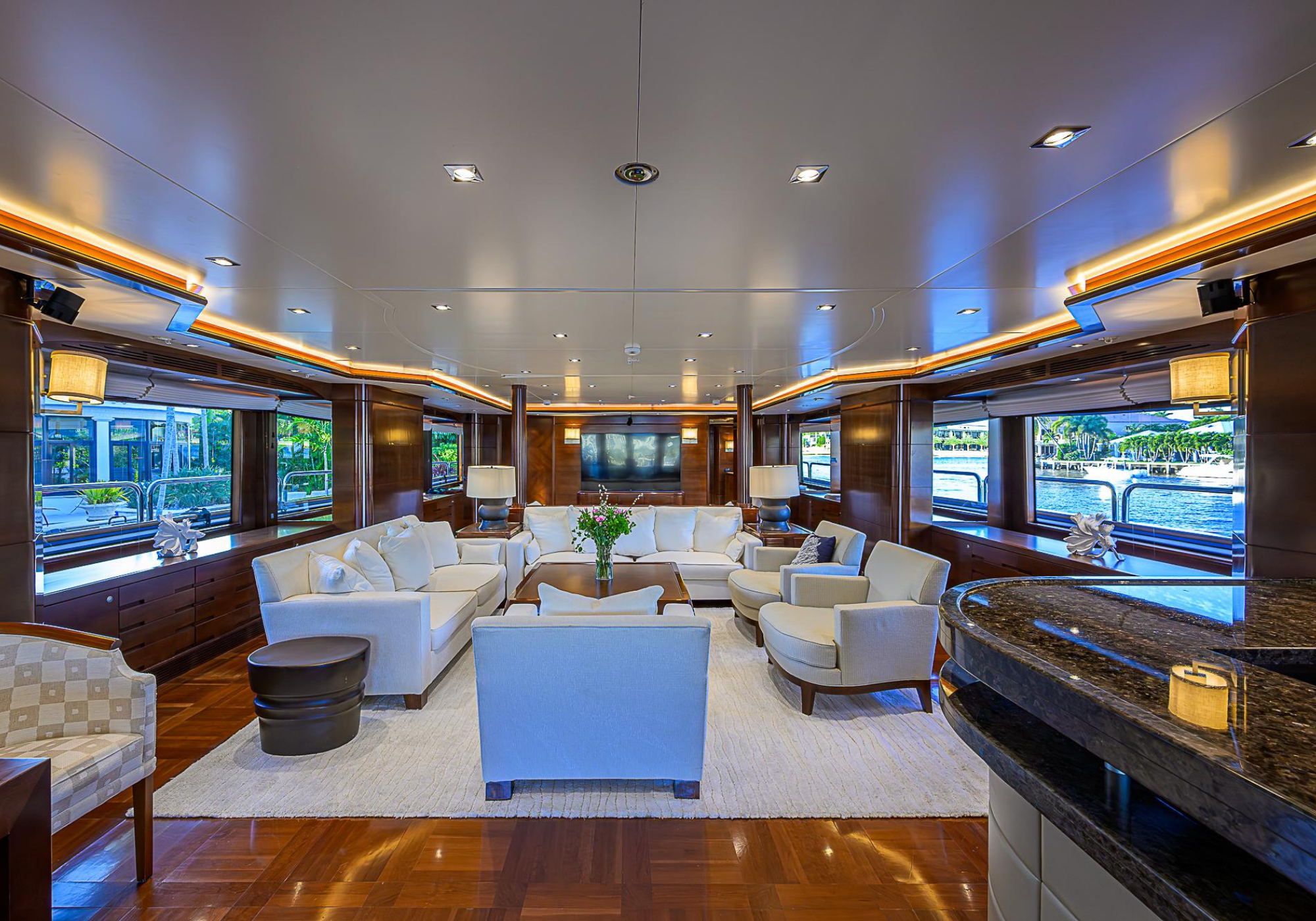 Lower Deck: The lower deck has four guest cabins accessible by the central staircase. The cabins are spacious and bright thanks to the use of light colored cherry and large port holes. The two doubles are located aft and have private bathrooms, dressing tables and wardrobes. The twin cabins located forward and also have private bathrooms, dressing tables and wardrobes. Main Deck: The owner's cabin occupies the forward part of the main deck. The cabin has panoramic windows and a central bed that allows for 180° views. The suite is accessed by way of an adjacent office and there are two bathrooms: 'his' with a shower, and 'hers' with a Jacuzzi that looks onto one of the large perimeter windows. A separate dressing room is located off to port, adjacent 'her' bathroom. A circular staircase is placed amidships adjacent to the galley and disserves the guest quarters. The main saloon is located in the aft portion of the main deck. It is particularly large as the owner requested that the dinning saloon be re-located to the upper deck. The saloon is open-planned which allows various activities to be carried on at the same time and the floor is embellished by wood squares with the grain running in different directions. The aft deck is spacious and is an ideal open air relaxation area with C-shaped sofa, a table and two armchairs. Two stairways run aft from this zone down to the large swimming platform. Upper Deck: The original upper deck plan has been modified on the owners request to accommodate a circular dining room enclosed by glass windows. By opening these windows, the area can be easily transformed into an open-air zone whilst remaining protected from sun, rain and indiscreet eyes. Forward of the dining room, is a second saloon with two L-shaped sofas, coffee tables and a small bar. The forward section of the upper deck is devoted to navigation with a very well designed bridge that offers excellent all round vision. Sun Deck: The exceptionally large sundeck has plenty of sunbathing cushions aft, linked to two C- shaped elements forward that surround a Jacuzzi pool. There's also a bar on this deck with a fridge. The central zone is entirely occupied by the open air dining area and is protected from sun and rain by a custom canopy. Forward are two mirrored sofa areas facing the bow, with chairs and tables and are divided by a center passageway