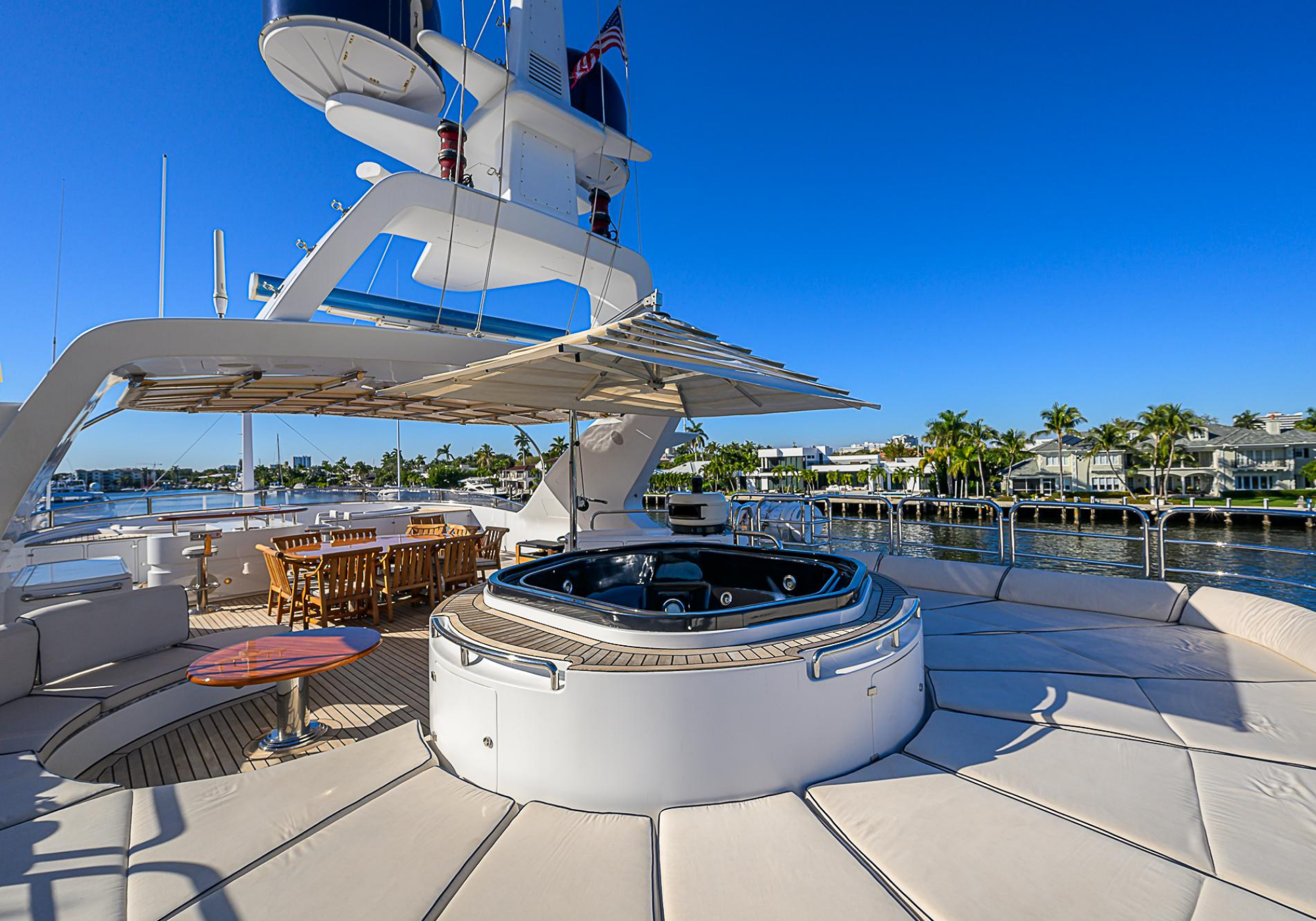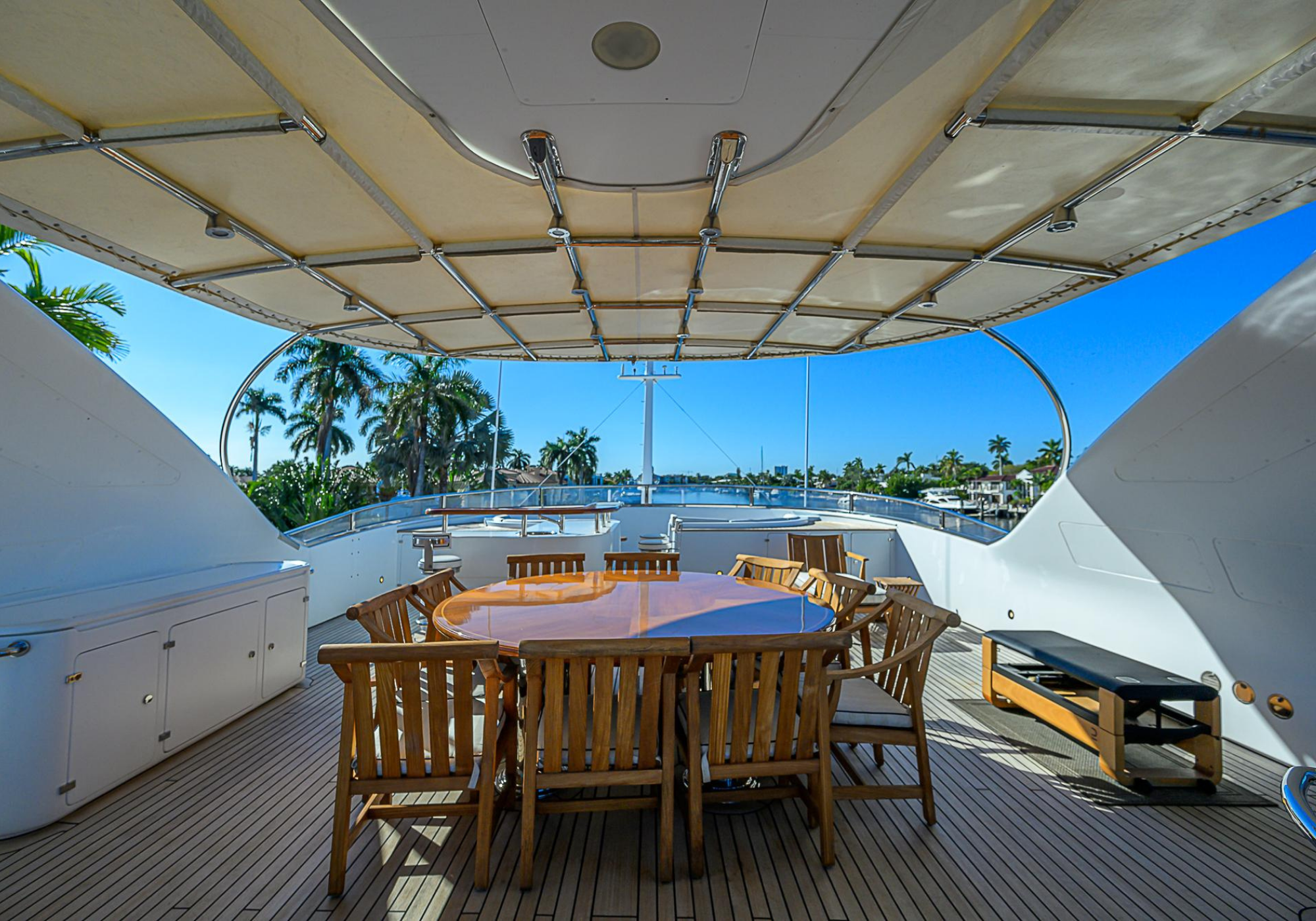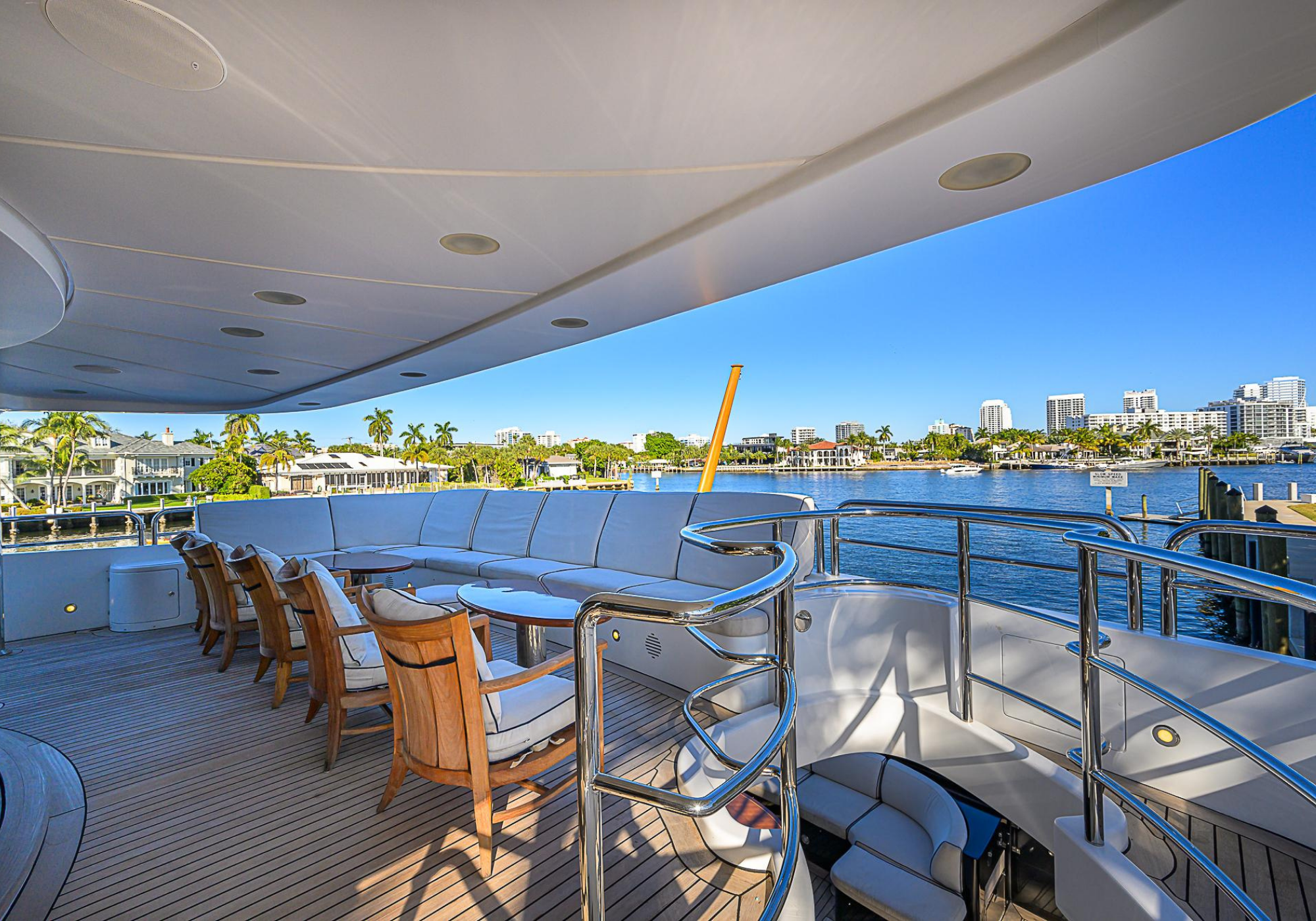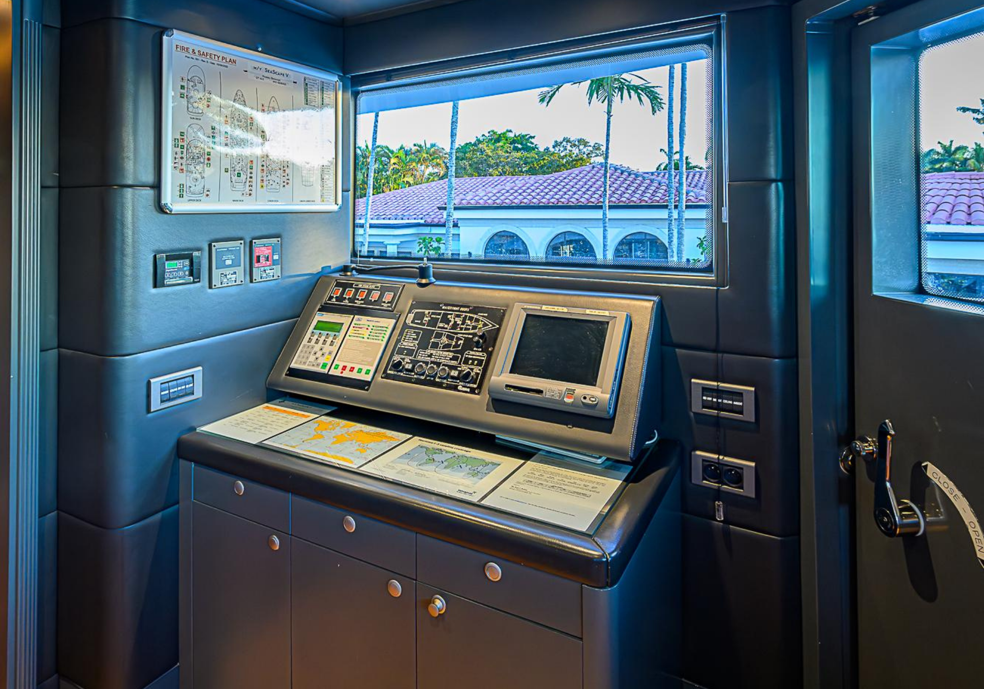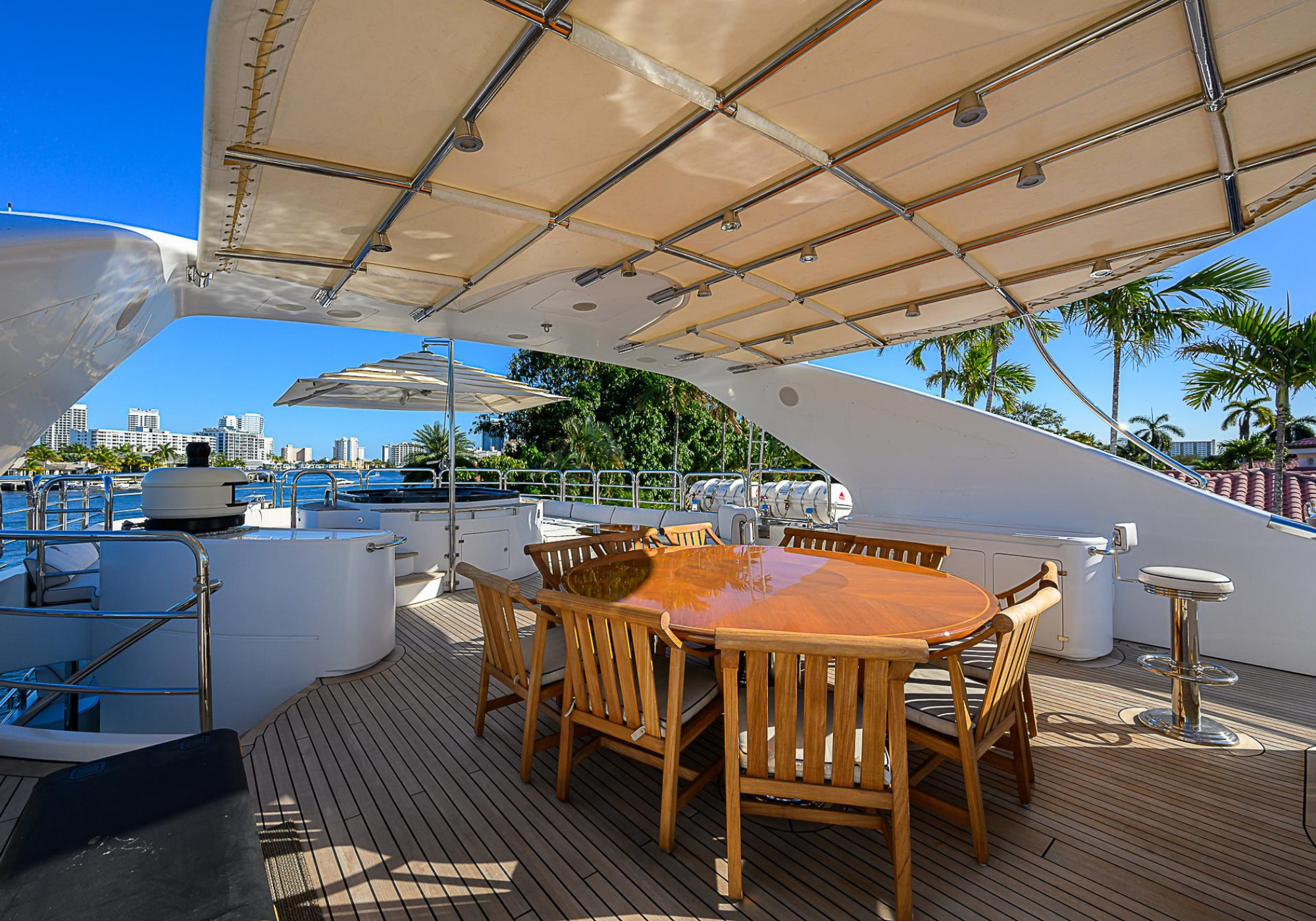 Lower Deck: The lower deck has four guest cabins accessible by the central staircase. The cabins are spacious and bright thanks to the use of light colored cherry and large port holes. The two doubles are located aft and have private bathrooms, dressing tables and wardrobes. The twin cabins located forward and also have private bathrooms, dressing tables and wardrobes. Main Deck: The owner's cabin occupies the forward part of the main deck. The cabin has panoramic windows and a central bed that allows for 180° views. The suite is accessed by way of an adjacent office and there are two bathrooms: 'his' with a shower, and 'hers' with a Jacuzzi that looks onto one of the large perimeter windows. A separate dressing room is located off to port, adjacent 'her' bathroom. A circular staircase is placed amidships adjacent to the galley and disserves the guest quarters. The main saloon is located in the aft portion of the main deck. It is particularly large as the owner requested that the dinning saloon be re-located to the upper deck. The saloon is open-planned which allows various activities to be carried on at the same time and the floor is embellished by wood squares with the grain running in different directions. The aft deck is spacious and is an ideal open air relaxation area with C-shaped sofa, a table and two armchairs. Two stairways run aft from this zone down to the large swimming platform. Upper Deck: The original upper deck plan has been modified on the owners request to accommodate a circular dining room enclosed by glass windows. By opening these windows, the area can be easily transformed into an open-air zone whilst remaining protected from sun, rain and indiscreet eyes. Forward of the dining room, is a second saloon with two L-shaped sofas, coffee tables and a small bar. The forward section of the upper deck is devoted to navigation with a very well designed bridge that offers excellent all round vision. Sun Deck: The exceptionally large sundeck has plenty of sunbathing cushions aft, linked to two C- shaped elements forward that surround a Jacuzzi pool. There's also a bar on this deck with a fridge. The central zone is entirely occupied by the open air dining area and is protected from sun and rain by a custom canopy. Forward are two mirrored sofa areas facing the bow, with chairs and tables and are divided by a center passageway