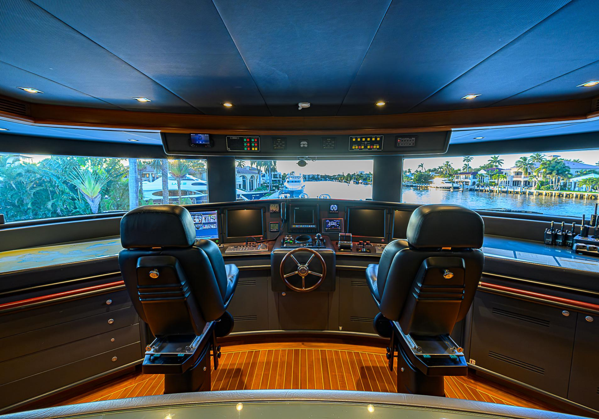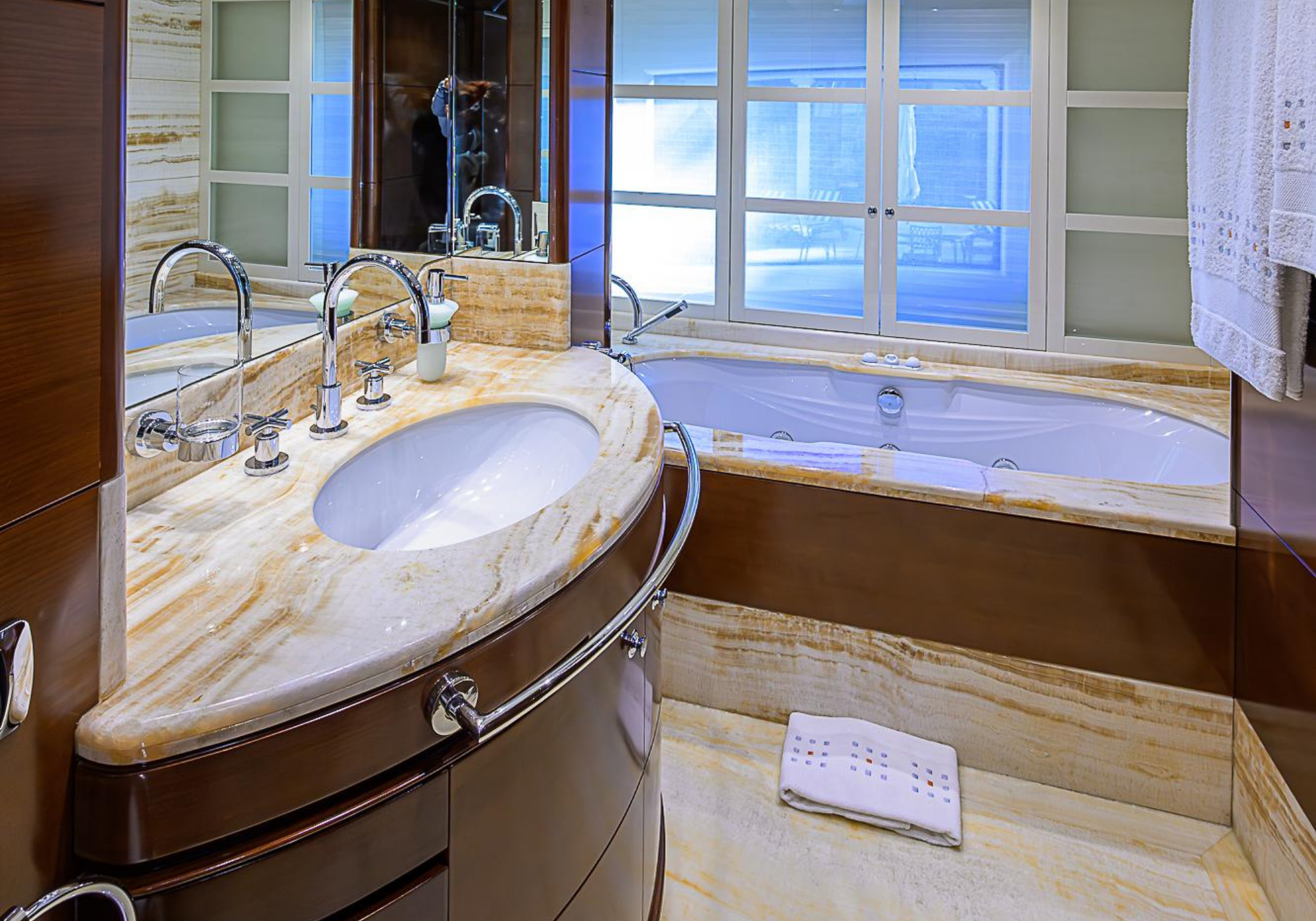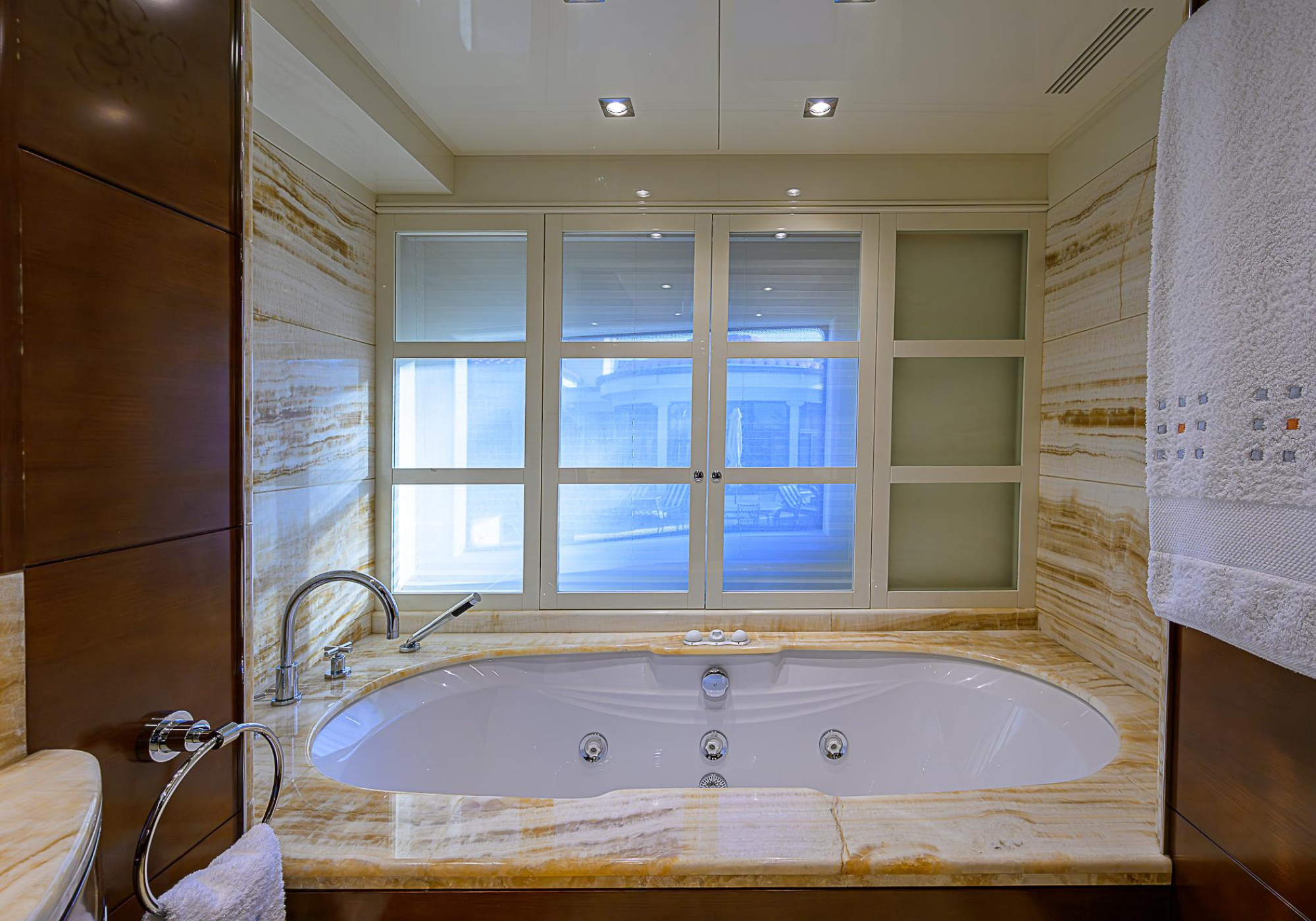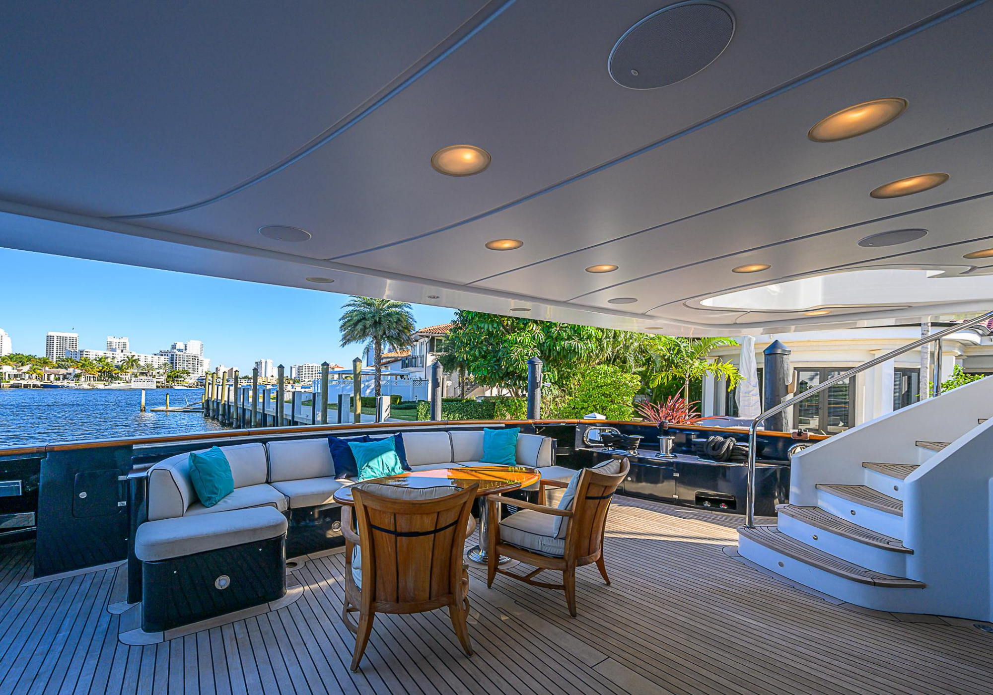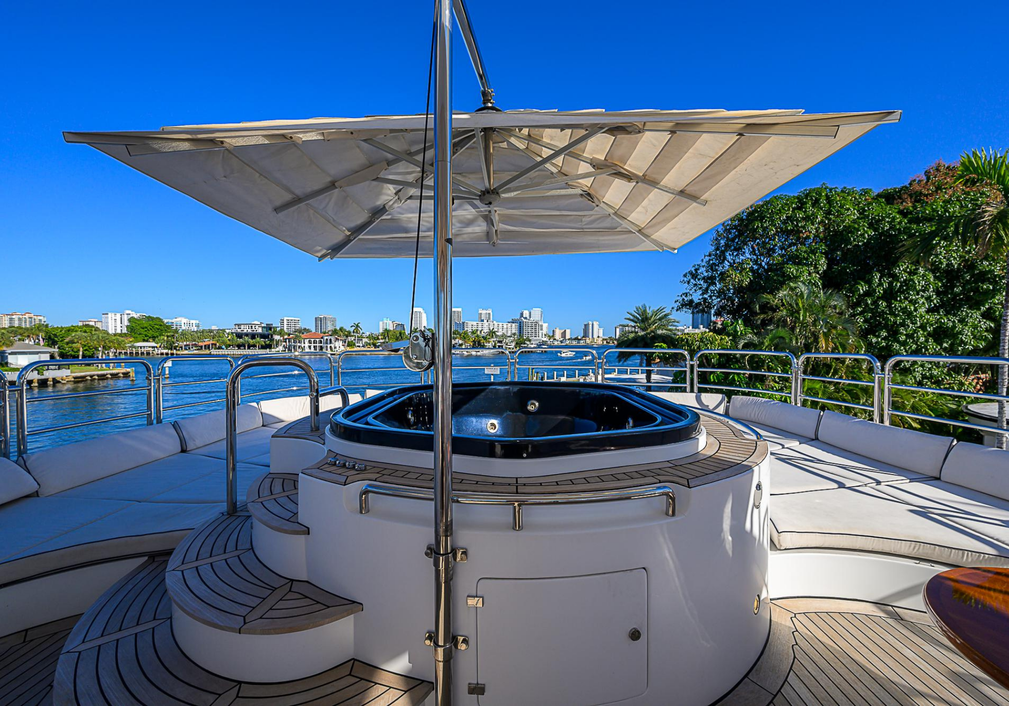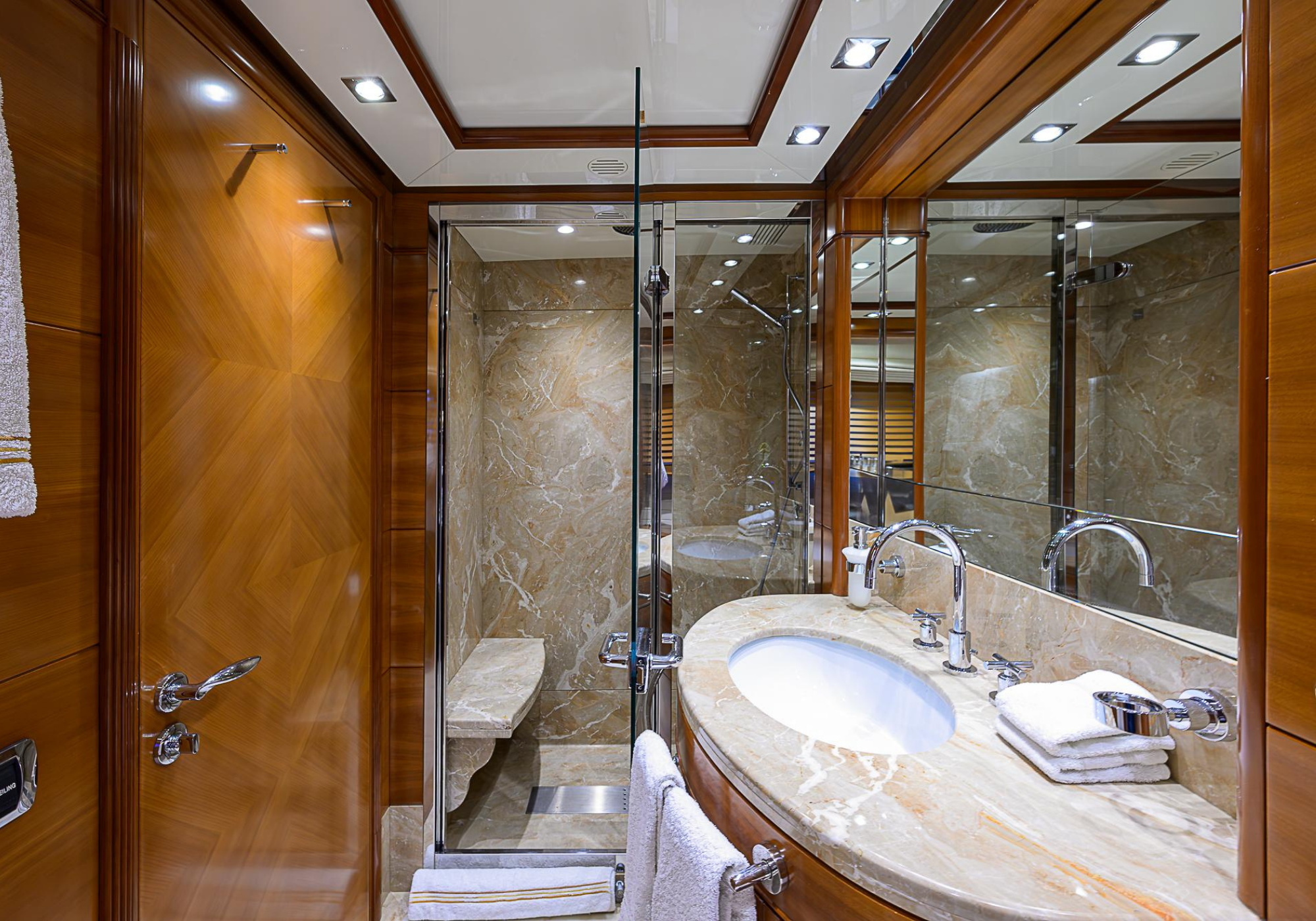 Lower Deck: The lower deck has four guest cabins accessible by the central staircase. The cabins are spacious and bright thanks to the use of light colored cherry and large port holes. The two doubles are located aft and have private bathrooms, dressing tables and wardrobes. The twin cabins located forward and also have private bathrooms, dressing tables and wardrobes. Main Deck: The owner's cabin occupies the forward part of the main deck. The cabin has panoramic windows and a central bed that allows for 180° views. The suite is accessed by way of an adjacent office and there are two bathrooms: 'his' with a shower, and 'hers' with a Jacuzzi that looks onto one of the large perimeter windows. A separate dressing room is located off to port, adjacent 'her' bathroom. A circular staircase is placed amidships adjacent to the galley and disserves the guest quarters. The main saloon is located in the aft portion of the main deck. It is particularly large as the owner requested that the dinning saloon be re-located to the upper deck. The saloon is open-planned which allows various activities to be carried on at the same time and the floor is embellished by wood squares with the grain running in different directions. The aft deck is spacious and is an ideal open air relaxation area with C-shaped sofa, a table and two armchairs. Two stairways run aft from this zone down to the large swimming platform. Upper Deck: The original upper deck plan has been modified on the owners request to accommodate a circular dining room enclosed by glass windows. By opening these windows, the area can be easily transformed into an open-air zone whilst remaining protected from sun, rain and indiscreet eyes. Forward of the dining room, is a second saloon with two L-shaped sofas, coffee tables and a small bar. The forward section of the upper deck is devoted to navigation with a very well designed bridge that offers excellent all round vision. Sun Deck: The exceptionally large sundeck has plenty of sunbathing cushions aft, linked to two C- shaped elements forward that surround a Jacuzzi pool. There's also a bar on this deck with a fridge. The central zone is entirely occupied by the open air dining area and is protected from sun and rain by a custom canopy. Forward are two mirrored sofa areas facing the bow, with chairs and tables and are divided by a center passageway