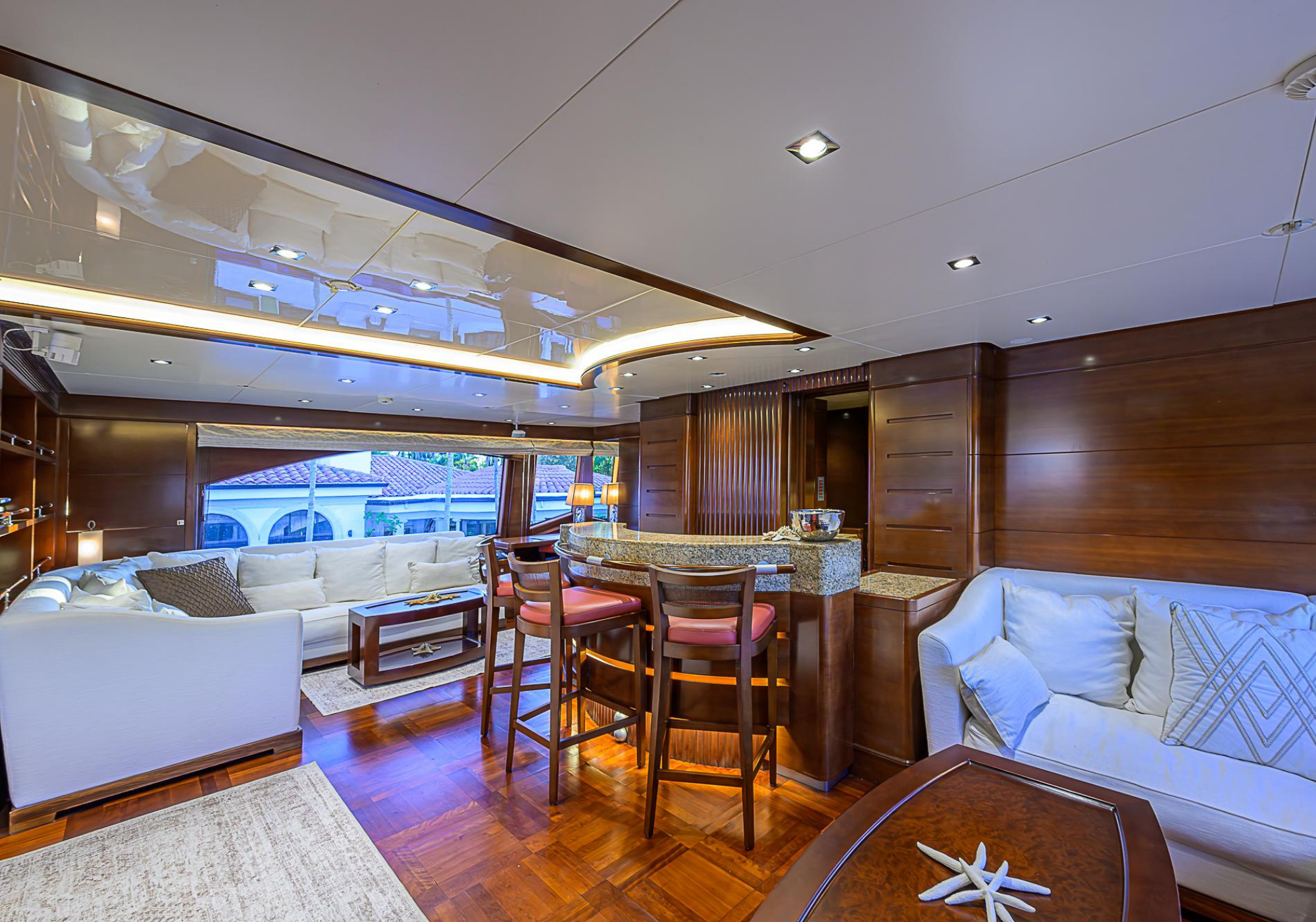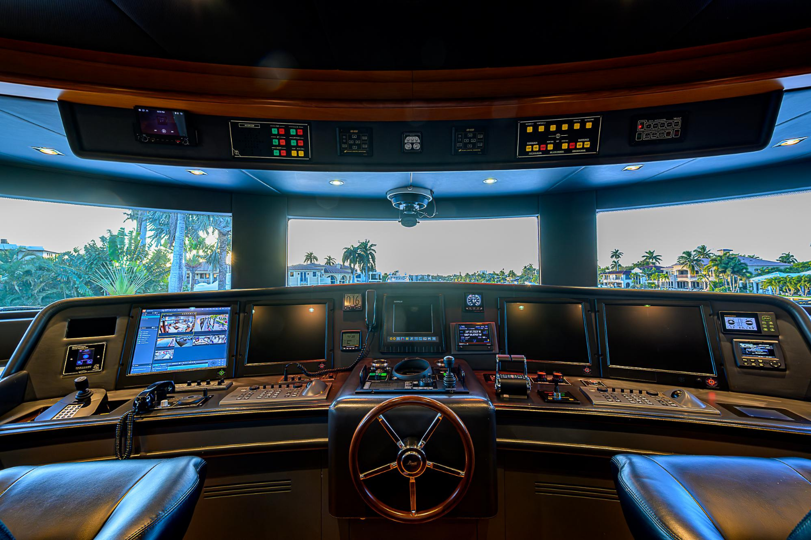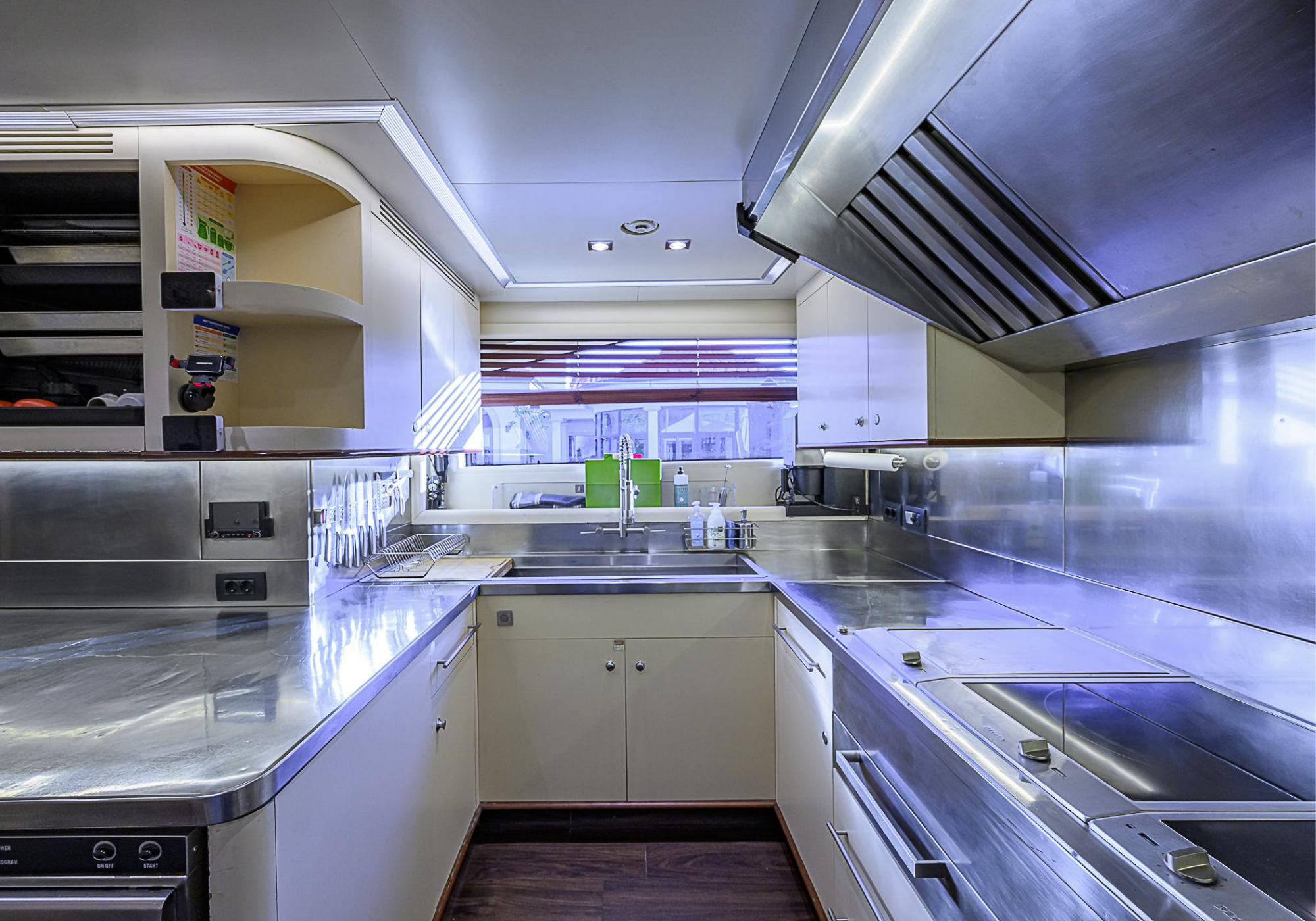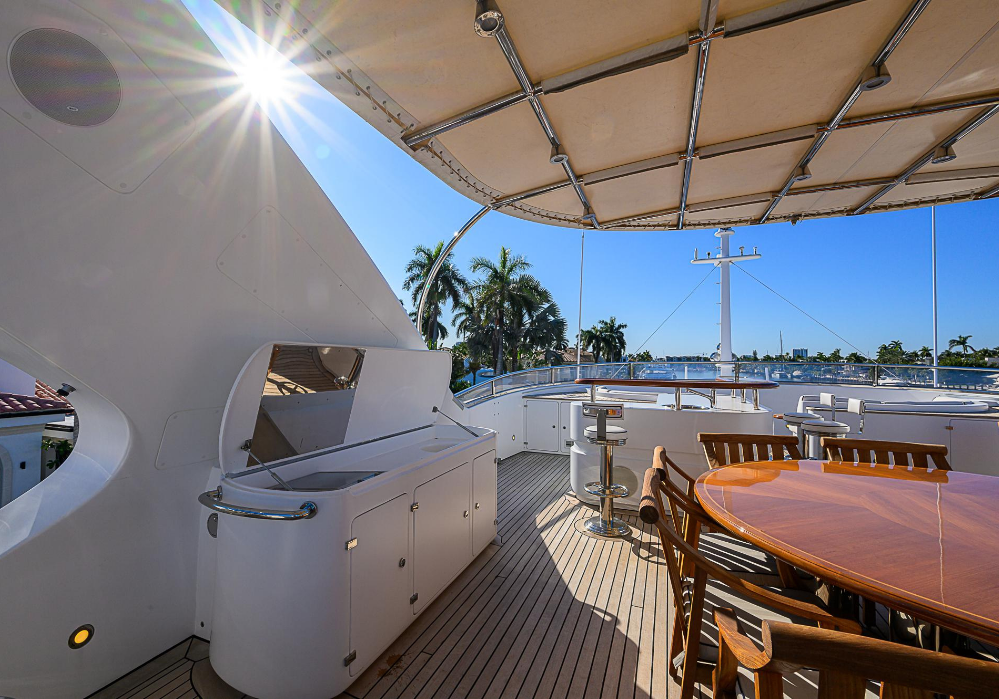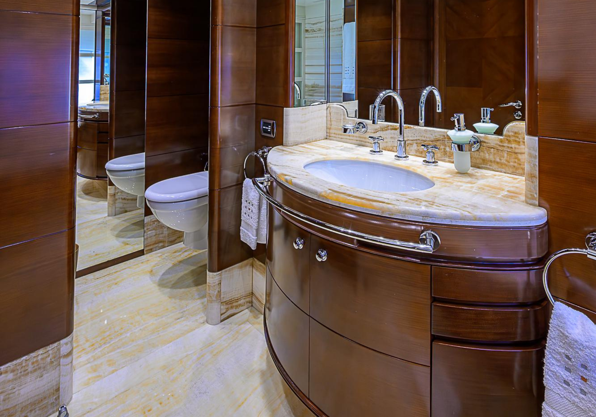 Lower Deck: The lower deck has four guest cabins accessible by the central staircase. The cabins are spacious and bright thanks to the use of light colored cherry and large port holes. The two doubles are located aft and have private bathrooms, dressing tables and wardrobes. The twin cabins located forward and also have private bathrooms, dressing tables and wardrobes. Main Deck: The owner's cabin occupies the forward part of the main deck. The cabin has panoramic windows and a central bed that allows for 180° views. The suite is accessed by way of an adjacent office and there are two bathrooms: 'his' with a shower, and 'hers' with a Jacuzzi that looks onto one of the large perimeter windows. A separate dressing room is located off to port, adjacent 'her' bathroom. A circular staircase is placed amidships adjacent to the galley and disserves the guest quarters. The main saloon is located in the aft portion of the main deck. It is particularly large as the owner requested that the dinning saloon be re-located to the upper deck. The saloon is open-planned which allows various activities to be carried on at the same time and the floor is embellished by wood squares with the grain running in different directions. The aft deck is spacious and is an ideal open air relaxation area with C-shaped sofa, a table and two armchairs. Two stairways run aft from this zone down to the large swimming platform. Upper Deck: The original upper deck plan has been modified on the owners request to accommodate a circular dining room enclosed by glass windows. By opening these windows, the area can be easily transformed into an open-air zone whilst remaining protected from sun, rain and indiscreet eyes. Forward of the dining room, is a second saloon with two L-shaped sofas, coffee tables and a small bar. The forward section of the upper deck is devoted to navigation with a very well designed bridge that offers excellent all round vision. Sun Deck: The exceptionally large sundeck has plenty of sunbathing cushions aft, linked to two C- shaped elements forward that surround a Jacuzzi pool. There's also a bar on this deck with a fridge. The central zone is entirely occupied by the open air dining area and is protected from sun and rain by a custom canopy. Forward are two mirrored sofa areas facing the bow, with chairs and tables and are divided by a center passageway