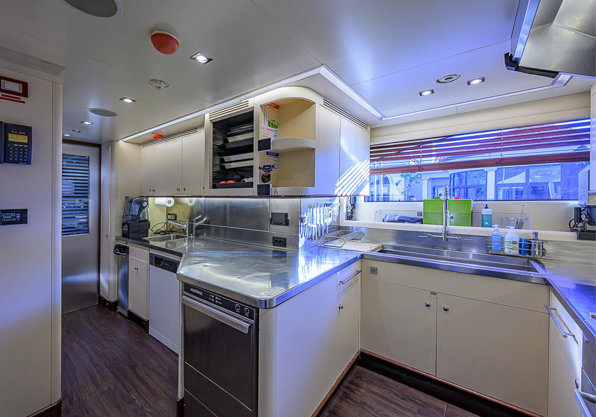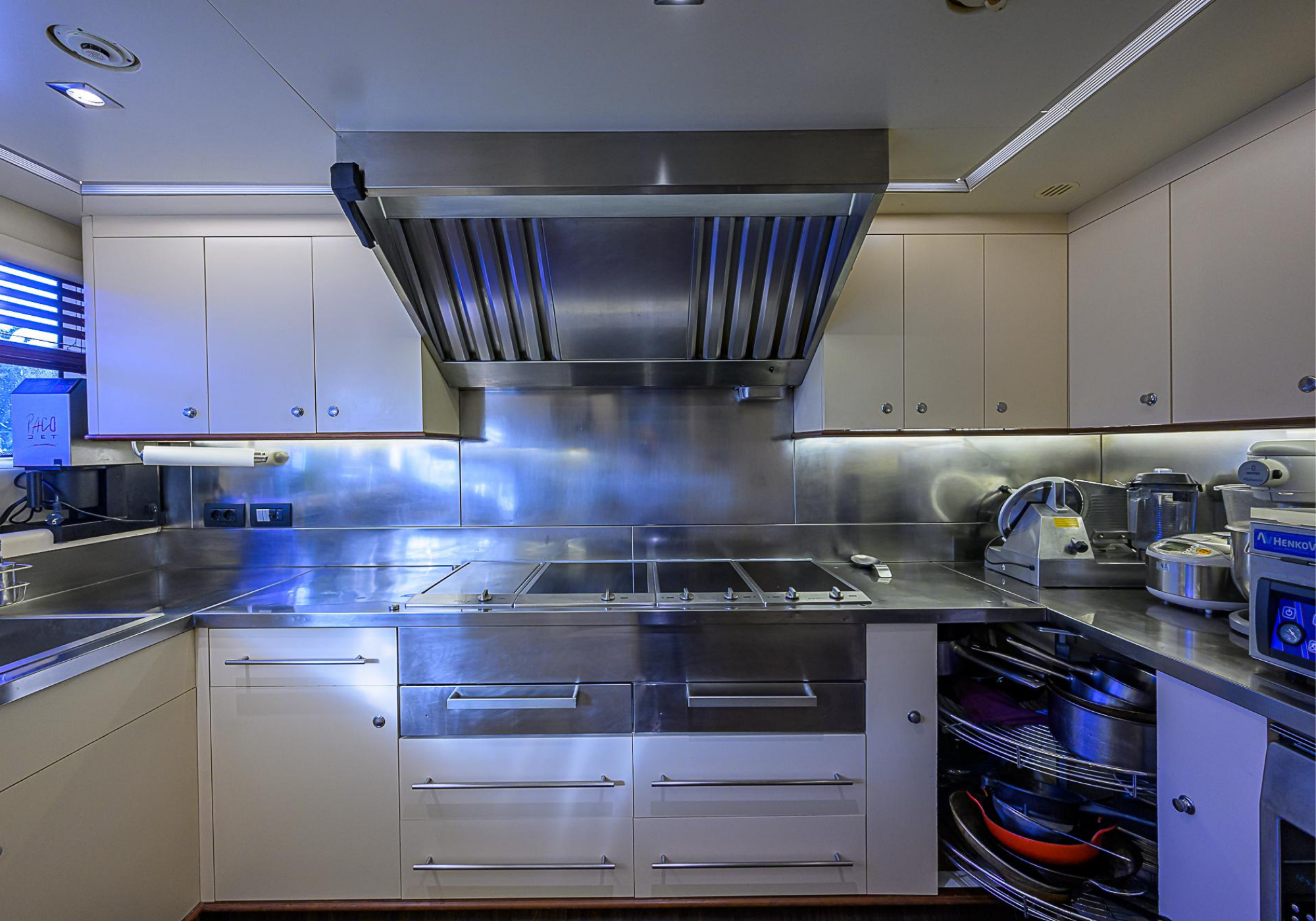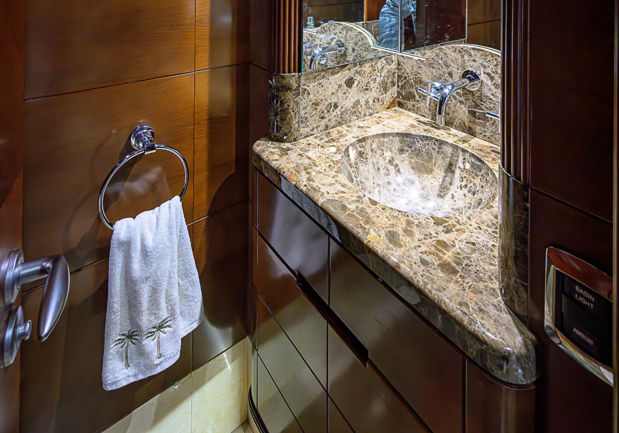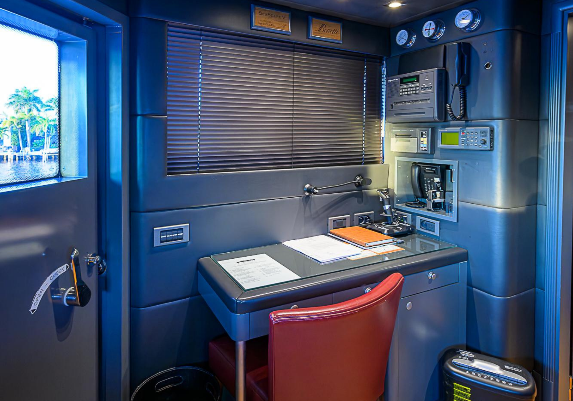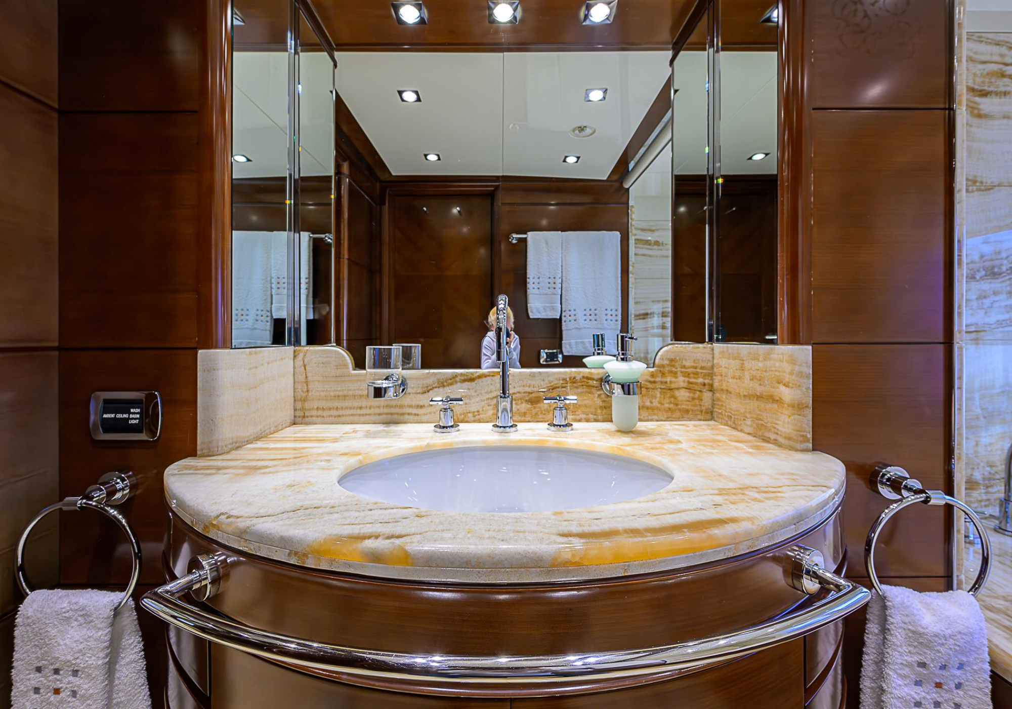 Lower Deck: The lower deck has four guest cabins accessible by the central staircase. The cabins are spacious and bright thanks to the use of light colored cherry and large port holes. The two doubles are located aft and have private bathrooms, dressing tables and wardrobes. The twin cabins located forward and also have private bathrooms, dressing tables and wardrobes. Main Deck: The owner's cabin occupies the forward part of the main deck. The cabin has panoramic windows and a central bed that allows for 180° views. The suite is accessed by way of an adjacent office and there are two bathrooms: 'his' with a shower, and 'hers' with a Jacuzzi that looks onto one of the large perimeter windows. A separate dressing room is located off to port, adjacent 'her' bathroom. A circular staircase is placed amidships adjacent to the galley and disserves the guest quarters. The main saloon is located in the aft portion of the main deck. It is particularly large as the owner requested that the dinning saloon be re-located to the upper deck. The saloon is open-planned which allows various activities to be carried on at the same time and the floor is embellished by wood squares with the grain running in different directions. The aft deck is spacious and is an ideal open air relaxation area with C-shaped sofa, a table and two armchairs. Two stairways run aft from this zone down to the large swimming platform. Upper Deck: The original upper deck plan has been modified on the owners request to accommodate a circular dining room enclosed by glass windows. By opening these windows, the area can be easily transformed into an open-air zone whilst remaining protected from sun, rain and indiscreet eyes. Forward of the dining room, is a second saloon with two L-shaped sofas, coffee tables and a small bar. The forward section of the upper deck is devoted to navigation with a very well designed bridge that offers excellent all round vision. Sun Deck: The exceptionally large sundeck has plenty of sunbathing cushions aft, linked to two C- shaped elements forward that surround a Jacuzzi pool. There's also a bar on this deck with a fridge. The central zone is entirely occupied by the open air dining area and is protected from sun and rain by a custom canopy. Forward are two mirrored sofa areas facing the bow, with chairs and tables and are divided by a center passageway