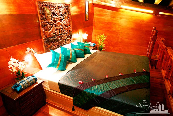 Luxury yacht Siam Junk can accommodate 12 to 20 guests in 6 cabins. All six bedrooms are finished to a high standard and come with king size beds, en-suite bathrooms with powerful hot and cold water showers, hot and cold water wash basins, full sized WC, hairdryer and complimentary bathrobes. With additional bunk beds and convertible tables the overnight accommodation increases from six couples in double bedded rooms to a maximum of twenty guests sharing. The air-conditioned Siam Suite is located below deck forward and measures 37 square metres, the curved hull and raised bed creating a wonderful tiered effect. The large bathroom contains a spa shower and WC. The Sea Breeze Suite is situated on the stern at the upper level of the boat commanding panoramic views from the windows and patio style doors. A private sun deck extends the internal area to a total of 60 square metres. For families it is possible to include two extra double beds in the Sea Breeze Suite. The remaining 4 cabins are located below decks amid ships and have private ensuite facilities.