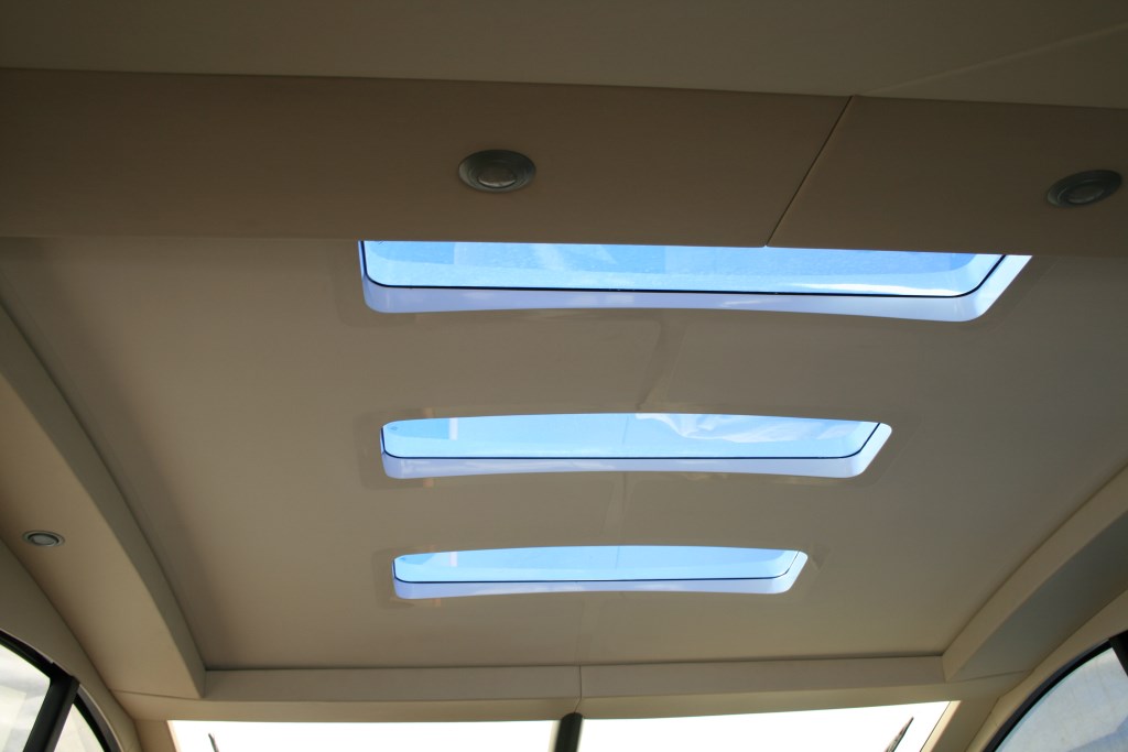 The motor yacht SIGMA has a light airy interior, with honey toned woods and neutral soft furnishings. The salon benefits from plenty of natural light, thanks to elongated side windows, a large sliding glass door aft, full beam forward windscreen and retractable roof. The salon offers a large U shaped sofa and dining table on the starboard side, while to port is an occasional chair and TV entertainment. Forward of the salon, is the state of the art navigation station and helm, with further seating to port. A curved stairs case on the forward port side leads to the fully equipped galley, continuing on to the 3 guest cabins.