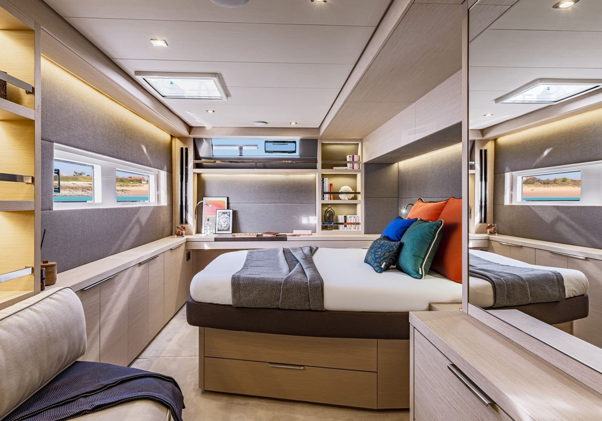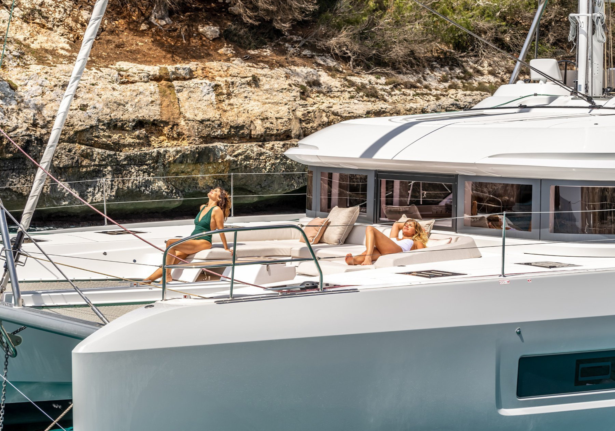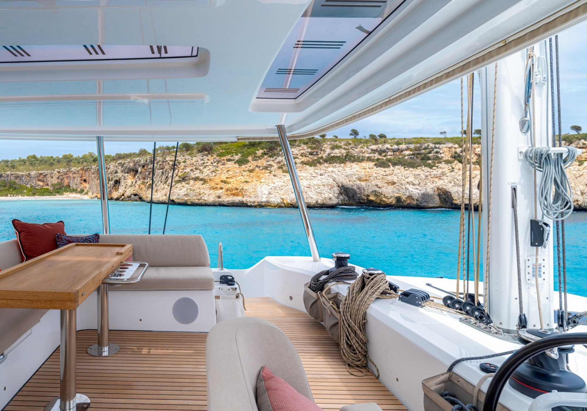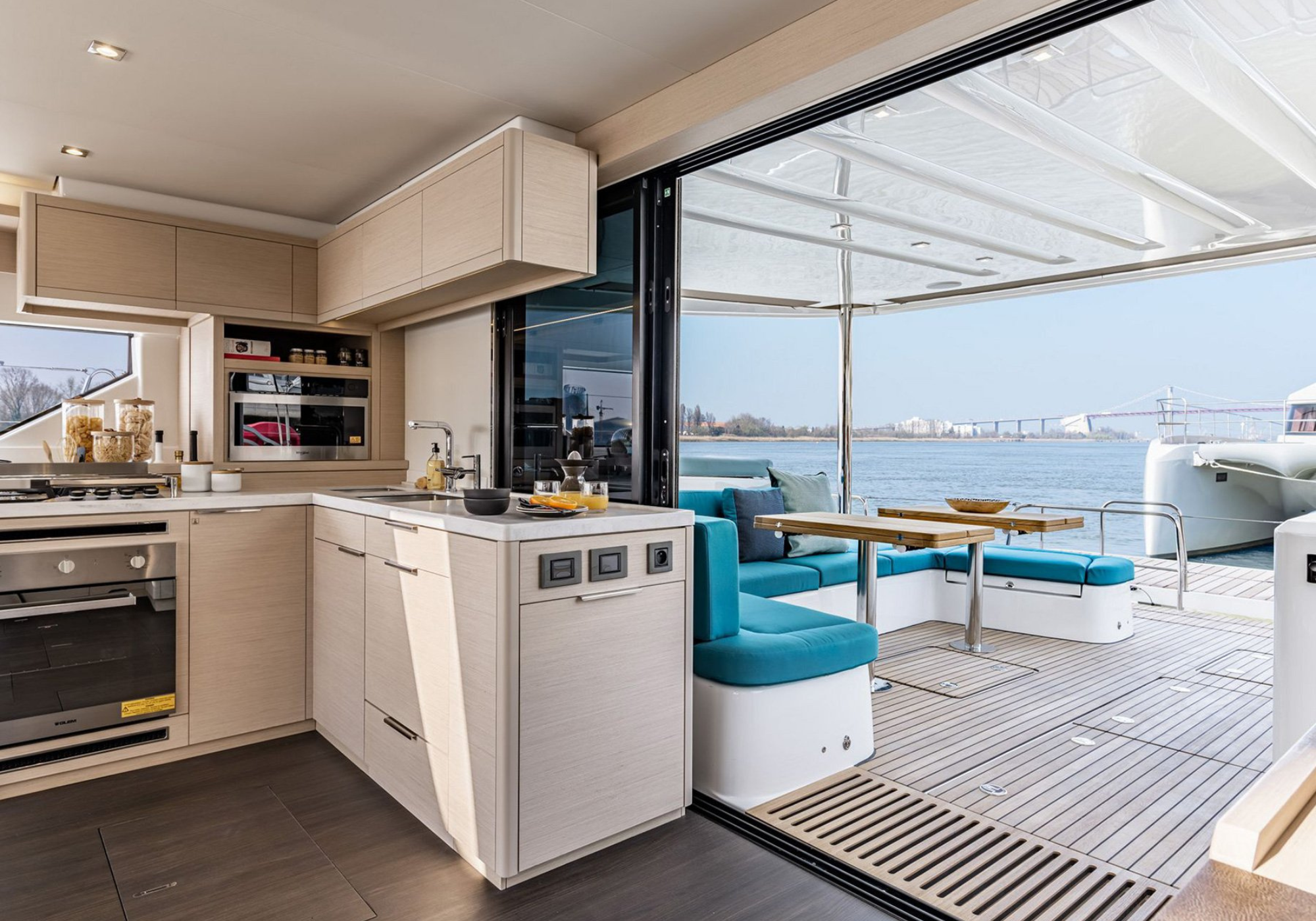 SOFIA’s multihull configuration provides remarkable stability and expansive deck areas, creating an ideal setting for relaxed Mediterranean cruising. The aft cockpit is arranged for sociable dining and lounging, seamlessly connected to the saloon through wide sliding doors, allowing guests to move effortlessly between interior and exterior spaces.