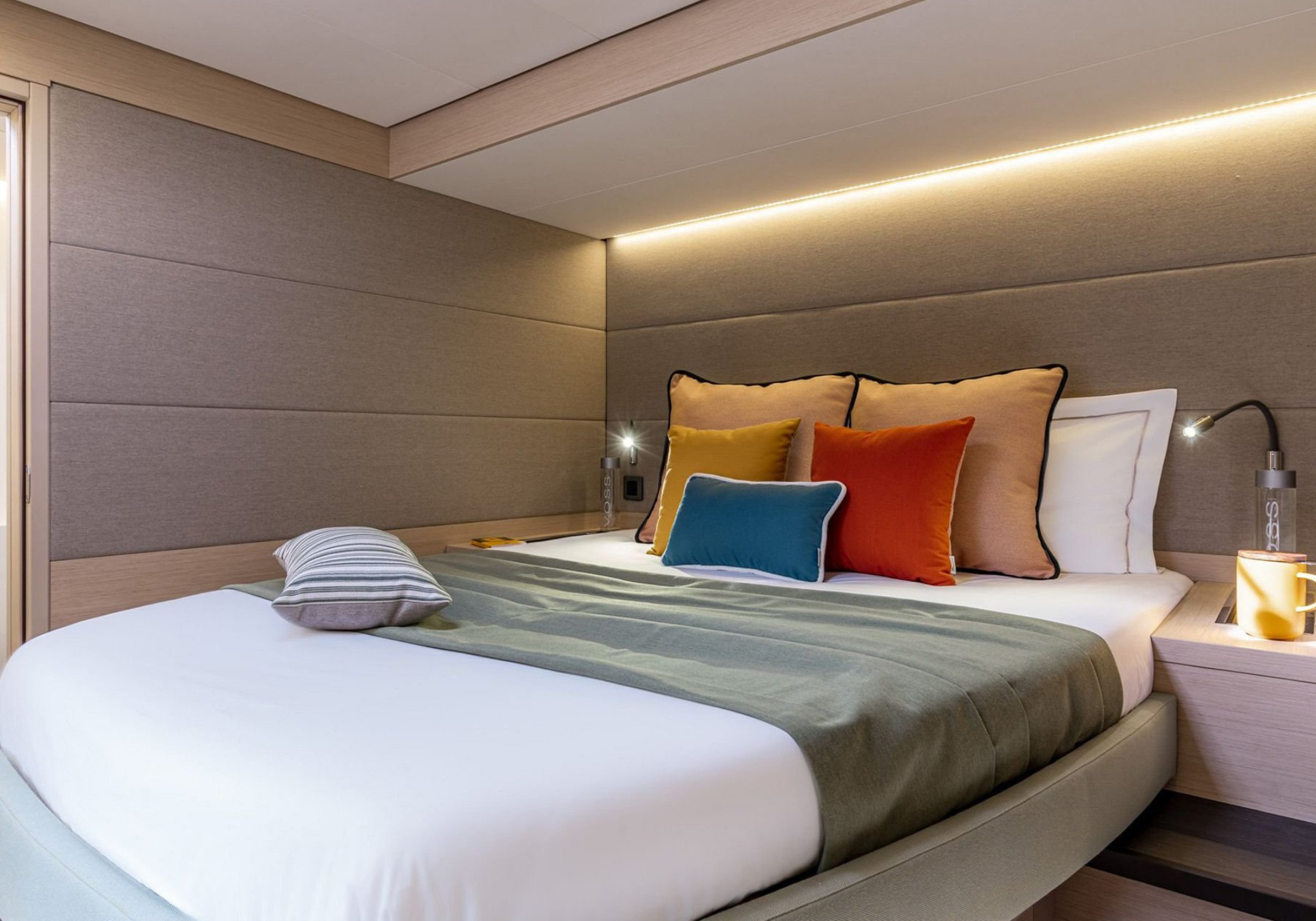 SOFIA accommodates up to 10 guests across five cabins: ~ Three double cabins – each with double bed and private en suite bathroom ~ Two convertible cabins – twin beds that can be configured as doubles, each with en suite facilities The layout offers flexibility for families or groups of friends, ensuring privacy and comfort for every guest.