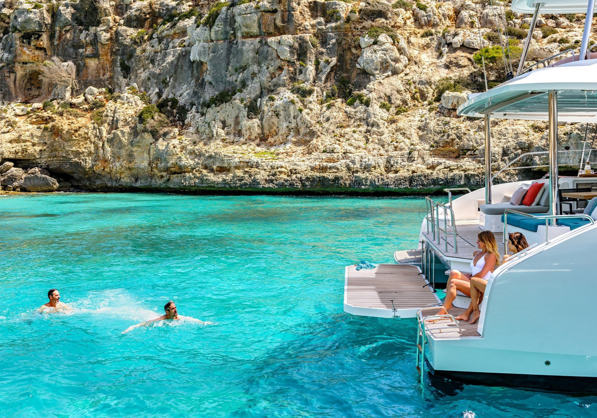 At the stern, easy access steps lead down to the water, where guests can swim, launch paddleboards or simply enjoy the tranquillity of a secluded anchorage.