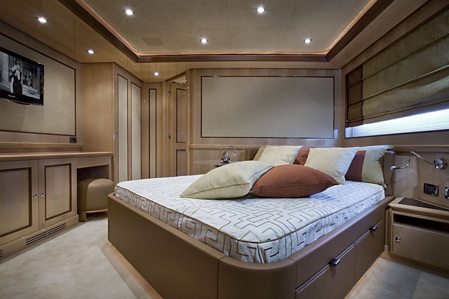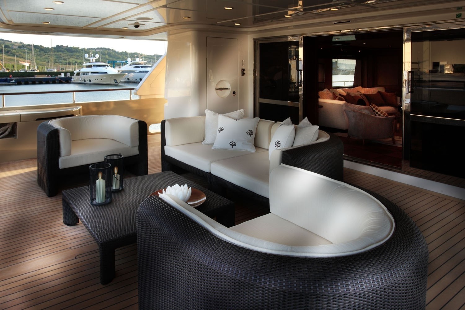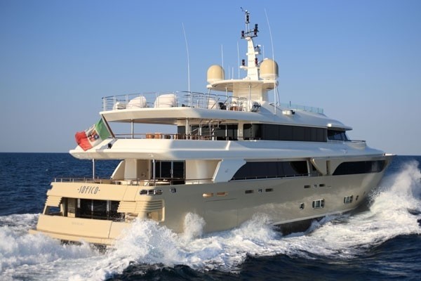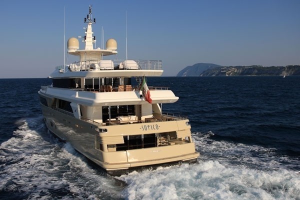 The yacht's wider design collaboration came from Crn and Studio Zuccon International Project. The formal naval architect plans are a work of Crn. Motor Yacht SOFICO received her stylish interior designing from the interior design company of Studio Zuccon International Project. In 2009 she was formally launched with triumph in Ancona and post sea trials and finishing touches was then handed over to the yacht owner. Crn Yachts (Ferretti Group) completed their new build motor yacht in Italy. A fairly large area is manifested with a maximum beam (width) of 8.65 metres or 28.4 feet. With a 2.3m (7.6ft) draught (maximum depth) she is reasonably shallow. The material composite was used in the building of the hull of the motor yacht. Her superstructure over the hull is fashioned with the use of composite.