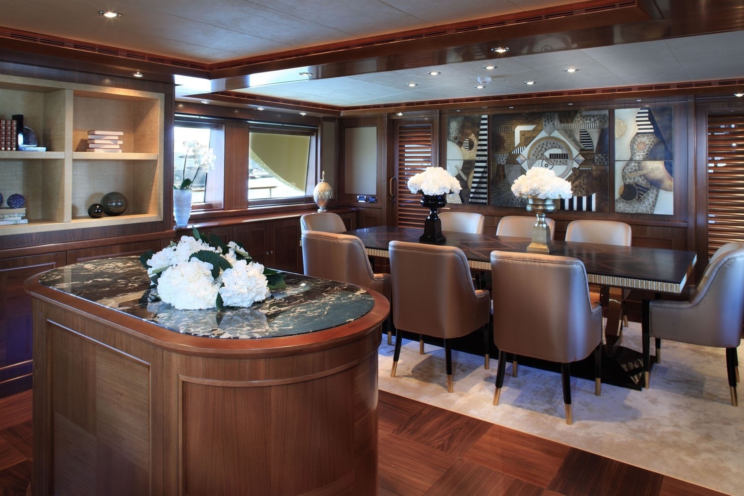 M/Y SOFICO is the fourth maxi-yacht of the CRN 43 composite line. Her displacement hull is a desert sand caramel colour, she has four decks, a bulbous hull and can sleep 10 passengers and 9 crewmembers. She also boasts a techno gym workout room and a sauna in the stern of the lower deck, an area with access to the sea thanks to a stern hatch that converts to a swim platform. Her interior has elegant linear Art Deco motifs and features canaletto walnut and a light-hued, natural cherry wood. Materials such as the parquet flooring interspersed with ample inlays of silk carpeting adds a special touch to the interior.
