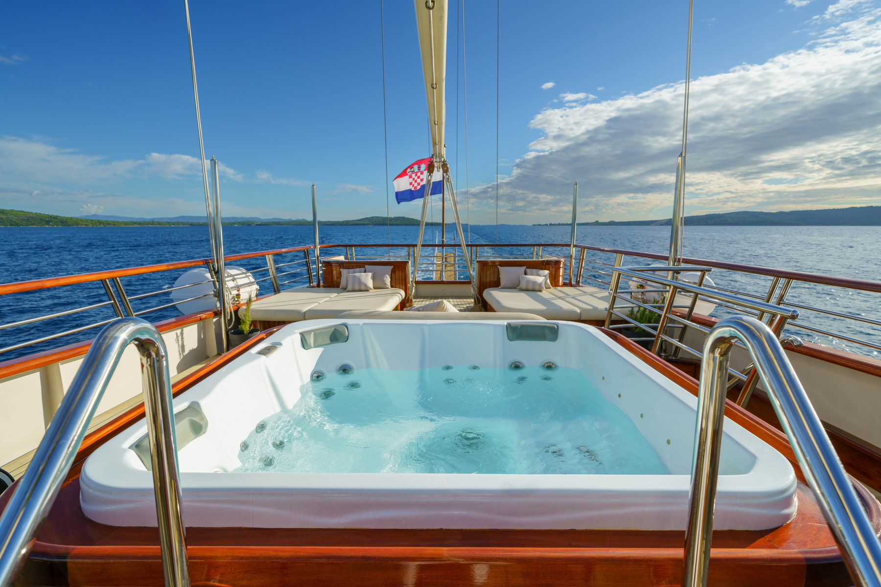 Steps to port lead up to the magnificent sun deck – a spacious terrace including a bar and adjacent sofas/day beds, a luxurious jacuzzi and various sun bed arrangements. The views are perfect and at night an outdoor cinema can be created or music played for guests to dance the night away.