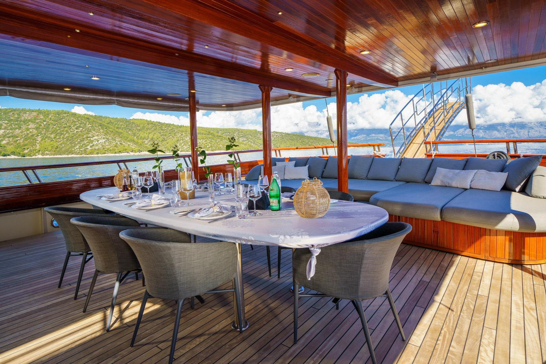 Her elegant profile gives a glimpse of the delights which await guests as they board at the stern. The main deck aft benefits from being sheltered under the flybridge overhang and is configured with a dining table and two built-in corner sofas.