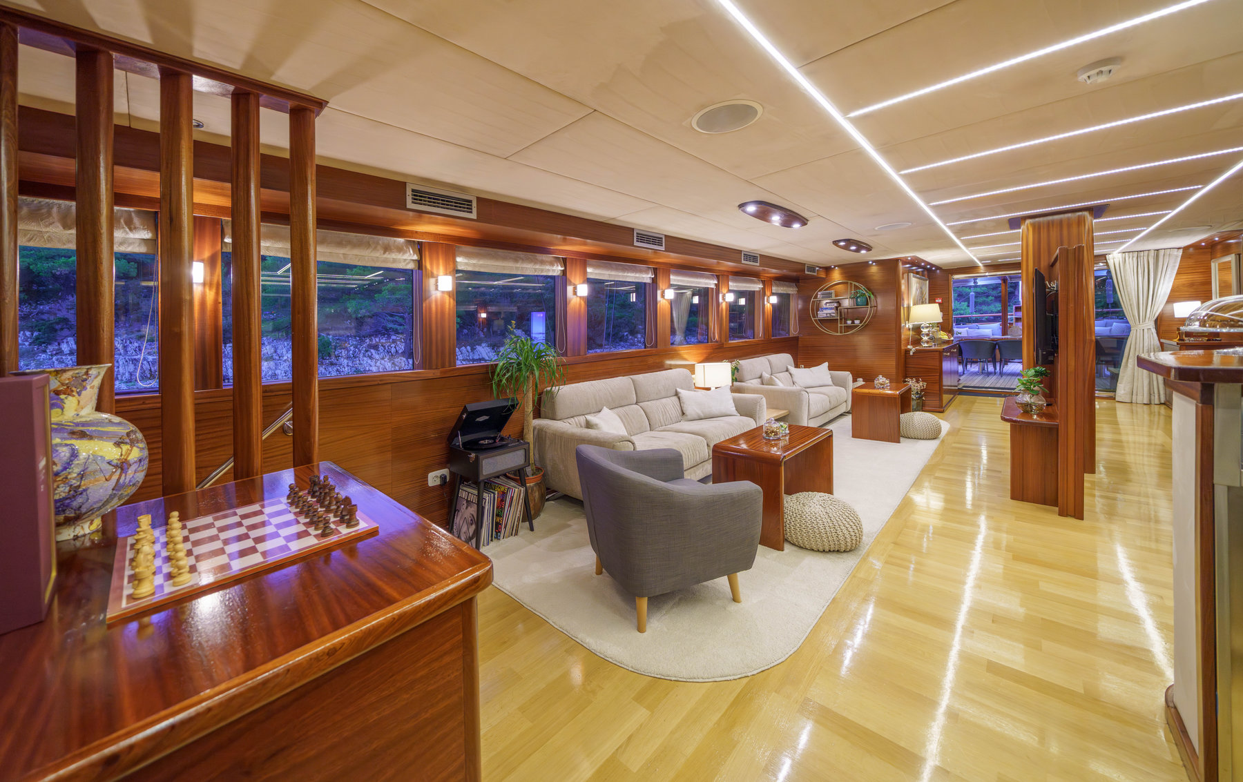 Heading inside, guests will be welcomed into a warm and elegant main salon zoned with a lounge, dining setting and bar. Rich wood finishes and neutral soft furnishings are highlighted by lots of natural light by day and intimate lighting at night. The two three-seater sofas offer plenty of space to relax, while the dining table can seat twelve guests for celebratory dinners.
