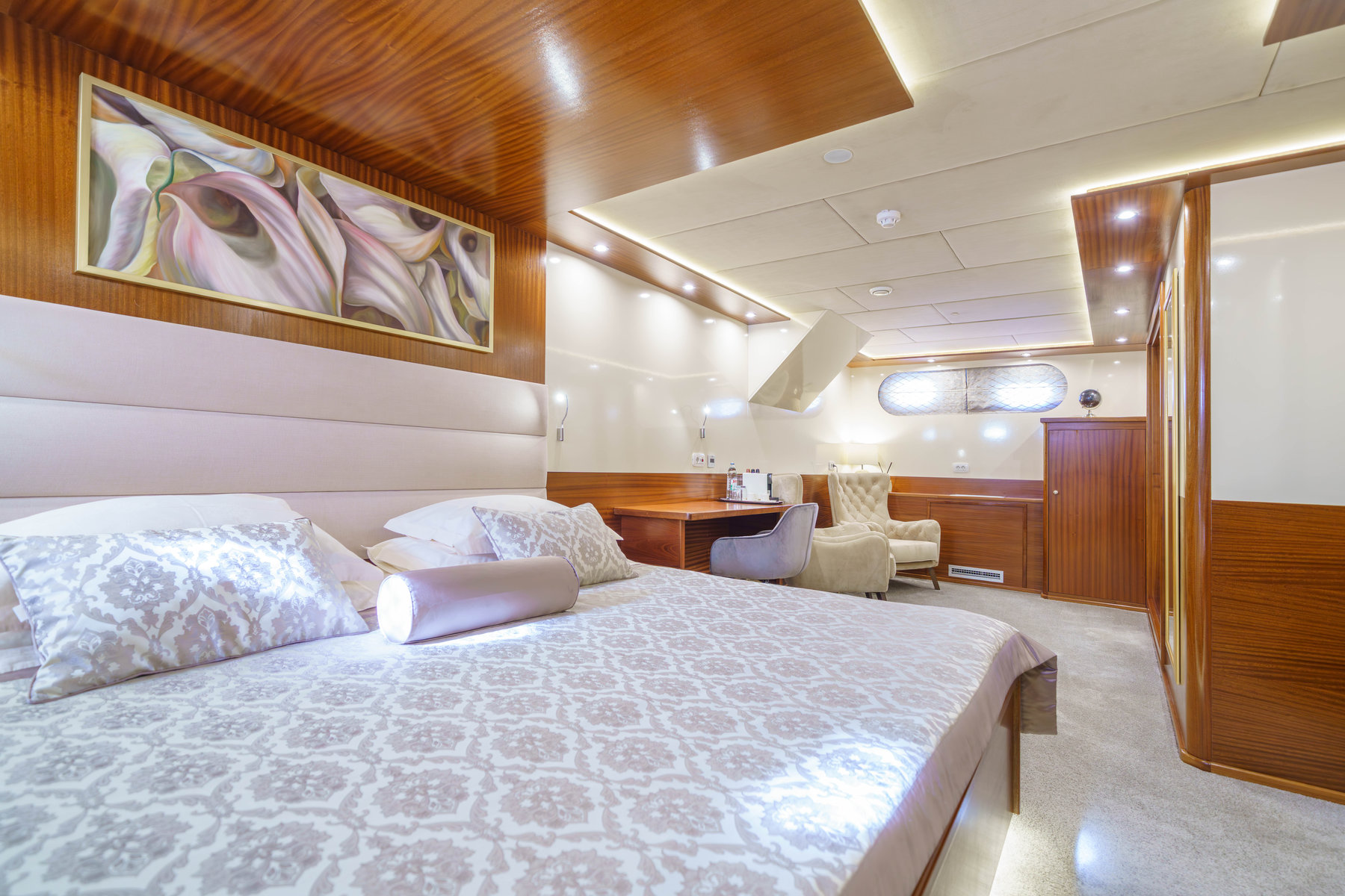 Guests will be able to unwind in the privacy of six luxury suites configured as a full beam master, four doubles and a twin. Two of the doubles are aft on the lower deck with their own private access from the main salon. The four amidships suites place the master furthest forward, the a double to starboard and a double and twin to port. All the suites benefit from the luxury and privacy of ensuite bathroom facilities. ~ The crew accommodation is in the bow and is accessed via a separate entrance. ~ No 1 master 34 m2, King size bed 200x200 cm ~ No 2 & 3 double bed 20m2 Queen size bed 180x200 cm ~ No 4 twin 14m2 bed size (2) 9 0x 19 0 cm ~ No 5 & 6 double bed 1 8 m2 Queen size bed 180x200 cm ~ Amenities: TV, Satellite TV, Safe box, Bluetooth & USB connectivity, AC