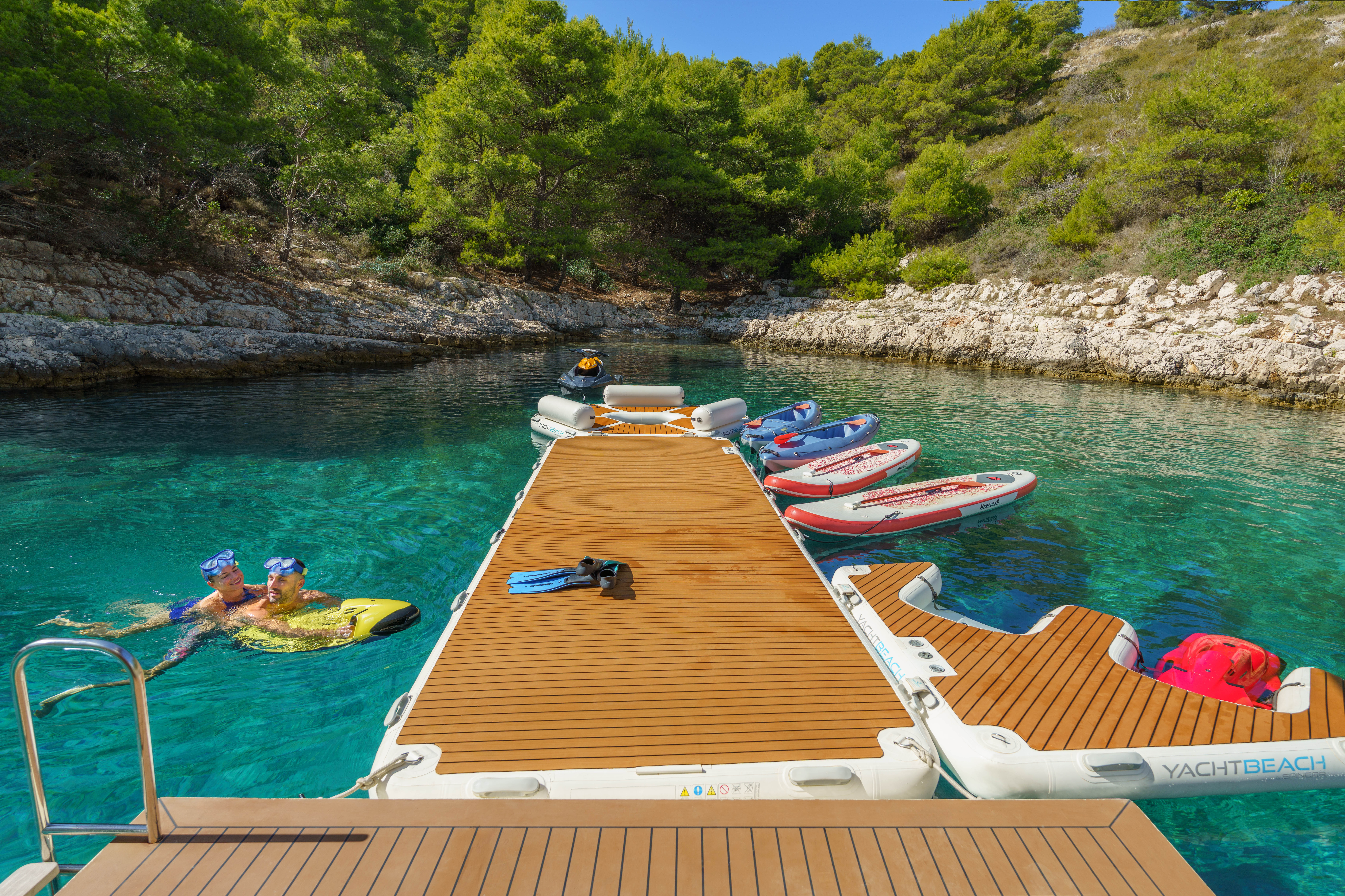 Tender + Toys: TENDER: 6.5 m, 175 HP WATER TOYS: ~Jet Ski, Water Ski for adults ~Waterski for children ~Sea Bob x2 ~Wakeboard ~Stand up paddle board x 4 ~Tube ~Donut ~Snorkelling equipment x 6 ~Fishing gear ~Kayak single seat x 2 ~8m platform with Sea Bob docks ///Audio Visual Equipment and Deck Facilities: ~TV ~Satellite TV ~DVD ~Bluetooth & USB connectivity ~AC ~SUN DECK OPEN CINEMA: 200x200cm screen with 100W sound system ~Jacuzzi ~Swim platform ~Lounge area ~Sun mattresses ~Deck shower ~Day-head ~Sunshades ///Gym equipment: ~Yoga mats x 4 ~Stepper machine ~Weights 4 x 2kg ~Dumbbell 2 x 8kg ~Sauna ~Jacuzzi on Sun Deck