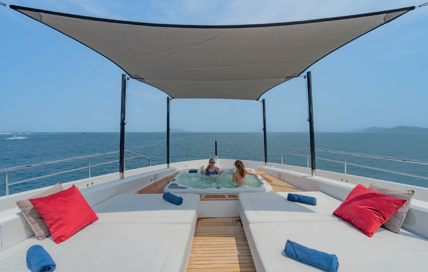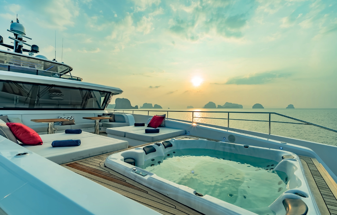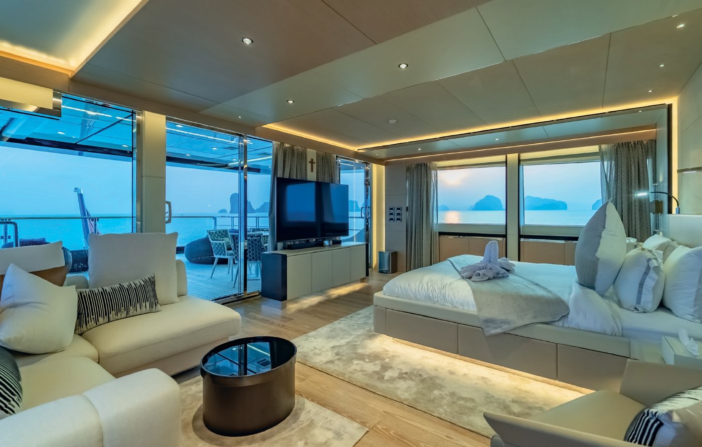Accommodation includes a spacious upper deck Owner’s suite (77sqm plus 42sqm private deck) with a luxurious marble bathroom and panoramic ocean views. The main deck VIP cabin (48sqm) and master cabin (king bed, walk-in wardrobe) offer opulent comfort. Four lower deck cabins provide flexible sleeping arrangements: two double cabins, one convertible double/twin, and one twin cabin, all en-suite. Each cabin features TVs, safes, showers or bathtubs, sofas, and premium amenities.