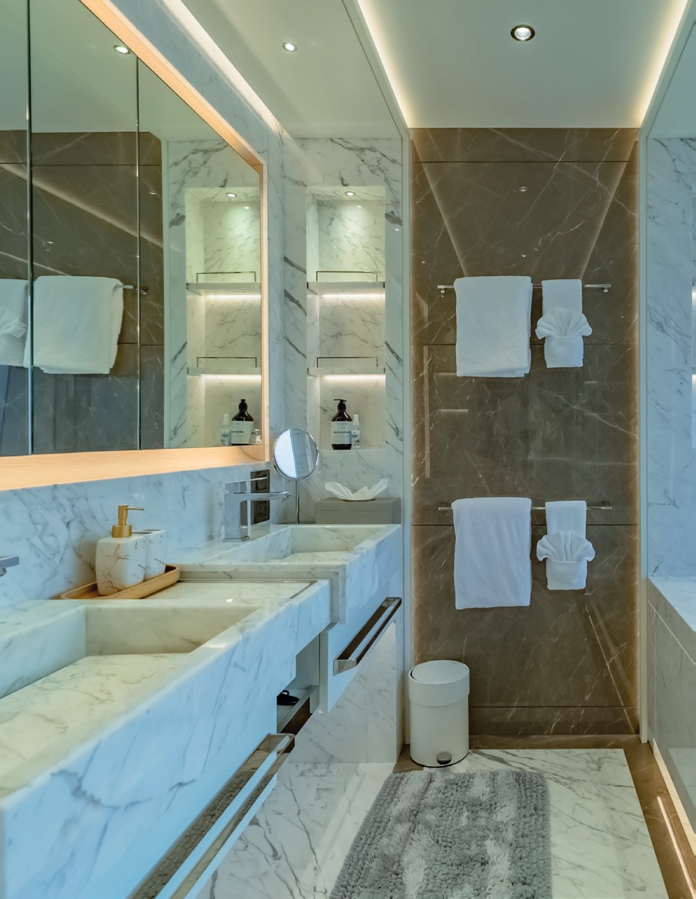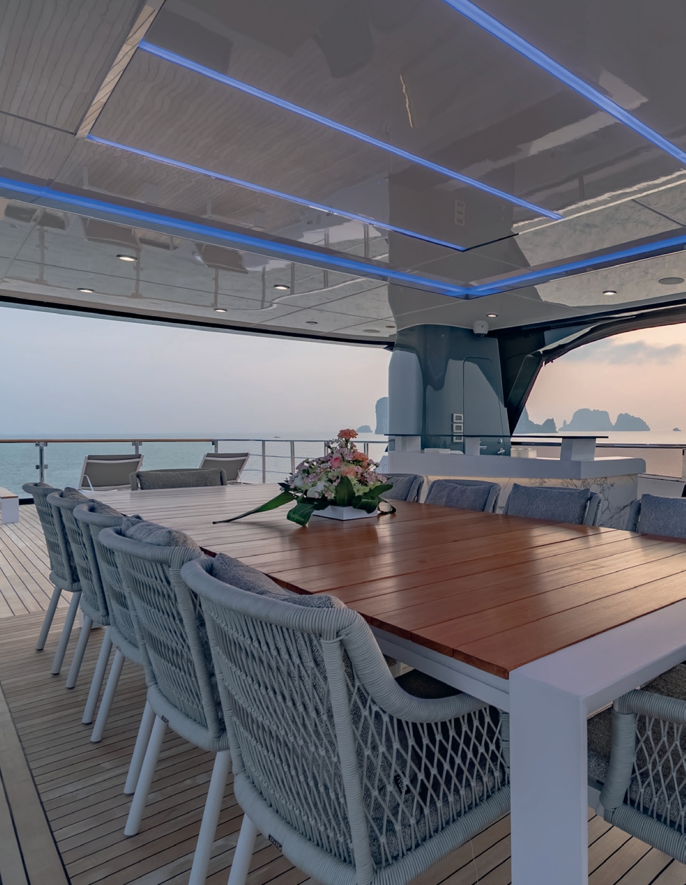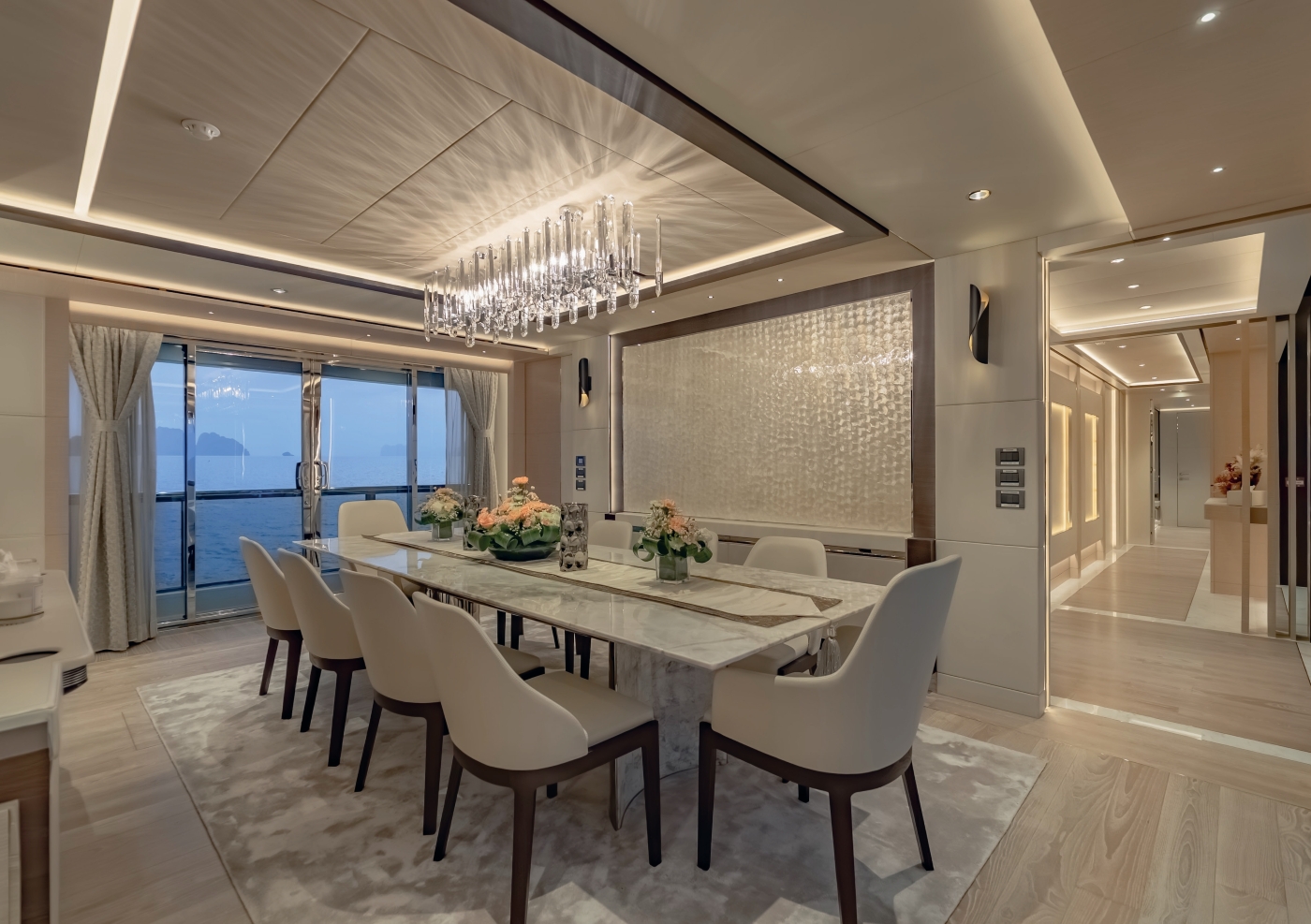 Accommodation includes a spacious upper deck Owner’s suite (77sqm plus 42sqm private deck) with a luxurious marble bathroom and panoramic ocean views. The main deck VIP cabin (48sqm) and master cabin (king bed, walk-in wardrobe) offer opulent comfort. Four lower deck cabins provide flexible sleeping arrangements: two double cabins, one convertible double/twin, and one twin cabin, all en-suite. Each cabin features TVs, safes, showers or bathtubs, sofas, and premium amenities.