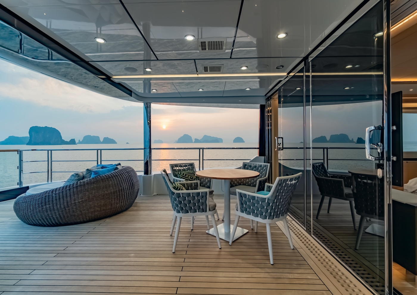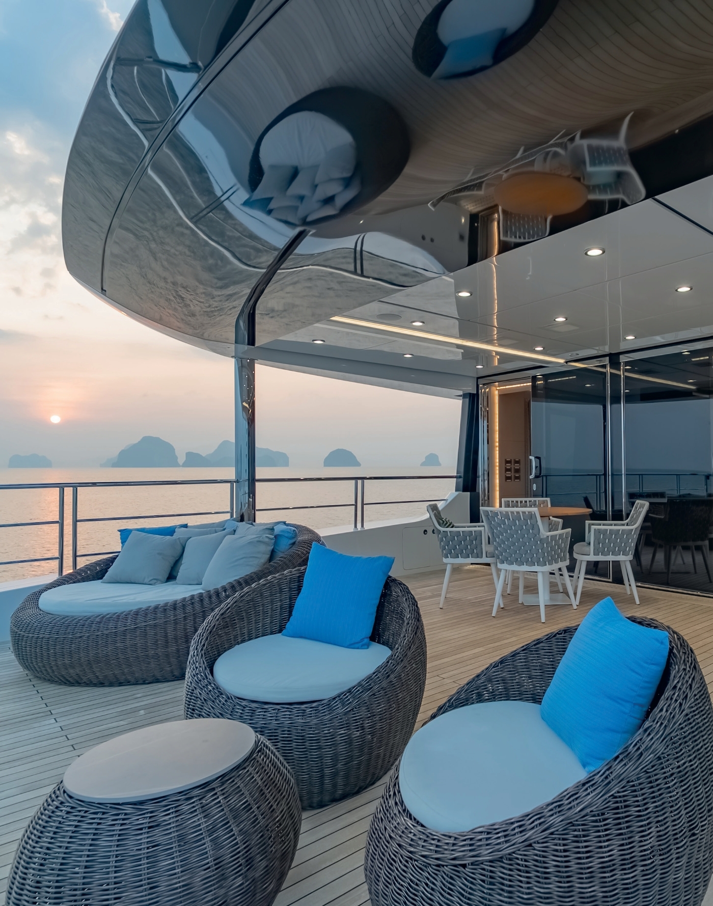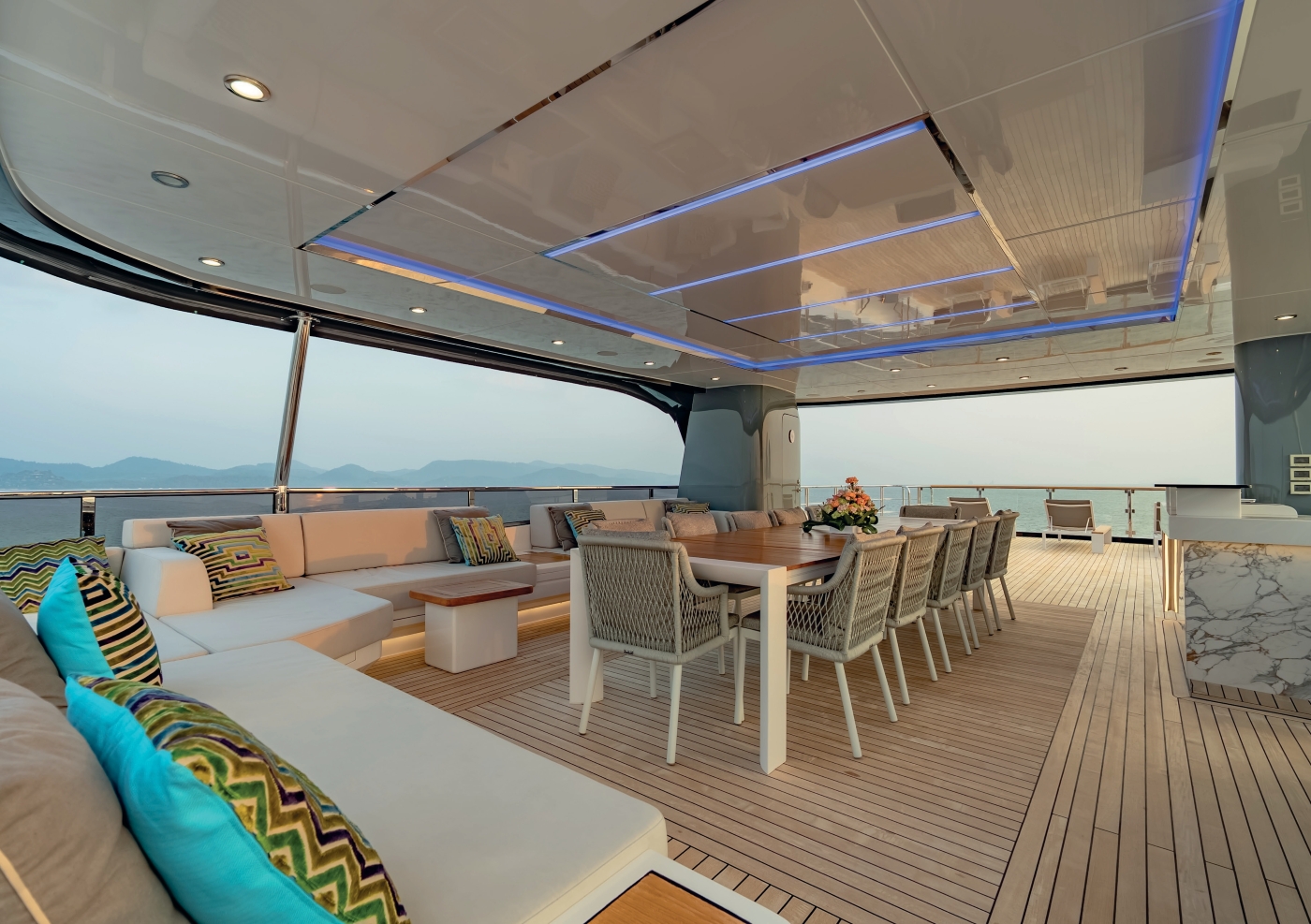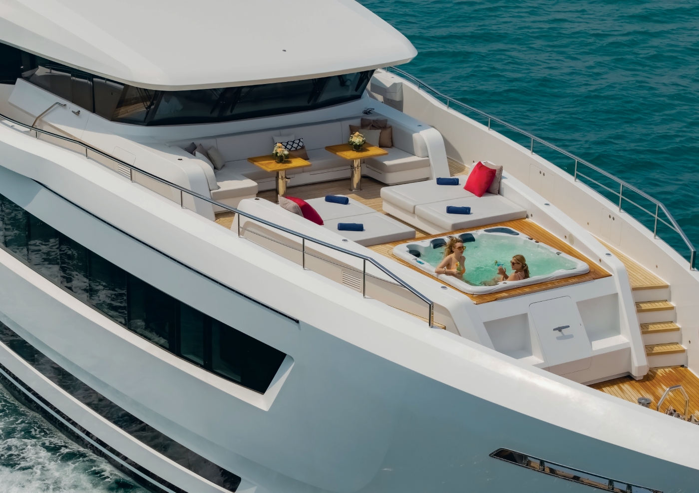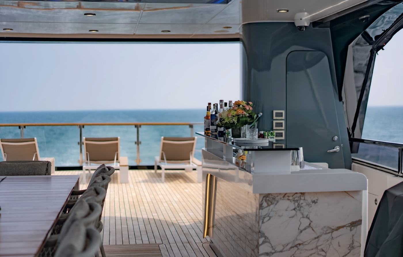 The yacht’s exterior is designed to maximize guest enjoyment and relaxation. The expansive swim platform leads to a serene beach club lounge with sofa and bar, ideal for shaded afternoons or post-water activity refreshments. The main deck aft features large glass doors and modular coffee tables that create a seamless indoor-outdoor flow. The upper deck Owner’s suite boasts a private terrace with panoramic aft views, while the forward Portuguese bridge offers sunpads and a Jacuzzi with optional shading. The massive sundeck combines a shaded dining area, American bar, and BBQ setup, perfect for sunset cocktails and moonlit gatherings.