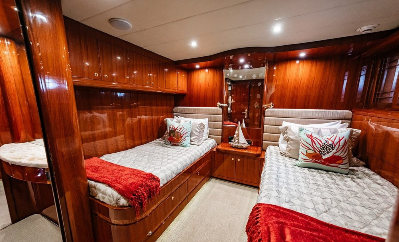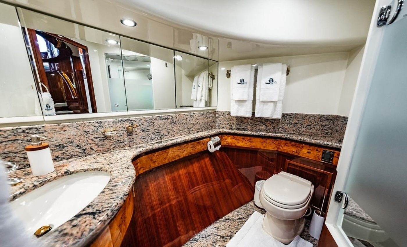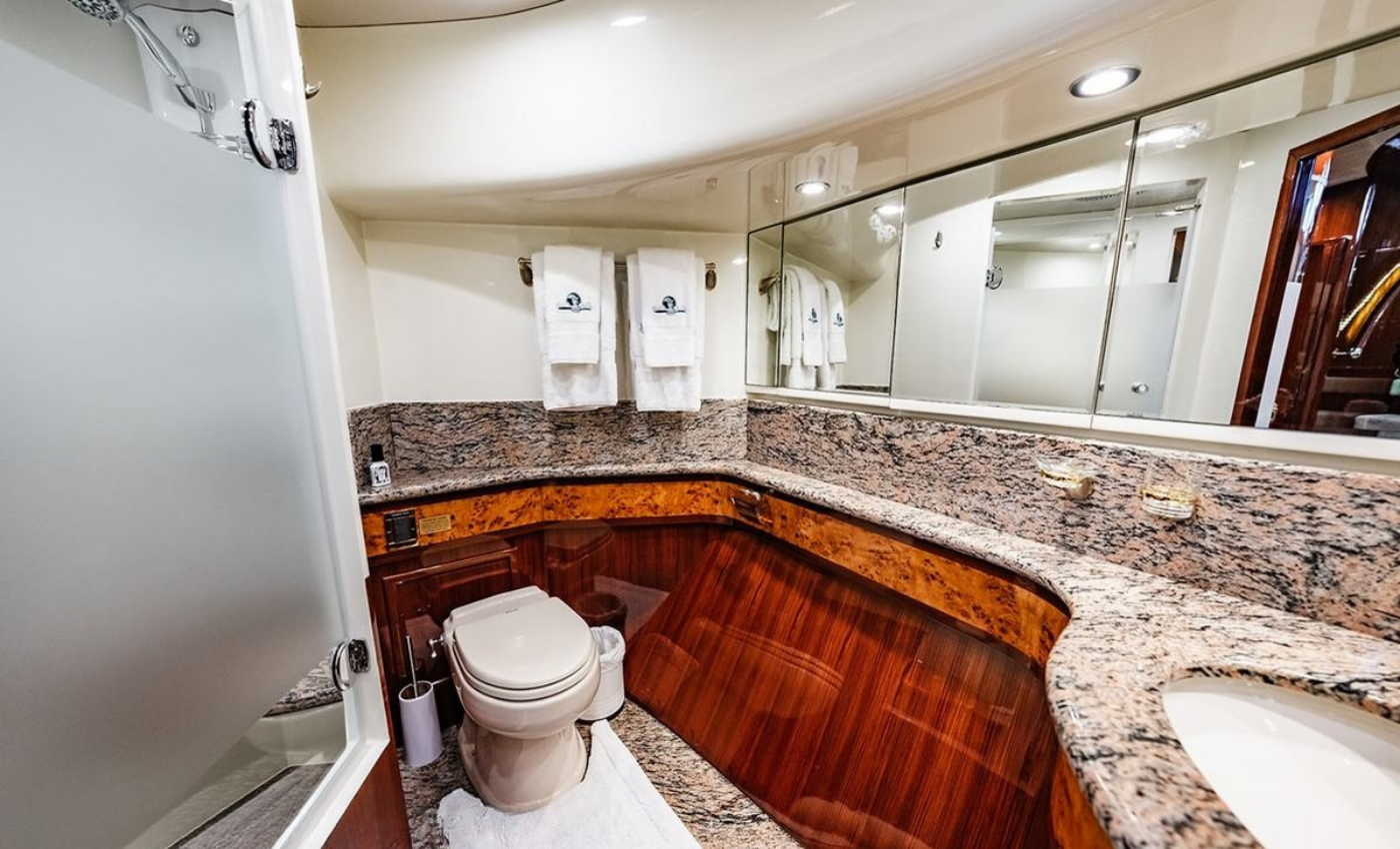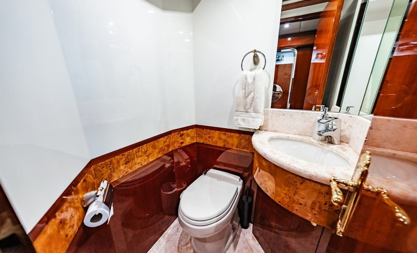 Master King (Owner) Cabin, main deck, forward. His‑and‑hers En‑suite heads with a dual‑access shower between. VIP King Cabin, lower deck (Forward Below). Large En‑suite VIP head with marble vanity and shower. Double Guest Cabin, lower deck, starboard side. En‑suite head. Twin Guest Cabin, lower deck, port side. En‑suite head.