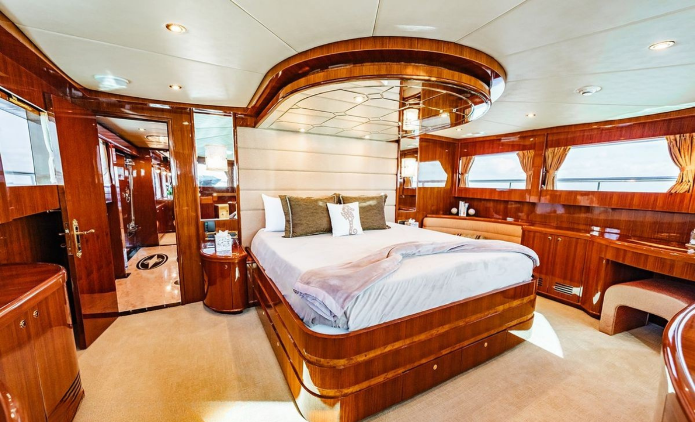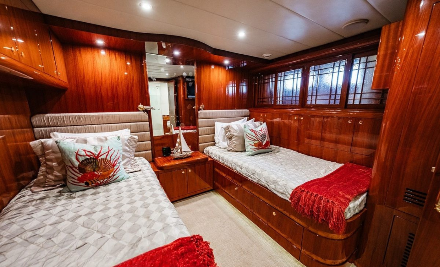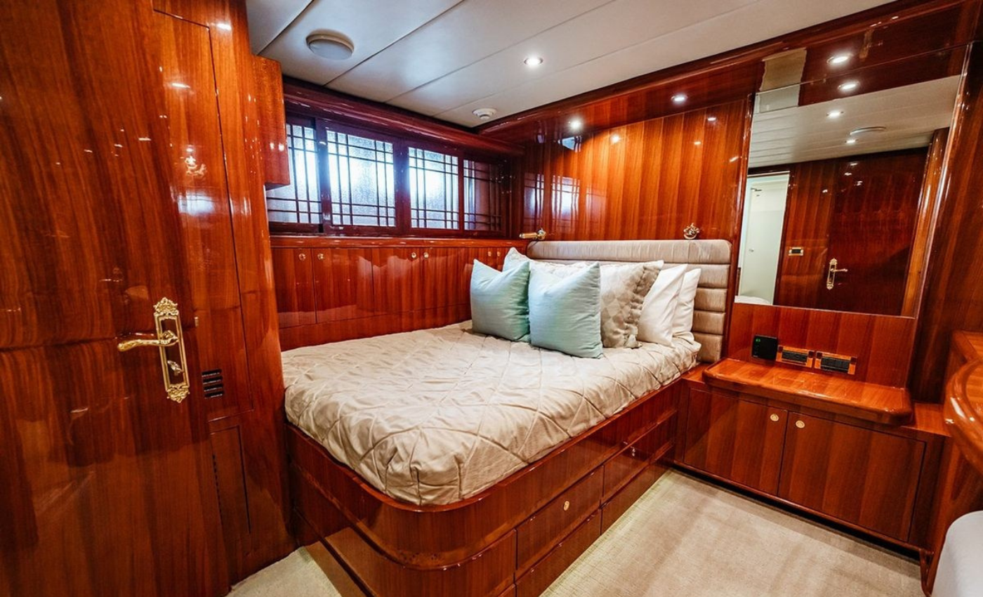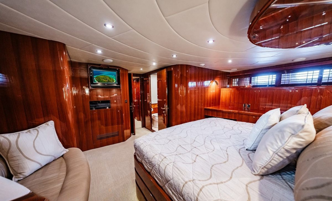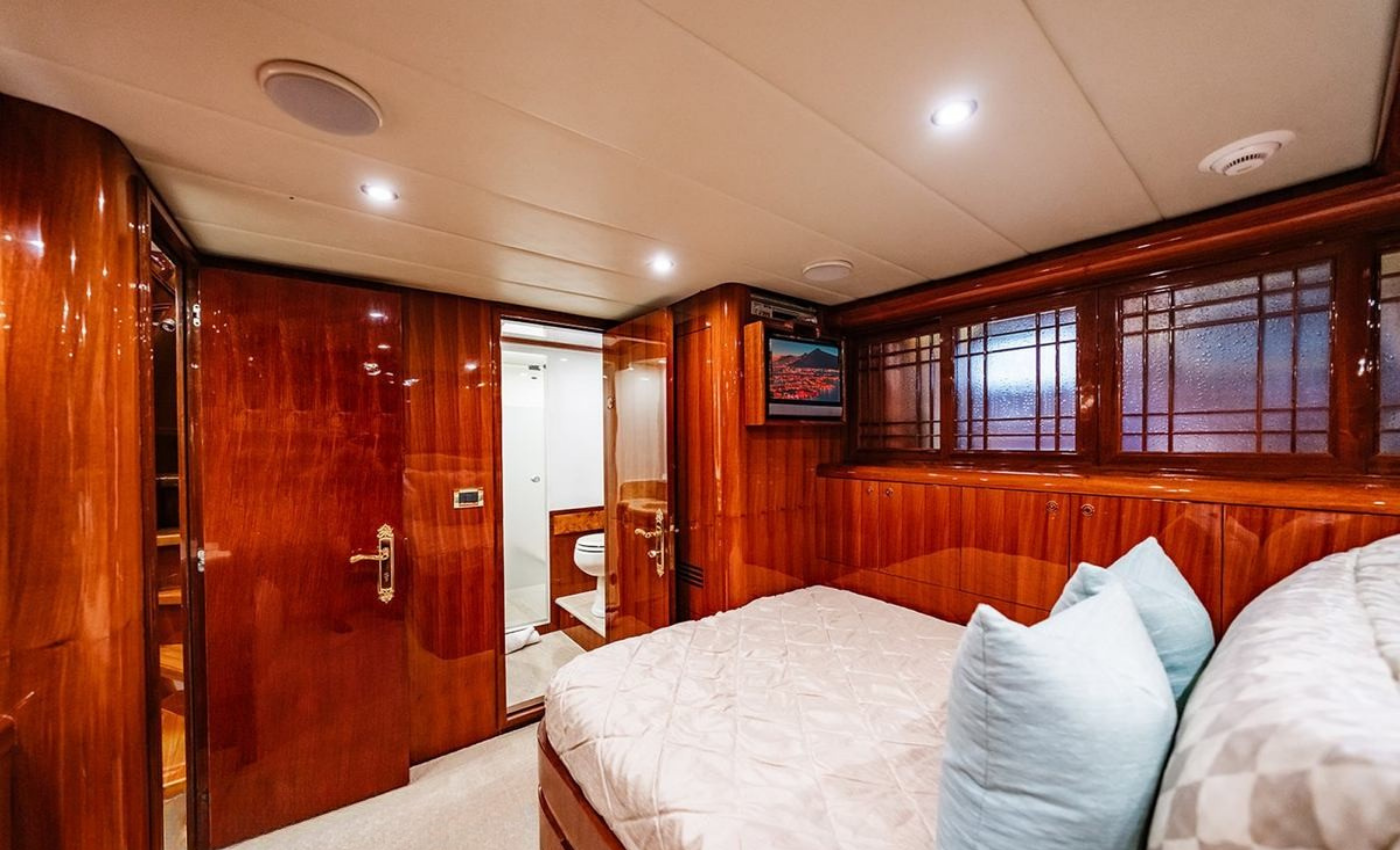 Master King (Owner) Cabin, main deck, forward. His‑and‑hers En‑suite heads with a dual‑access shower between. VIP King Cabin, lower deck (Forward Below). Large En‑suite VIP head with marble vanity and shower. Double Guest Cabin, lower deck, starboard side. En‑suite head. Twin Guest Cabin, lower deck, port side. En‑suite head.