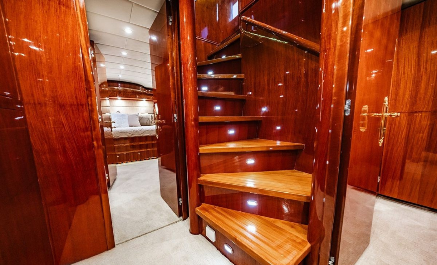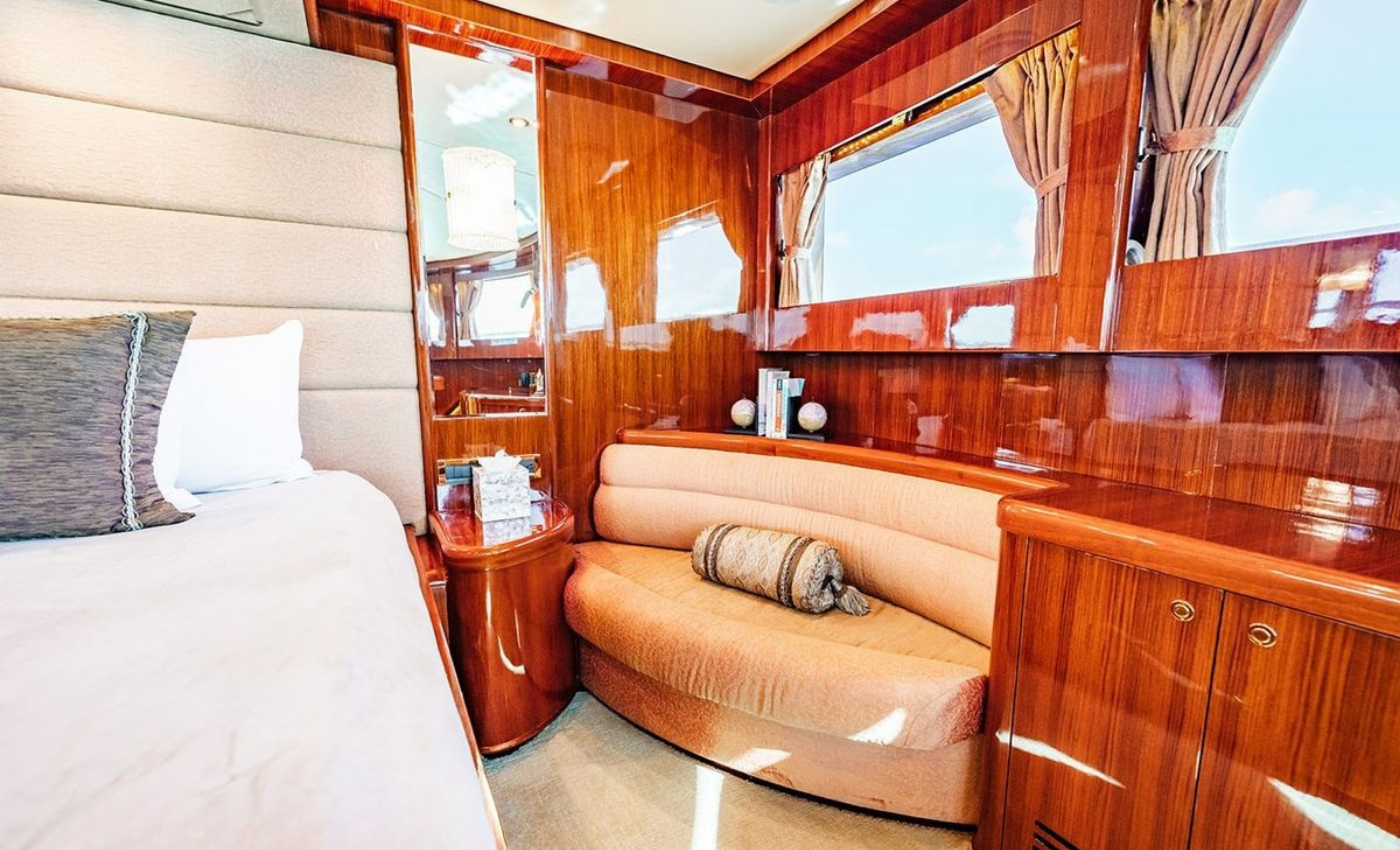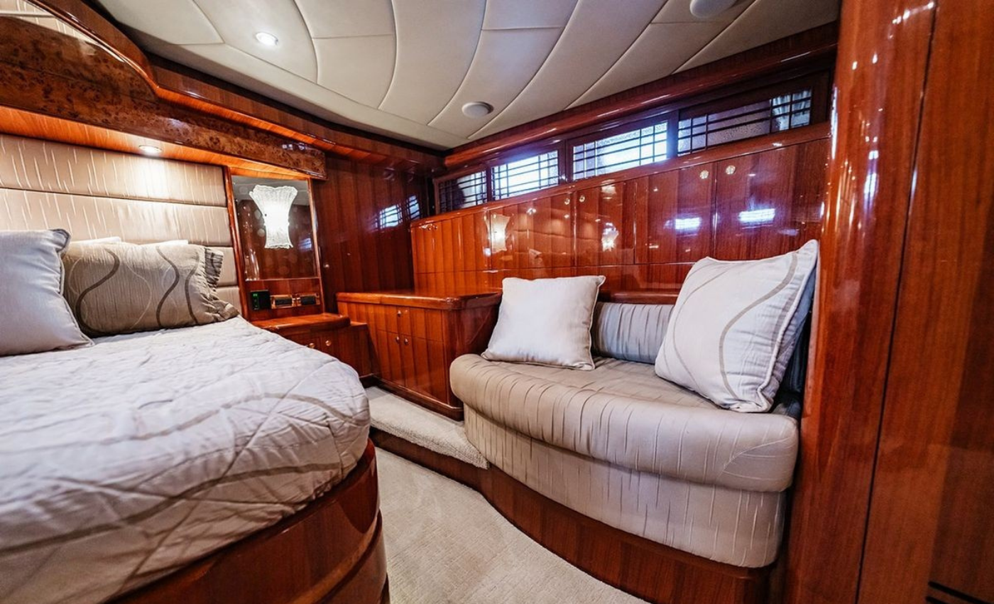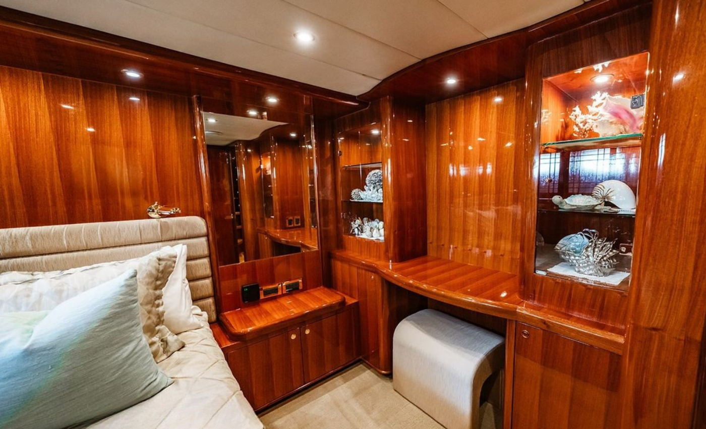 Master King (Owner) Cabin, main deck, forward. His‑and‑hers En‑suite heads with a dual‑access shower between. VIP King Cabin, lower deck (Forward Below). Large En‑suite VIP head with marble vanity and shower. Double Guest Cabin, lower deck, starboard side. En‑suite head. Twin Guest Cabin, lower deck, port side. En‑suite head.