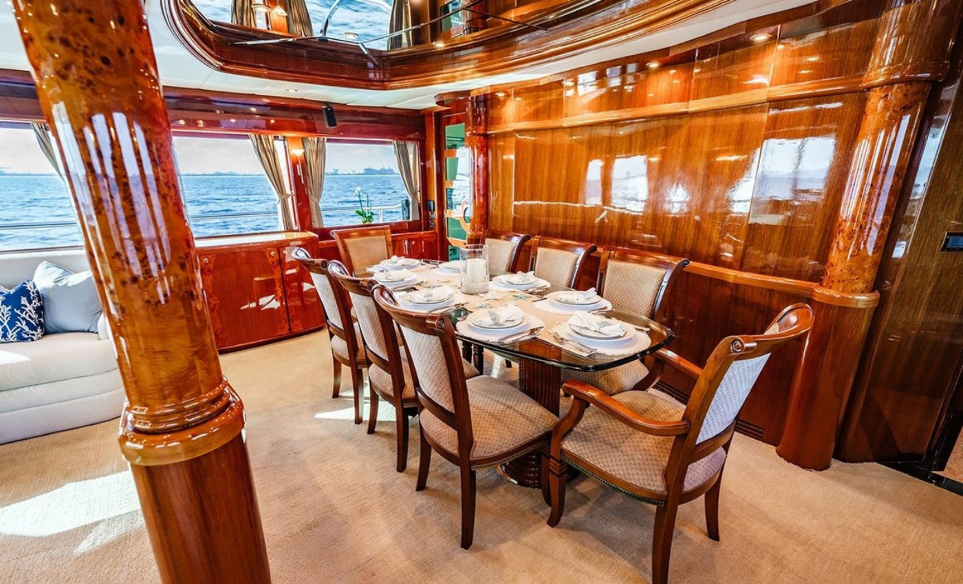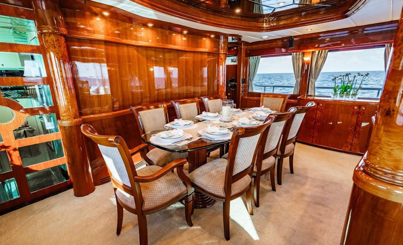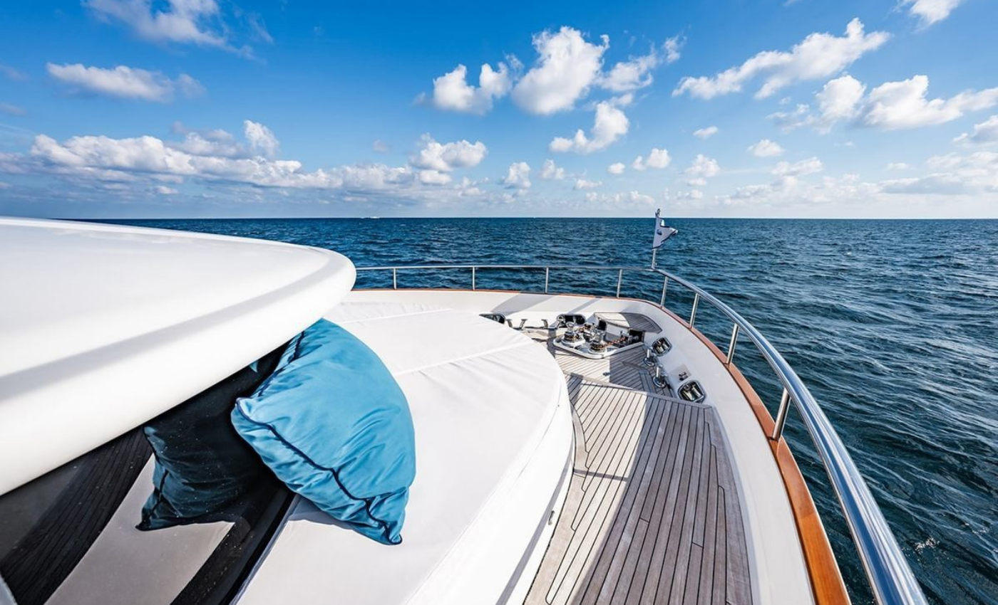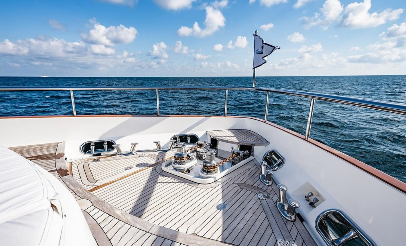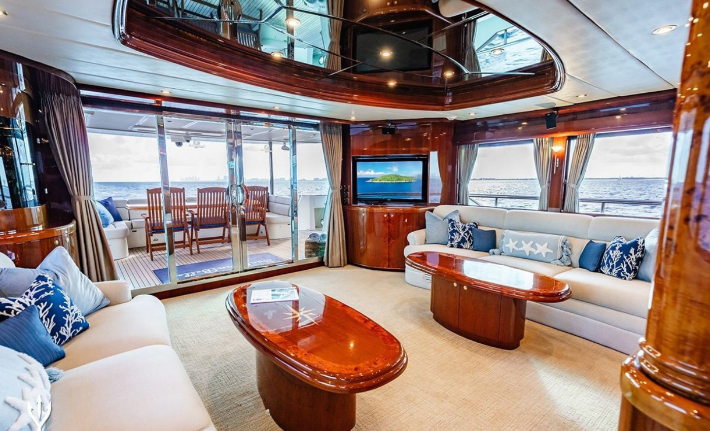 Master King (Owner) Cabin, main deck, forward. His‑and‑hers En‑suite heads with a dual‑access shower between. VIP King Cabin, lower deck (Forward Below). Large En‑suite VIP head with marble vanity and shower. Double Guest Cabin, lower deck, starboard side. En‑suite head. Twin Guest Cabin, lower deck, port side. En‑suite head.
