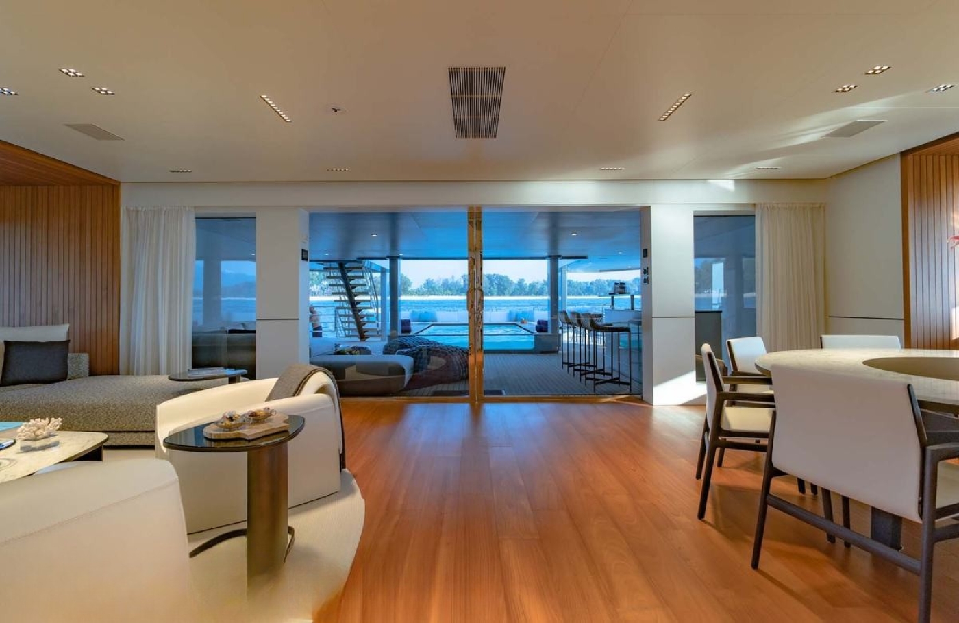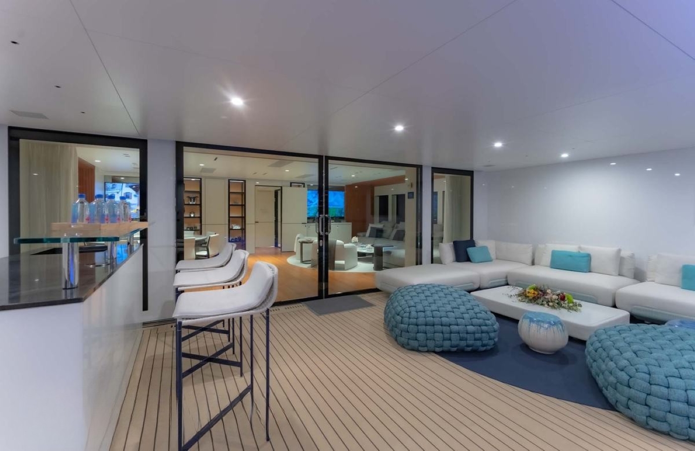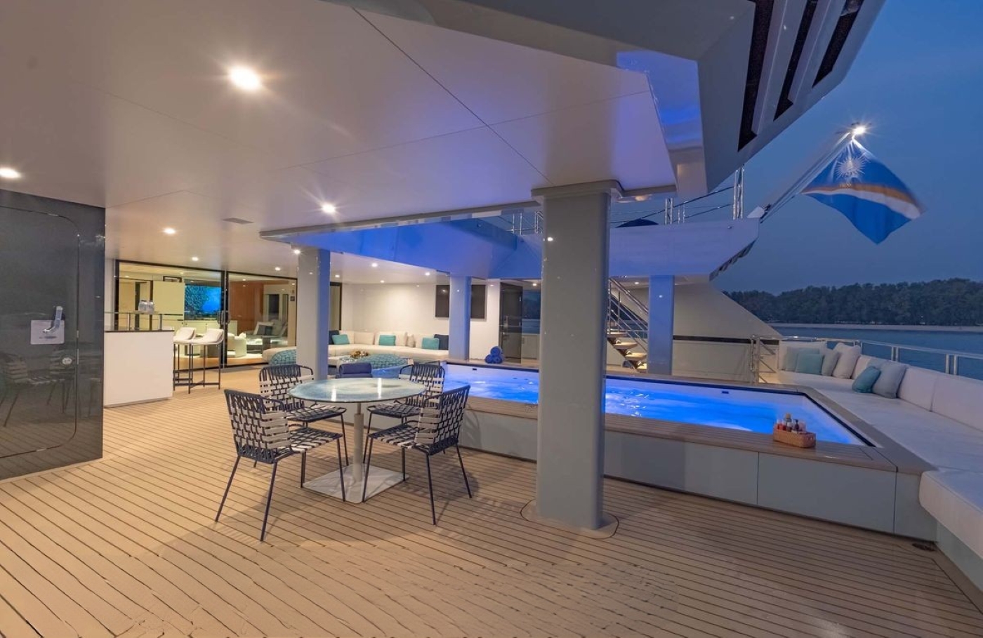 This yacht was built with exceptional spaces on board, to offer great areas for entertainment and relaxation. She has a large 575 square metre exterior space as well as 300 square metres of interior areas. Some of the main features of this innovative catamaran include the on deck pool or the large storage area.