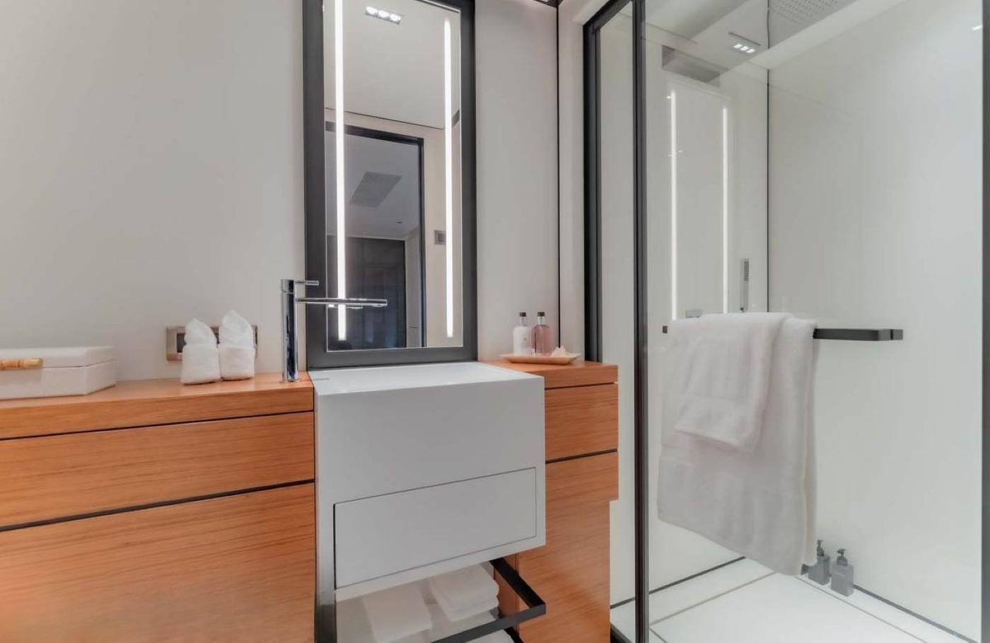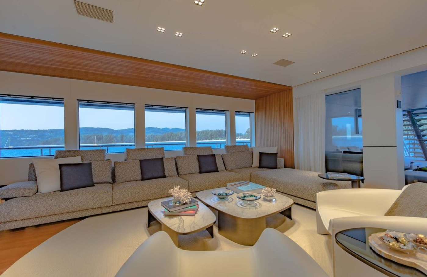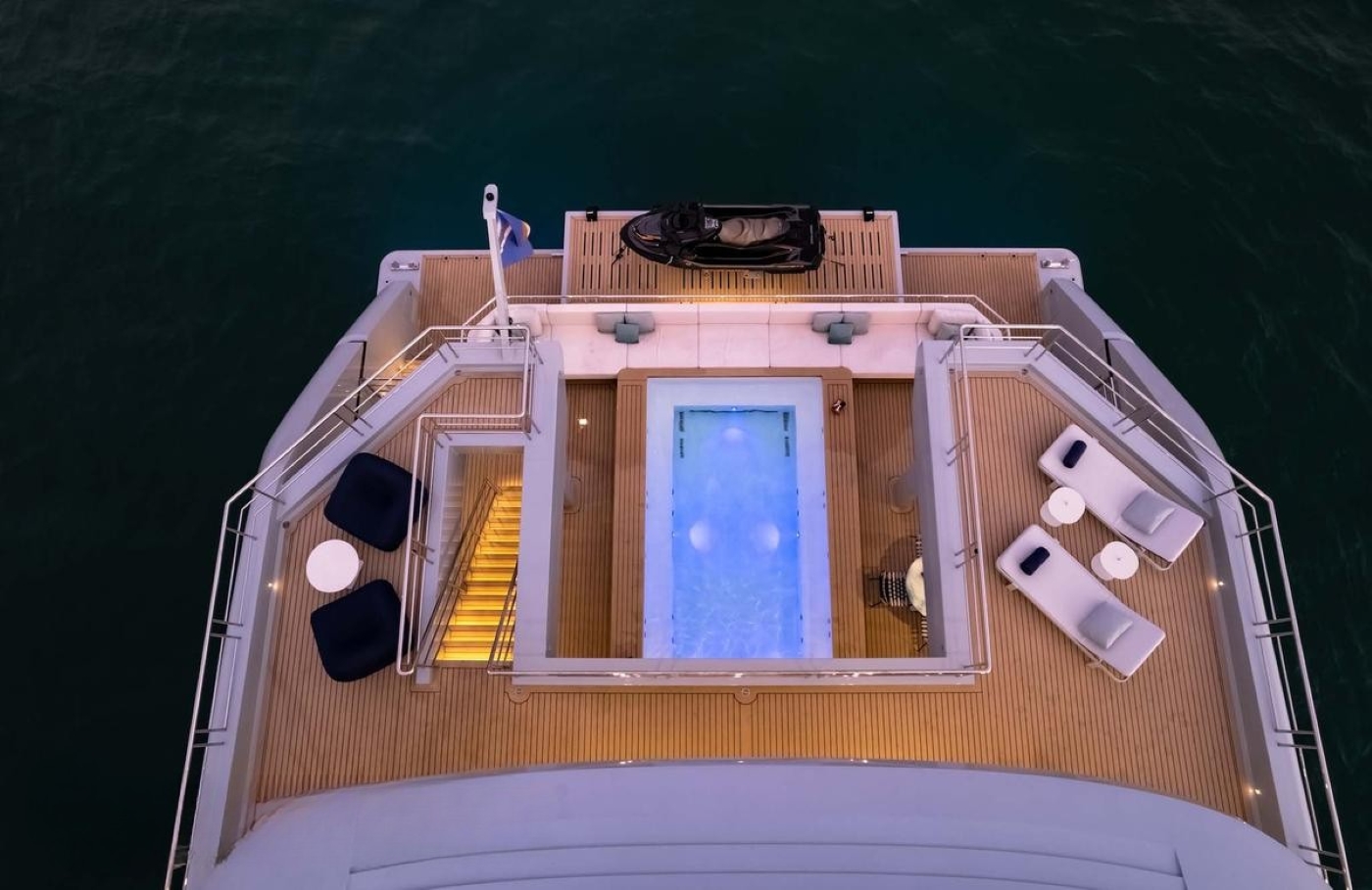 This yacht was built with exceptional spaces on board, to offer great areas for entertainment and relaxation. She has a large 575 square metre exterior space as well as 300 square metres of interior areas. Some of the main features of this innovative catamaran include the on deck pool or the large storage area.